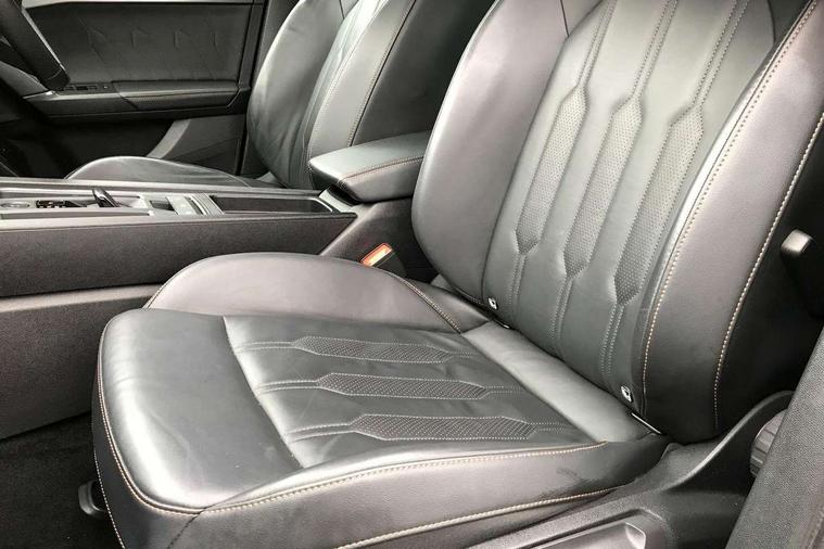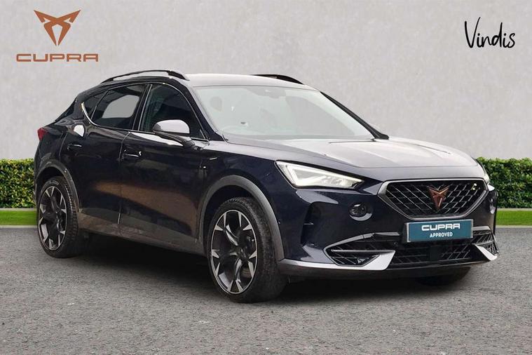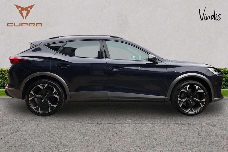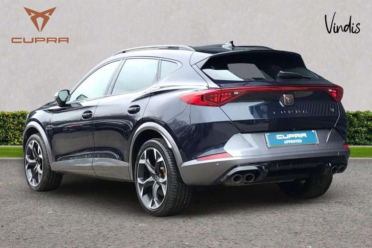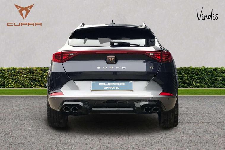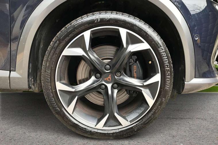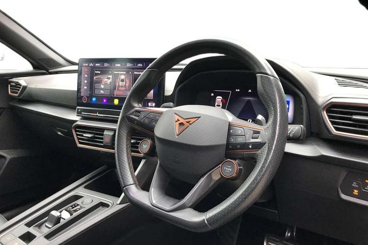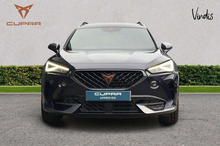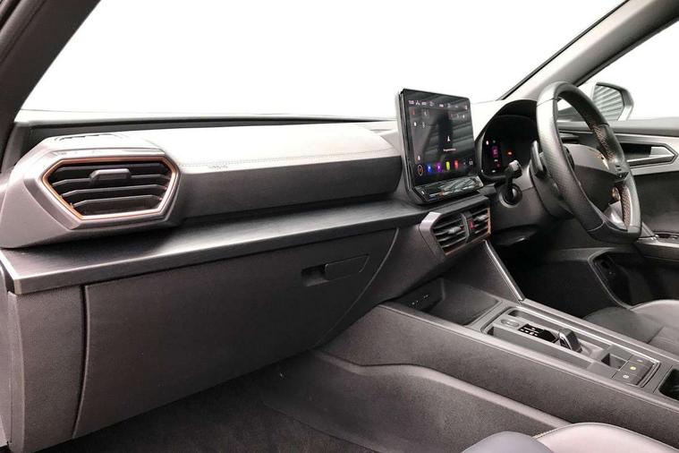 Digital cockpit and configurable dashboard, Driver alert system, Dynamic chassis control with driving profile selection (Comfort, Sport, CUPRA, Individual), E-call, Forward collision warning with automatic braking, Lane assist, Navigation system with 12'' Touchscreen Display, Park assist (inc front/rear parking sensors), Predictive adaptive cruise control with speed limiter, Rear view camera, RPM, trip computer, outside temp gauge, instrument light brightness, low fuel warning light, lights on reminder, gearshift indicator, Service interval indicator, Speed sensitive power steering, Start/stop system with regenerative braking, Virtual pedal and electric tailgate, Voice control system, Wireless apple carplay, Wireless phone charger, Electronic locking differential and dynamic traction support, Sports suspension with front shock absoption, 2 front and 2 rear USB type C sockets, Auxiliary input socket, DAB radio, Auto dimming rear view mirror, Body colour door handles, Body coloured bumpers, Dark grey wing mirror, Daytime running light with automatic headlight control and coming home feature, Dynamic headlight range control, Electric front/rear windows, Electrically adjustable heated and folding door mirrors with memory function, Front fog lamps with cornering function, Gloss black roof rails and window surrounds, LED Headlights, LED Taillights with dynamic indicator, Rain sensing wipers, Rear diffuser with twin exhaust pipe on each side, Rear side wing doors, Rear wash/wipe, Sports bumpers, Third brake light, Tinted rear windows, VZ logo rear badging, Welcome lights, 12v power supply in centre console, 12V socket, 12v socket in loadspace, 2 front and 2 rear reading lights, 230V socket, 3 seat bench in 2nd row, 60/40 split rear bench seat with armrest and mechanical seat release, Black headlining, Cupra sports pedals, Dust/pollen filter, Front and rear head restraints, Front centre armrest, Height/reach adjust steering wheel, Illuminated interior front door sills, Illuminated sunvisor with mirror, Isofix, Leather heated multi-function sports steering wheel with start stop, CUPRA mode button and gear shift paddles, Luggage tie-down hooks, Single front passenger seat, Three zone climate control with control panel in rear, Variable luggage/load compartment floor, Wraparound lighting, Genuine Nappa leather Pack - Cupra, Safety and driving pack (XL) - Formentor, 3 point seatbelts on all rear seats, ABS, Brake control system - ESC and brake booster, Child proof door locks, Driver and front passenger airbags with front passenger airbag de-activation, Electronic parking brake, Front and rear disc brakes, Front side curtain airbags, Hill hold control, Seat belt reminder for front and rear seats, Tyre pressure monitoring system, Anti theft alarm system, Keyless entry and start system (KESSY), Locking wheel bolts, Copper and aluminium interior detailing, 19" 'Exclusive' machined sport matte black and silver alloy wheels, Space saver spare wheel,
