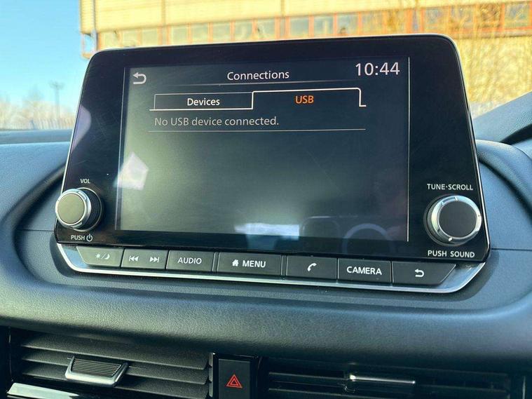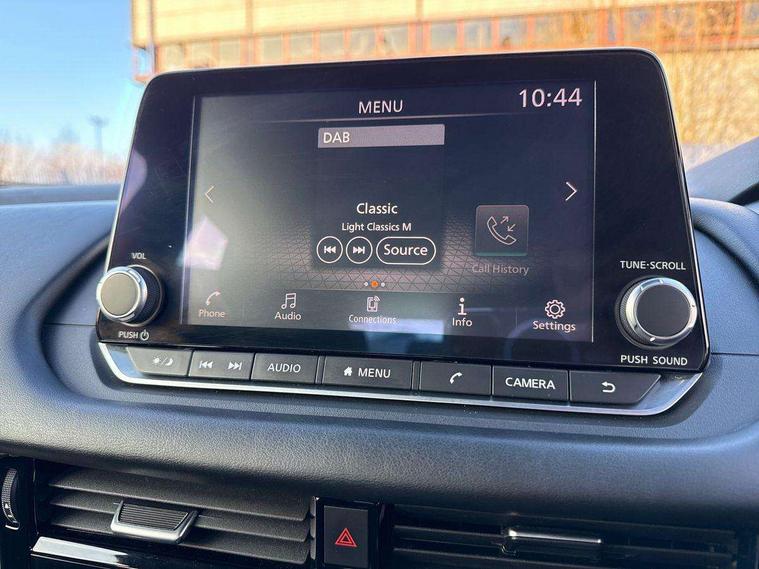 7" High definition full colour TFT screen combimeter, Android auto/Apple CarPlay (Wired), Blind spot warning, Drive modes (sport, normal, eco), Electric speed sensitive power steering, Emergency and breakdown call, Idle stop/start system, Intelligent Cruise control (ICC), Intelligent driver alert system, Intelligent forward collision warning, Intelligent lane intervention, Lane departure prevention, Lane departure warning system, Maximum speed limiter, Nissan connect 8" touchscreen infotainment system, Push button starter, Rear cross traffic alert, Rear parking sensors, Rear view camera, Traffic sign recognition with legal speed adjustment, Trip computer, 6 speakers, AM/FM audio system with DAB, Bluetooth audio streaming, Front USB connections (Type-A and Type-C), Auto dimming rear view mirror, Auto rear wiper when reversing, Automatic hazard signal with emergency stop signal, Body colour mirror caps, Body coloured door handles, Bodyside mouldings, Chrome side window finisher, Door handle with button, Electric auto folding door mirrors, Electrically adjustable and heated door mirrors with LED turn indicator, Follow me home headlights, High beam assist, Intelligent auto headlights, LED daytime running lights, LED Headlights, LED rear lights, One touch front and rear electric windows with remote opening and closing, Partially body coloured bumpers, Rear reversing light (bulb lighting), Rear roof spoiler, Rear side wing doors, Shark fin antenna, Splash free rain sensing wipers, Three blink turn signal, 12v power socket in dashboard and luggage, 2x Rear coat hooks, 3 bench rear seats in 2nd row, 3 rear headrests, 4 folding assist grip, 6-way manually adjustable driver's seat, 60/40 split folding rear seat bench, Centre console storage tray, Chrome interior door handles, Cloth monoform upholstery, Driver and front passenger sunvisors with illuminated vanity mirrors, Driver seat back pocket, Dual zone automatic climate control with pollen filter, Electrically adjustable lumbar support for driver, Front and rear door storage, Front centre console and armrest, Front cupholders x 2, Front door with bottle holders, Glovebox with light, Hard trunk cover, Height adjustable driver's seat, Height adjustable front headrests, Height adjustable passenger seat, Leather steering wheel, Luggage space lighting, Manually adjustable passenger (slide recline + lifter), Multifunction steering wheel, Passenger seat back pocket, Rear armrest with 2 cupholders, Rear door bottle holders, Single front passenger seat, Steering wheel gearshift paddles, Steering wheel switches, Sunglasses holder, Tilt/telescopic adjustable steering wheel, Two rear isofix child seat anchorage points with top tether, 3x3 point rear seatbelt pretensioners + load limiters, ABS with EBD and brake assist, Active brake limited slip, Auto hold function, Child locks on rear doors, Curtain and front side, far side airbags, Driver and passenger airbags, Driver, passenger and 2nd row rear seat belt reminder, Electronic parking brake, Front seatbelt pretensioners + load limiters, Height adjustable front seatbelts, Hill start assist, Intelligent blind spot intervention, Intelligent front emergency braking with pedestrian, cyclist recognition and junction assist, Intelligent rear automatic braking, Tyre pressure monitoring system, Vehicle dynamic control, Capless fuel filler, Engine immobiliser, Intelligent Key, Remote central door locking with deadlocking, Thatcham Cat.1 alarm, Interior instrumental panel A finisher, 17" Alloy wheels, Tyre puncture repair kit,
