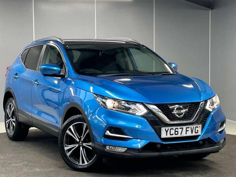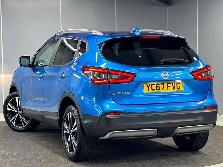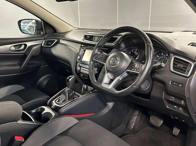 5" TFT driver information centre, Around View Monitor, Bluetooth phone integration system, Cruise control, Electric speed sensitive power steering, Front and rear parking sensors, Lane departure warning system, Nissan connect sat nav system, Outside temperature display, Push button starter, Rear view camera, Service interval indicator, Speed limiter, Traffic sign recognition, Trip computer, 'Shark fin' mobile antenna, 6 speakers, DAB Digital radio, Radio/CD, Smartphone apps, Steering wheel mounted audio controls, USB/aux input socket, Automatic headlamp activation, Body colour bumpers, Body colour door handles, Body colour door mirrors, Chrome window surround, Electric folding and heated door mirrors, High beam assist, Interior mirror with auto anti dazzle, LED indicators in door mirrors, Matt silver roof rails, One touch electric front/rear windows, Privacy glass, Rain sensor windscreen wipers, Rear roof spoiler, Rear wiper, 2 X front 12v power sockets, 60/40 split folding rear seat, Ambient interior lighting, Centre console with armrest, Chrome interior door handles, Cloth upholstery, Configurable luggage board system, Driver + front passenger lumbar support, Dual zone climate control, Front and rear door pockets with bottle holders, Front headrests, Front seat belt pre-tensioners with load limiters, Height adjustable driver's seat, Height adjustable passenger seat, Illuminated electric window switch, Isofix child seat preparation, Leather gearknob, Leather interior door handles, Leather knee rest, Leather steering wheel, Luggage compartment lighting, Parcel shelf, Pollen filter, Rake/reach adjustable steering wheel, Rear headrests, ABS, brake assist and EBD, Child locks on rear doors, Curtain airbags, Driver/front passenger airbag, Electronic parking brake, ESP + traction control, Forward emergency braking, Front passenger airbag deactivation, Height adjustable front seatbelts, Hill start assist, Seatbelt warning, Side airbags, Three 3 point rear seatbelts, Tyre pressure monitoring system, Alarm, Immobiliser, Intelligent Key, Remote central locking, Piano black interior trim, 18" Bi-colour alloy wheels, Tyre puncture repair kit,