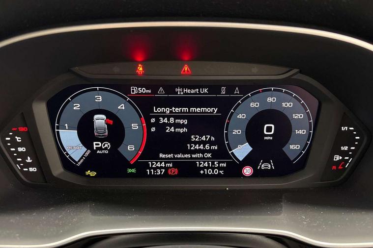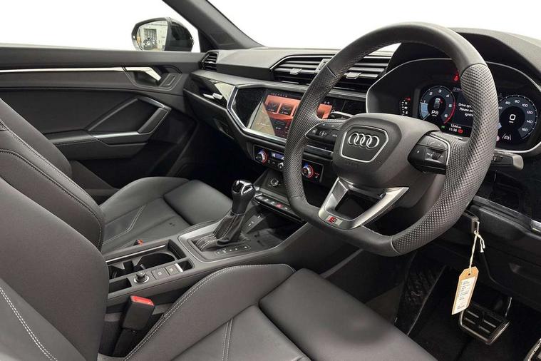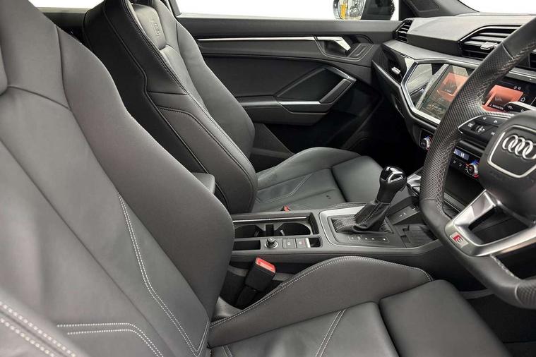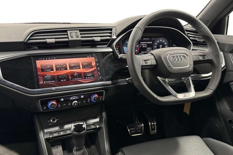 Audi connect safety and service, Audi drive select, Audi lane departure warning, Audi Virtual Cockpit - 10.25" display, Bluetooth interface, Camera based traffic sign recognition, Distraction and Fatigue warning, Legal emergency call, MMI Navigation Plus with high resolution 10.1 inch touchscreen colour display, Power operated tailgate, Progressive steering, Service interval indicator, Smartphone interface includes wireless Apple carplay/Android Auto, Start stop system with recuperation, Voice control system with natural language interaction, Diesel particulate filter, Sports suspension, 2 USB-C ports with charge and data functions, 6 passive loudspeakers, DAB digital radio module, Acoustic windscreen, Audi Beam uses LEDs to project the Audi logo onto the ground as you exit your Q3, Auto dimming door mirrors, Auto dimming frameless rear view mirror, Electrically folding, adjustable and heated door mirrors with integrated LED side indicators and kerb view function for passenger side, Front and rear electric windows, Front fog lights, Front underbody protection in manhattan grey paint finish, High gloss black finish B and C pillars, Honeycomb design radiator grille in matt anthracite black, LED Dynamic rear indicators, LED headlights with LED daytime running lights, LED rear lights, LED third brake light, Privacy glass dark tinted rear and rear-side windows (from B-pillar backwards), Rain and light sensors, Rear diffuser grille in grained matt black, Rear diffuser strip in matt anthracite black, Rear side wing doors, Rear underbody protection in matt black, Rear wiper, S line front and rear bumpers and side skirts in contrasting Manhattan grey paint finish, Variable front intermittent wipers, 12V socket in rear centre console, 3 seat bench in 2nd row, 40:20:40 folding with manual adjustment for 60:40 forwards/backwards position and backrest angle, Adjustable rear seat bench/backrest with centre armrest and cupholder, Black carpet mats, Black cloth headlining, Dual zone electronic climate control, Electric lumbar support, Front and rear black floor mats with contrast stitching in rock grey, Front and rear headrests, Front centre armrest, Height and reach adjustable steering wheel, Illuminated door sill trims with S logo, ISOFIX child seat mounting for front passenger with airbag deactivation and outer rear seat including top tether attachment point for outer rear seats, Luggage compartment sill protection in stainless steel, Manual front seats with height adjustment, Perforated leather gearknob, Single front passenger seat, Stainless steel pedals, Twin leather upholstery with front sport seats + S embossing, Black styling pack - Q3, Non smoking pack - Q3, 3x3 point rear seatbelts, 6 airbags - Driver, front passenger, curtain and side windows, Audi pre-sense front with pedestrain and cyclist recognition, Electrically operated child locks on rear doors, Electromechanical parking brake, Electronic stabilisation control including ABS, ASR and EDL, Front seatbelt reminder, Hill descent control, Hill hold assist, Pre sense basic, Seatbelt monitoring, Tyre pressure warning, Warning triangle and first aid kit, Anti theft wheel bolts, Immobiliser, Remote central locking, Thatcham approved category 1 anti theft alarm, Aluminium look interior elements, Detail dashboard around MMI touch colour display in glass look, black with surround in aluminium look, Leatherette door armrest, Piano black inlay,