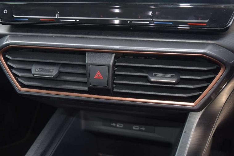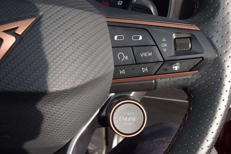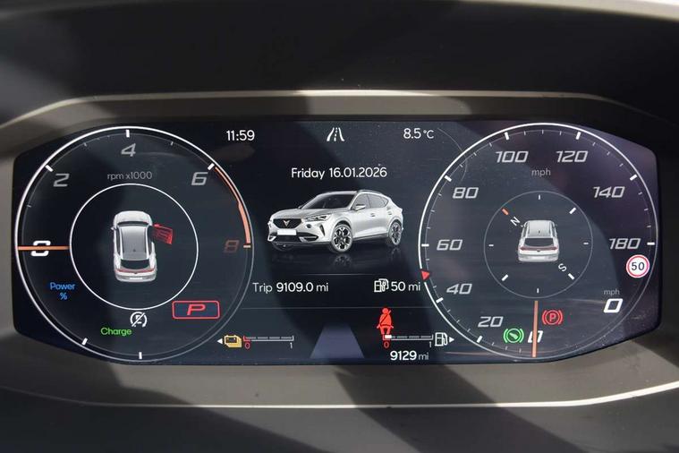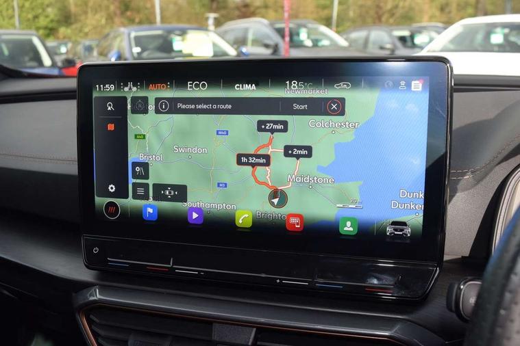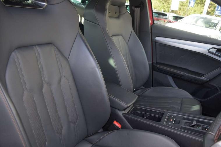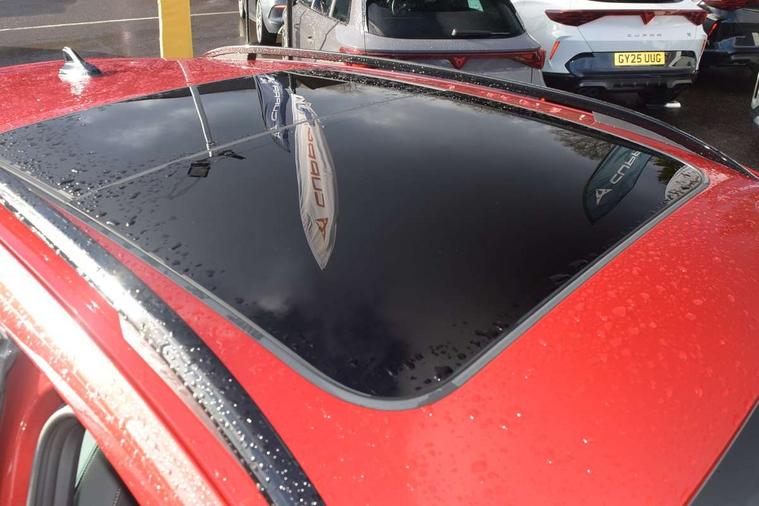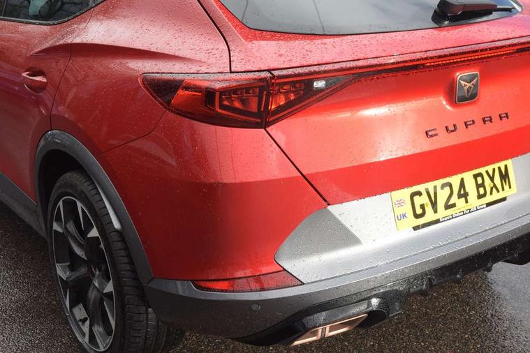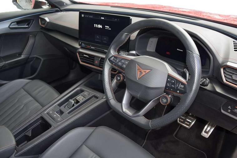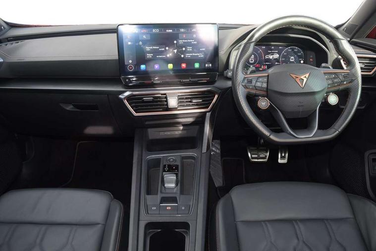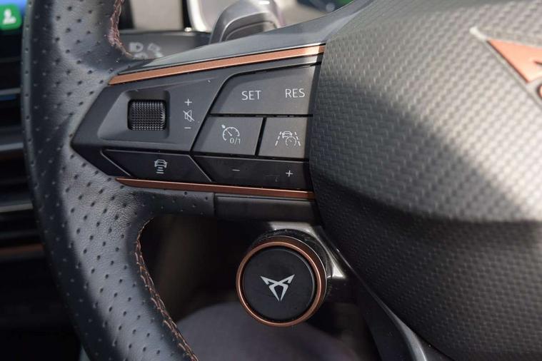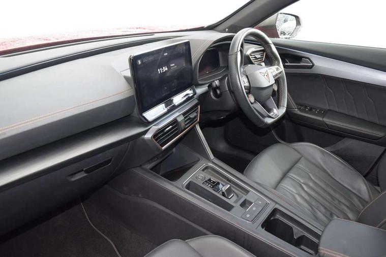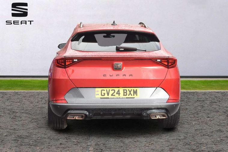 Digital cockpit and configurable dashboard, Driver alert system, Dynamic chassis control with driving profile selection (Comfort, Sport, CUPRA, Individual), Forward collision warning with automatic braking, Lane assist, Navigation system with 12'' Touchscreen Display, Park assist (inc front/rear parking sensors), Predictive adaptive cruise control with speed limiter, RPM, trip computer, outside temp gauge, instrument light brightness, low fuel warning light, lights on reminder, gearshift indicator, Service interval indicator, Speed sensitive power steering, Start/stop system with regenerative braking, Virtual pedal and electric tailgate, Voice control system, Wired Android Auto, Wireless apple carplay, Wireless phone charger, 10 amp mode 2 charging cable, 16 amp mode 3 charging cable, 3.6 kw On-board charger, Electronic locking differential and dynamic traction support, Sports suspension with front shock absoption, 2 front and 2 rear USB type C sockets, Auxiliary input socket, DAB radio, Auto dimming rear view mirror, Body colour door handles, Body coloured bumpers, Dark grey wing mirror, Daytime running light with automatic headlight control and coming home feature, Dynamic headlight range control, Electric front/rear windows, Electrically adjustable heated and folding door mirrors with memory function, Front fog lamps with cornering function, Gloss black roof rails and window surrounds, LED Headlights, LED Taillights with dynamic indicator, Rain sensing wipers, Rear diffuser with twin exhaust pipe on each side with simulated exhausts, Rear side wing doors, Rear wash/wipe, Sports bumpers, Third brake light, Tinted rear windows, Welcome lights, 12v power supply in centre console, 12V socket, 12v socket in loadspace, 2 front and 2 rear reading lights, 230V socket, 3 seat bench in 2nd row, 60/40 split rear bench seat with armrest and mechanical seat release, Black headlining, Cupra sports pedals, Dust/pollen filter, Front and rear head restraints, Front centre armrest, Height/reach adjust steering wheel, Illuminated interior front door sills, Illuminated sunvisor with mirror, Isofix, Leather heated multi-function sports steering wheel with start stop, CUPRA mode button and gear shift paddles, Luggage tie-down hooks, Single front passenger seat, Three zone climate control with control panel in rear, Wraparound lighting, Genuine Nappa leather Pack - Cupra, Safety and driving pack (XL) - Formentor, 3 point seatbelts on all rear seats, ABS, Brake control system - ESC and brake booster, Child proof door locks, Driver and front passenger airbags with front passenger airbag de-activation, Electronic parking brake, Front and rear disc brakes, Front side curtain airbags, Hill hold control, Public e-call, Seat belt reminder for front and rear seats, Tyre pressure monitoring system, Anti theft alarm system, Keyless entry and start system (KESSY), Locking wheel bolts, Copper and aluminium interior detailing, 19" 'Exclusive' machined sport matte black and silver alloy wheels, Tyre repair kit,