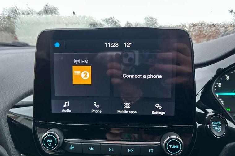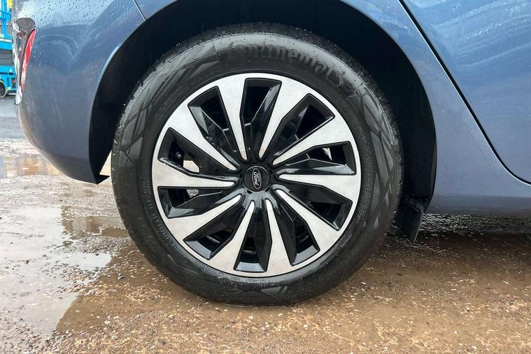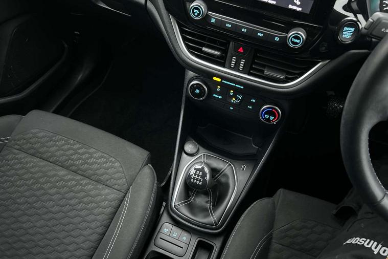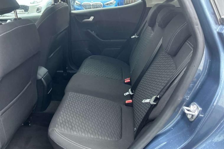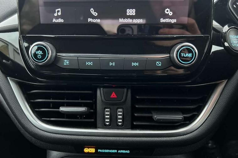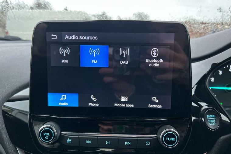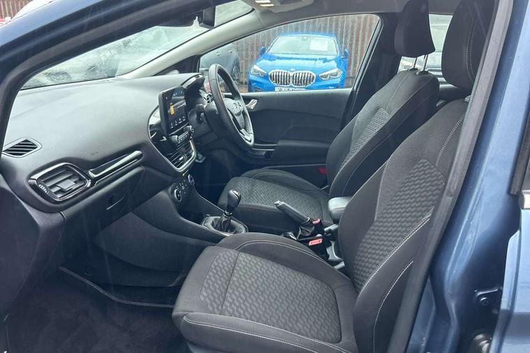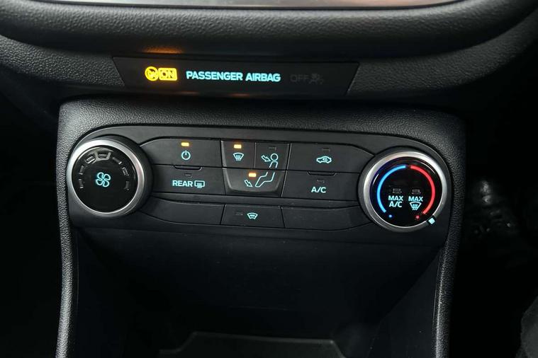 Bluetooth system, Electric power steering, Ford easy fuel, Ford SYNC 3 Navigation system incl 8" touchscreen, 7 speakers, FordPass connect, Apple carplay, android auto, voice control and emergency assistance, Rear parking distance sensors, Selectable drive modes (Normal, Sport, Track), Trip computer, 2 USB ports, Auxiliary input socket, DAB Digital radio, Steering wheel mounted controls, Body colour bumpers, Body colour door handles, Body colour rear spoiler, Body coloured electrically operated and heated door mirrors with side indicators, Chrome beltline trim, Chrome front grille, Chrome lower window surround, Cornering front fog lights, Electric front windows/one touch facility, Electric rear windows, Quickclear heated windscreen, Rain sensing wipers and auto dimming rear view mirror, Rear privacy glass, Rear wiper, 3 spoke leather trimmed steering wheel with audio control, 60/40 split folding rear seat, Adjustable head restraints, Boot carpet, Centre console with opening armrest, 2x cupholders, 12v and USB, Chrome inner door handles, Cloth upholstery, Footwell illumination, Front floor mats in velour, Front map reading lights, Front seat and rear pockets, Illuminated glovebox, Leather gaiter, Load area light, Luxury woven headliner, Manual 2 way passenger seat adjust, Manual 4-way driver seat adjust, Manual air conditioning, Overhead console with sunglasses holder, Pollen filter, Rake/reach adjustable steering wheel, Sensico wrapped steering wheel, NCAP Pack - Fiesta, 3 point seatbelts on all rear seats, ABS+EBA, Curtain airbags, Driver and passenger airbags, Drivers knee airbag, Electronic stability control with hill start assist, Front passenger airbag deactivation, Front side airbags, Seatbelt warning, Two tone horn, Tyre pressure monitoring system, Keyless start with 'Ford Power' starter button, MyKey system, Remote central locking & engine immobiliser, Thatcham Cat.1 alarm, 16" 10 spoke alloy wheels,