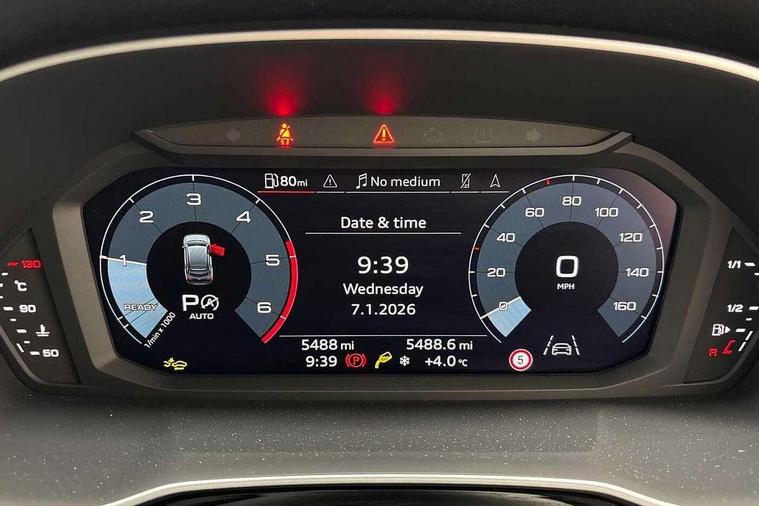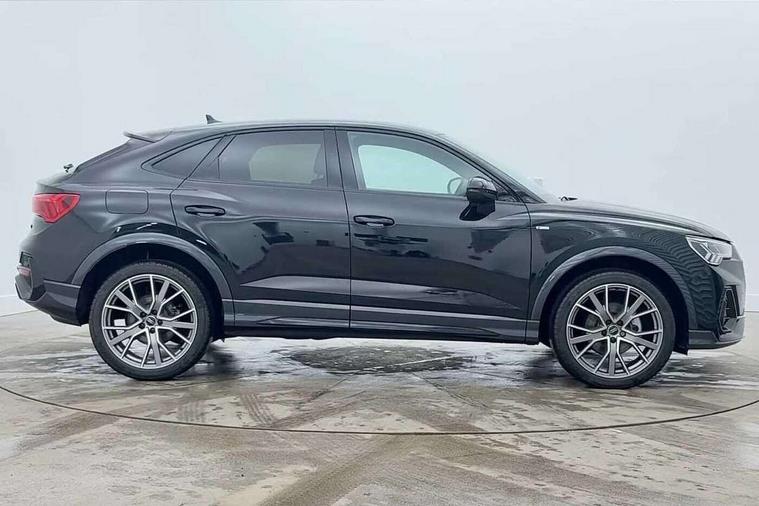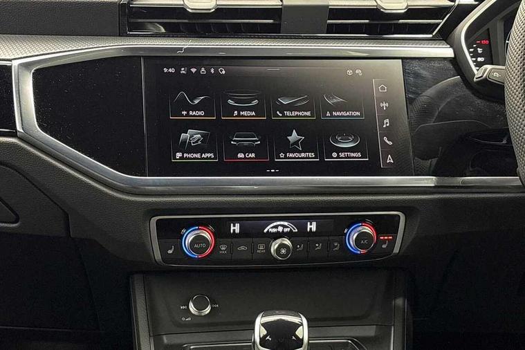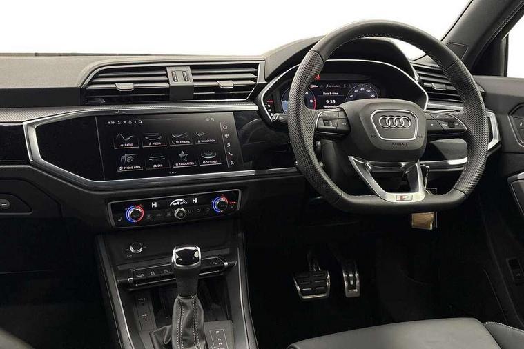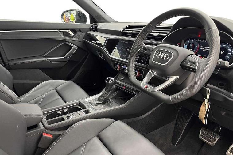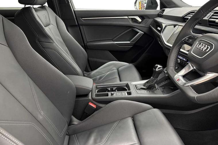 Audi connect safety and service, Audi drive select, Audi lane departure warning, Audi Virtual Cockpit - 10.25" display, Bluetooth interface, Camera based traffic sign recognition, Distraction and Fatigue warning, Legal emergency call, MMI Navigation Plus with high resolution 10.1 inch touchscreen colour display, Power operated tailgate, Progressive steering, Service interval indicator, Smartphone interface includes wireless Apple carplay/Android Auto, Start stop system with recuperation, Voice control system with natural language interaction, Diesel particulate filter, Sports suspension, 2 USB-C ports with charge and data functions, 6 passive loudspeakers, DAB digital radio module, Acoustic windscreen, Audi Beam uses LEDs to project the Audi logo onto the ground as you exit your Q3, Auto dimming door mirrors, Auto dimming frameless rear view mirror, Electrically folding, adjustable and heated door mirrors with integrated LED side indicators and kerb view function for passenger side, Front and rear electric windows, Front fog lights, Front underbody protection in manhattan grey paint finish, High gloss black finish B and C pillars, Honeycomb design radiator grille in matt anthracite black, LED Dynamic rear indicators, LED headlights with LED daytime running lights, LED rear lights, LED third brake light, Privacy glass dark tinted rear and rear-side windows (from B-pillar backwards), Rain and light sensors, Rear diffuser grille in grained matt black, Rear diffuser strip in matt anthracite black, Rear side wing doors, Rear underbody protection in matt black, Rear wiper, S line front and rear bumpers and side skirts in contrasting Manhattan grey paint finish, Variable front intermittent wipers, 12V socket in rear centre console, 3 seat bench in 2nd row, 40:20:40 folding with manual adjustment for 60:40 forwards/backwards position and backrest angle, Adjustable rear seat bench/backrest with centre armrest and cupholder, Black carpet mats, Black cloth headlining, Dual zone electronic climate control, Electric lumbar support, Front and rear black floor mats with contrast stitching in rock grey, Front and rear headrests, Front centre armrest, Height and reach adjustable steering wheel, Illuminated door sill trims with S logo, ISOFIX child seat mounting for front passenger with airbag deactivation and outer rear seat including top tether attachment point for outer rear seats, Luggage compartment sill protection in stainless steel, Manual front seats with height adjustment, Perforated leather gearknob, Single front passenger seat, Stainless steel pedals, Twin leather upholstery with front sport seats + S embossing, Black styling pack - Q3, Non smoking pack - Q3, 3x3 point rear seatbelts, 6 airbags - Driver, front passenger, curtain and side windows, Audi pre-sense front with pedestrain and cyclist recognition, Electrically operated child locks on rear doors, Electromechanical parking brake, Electronic stabilisation control including ABS, ASR and EDL, Front seatbelt reminder, Hill descent control, Hill hold assist, Pre sense basic, Seatbelt monitoring, Tyre pressure warning, Warning triangle and first aid kit, Anti theft wheel bolts, Immobiliser, Remote central locking, Thatcham approved category 1 anti theft alarm, Aluminium look interior elements, Detail dashboard around MMI touch colour display in glass look, black with surround in aluminium look, Leatherette door armrest, Piano black inlay,