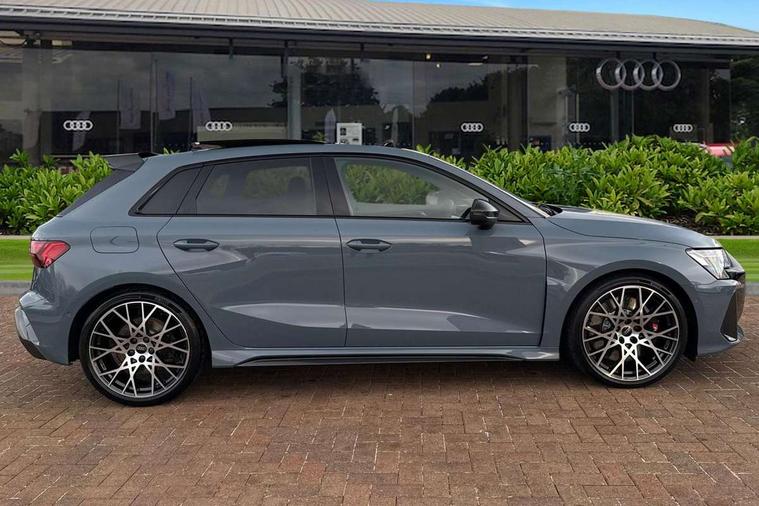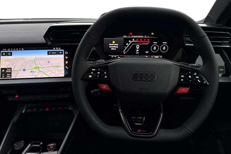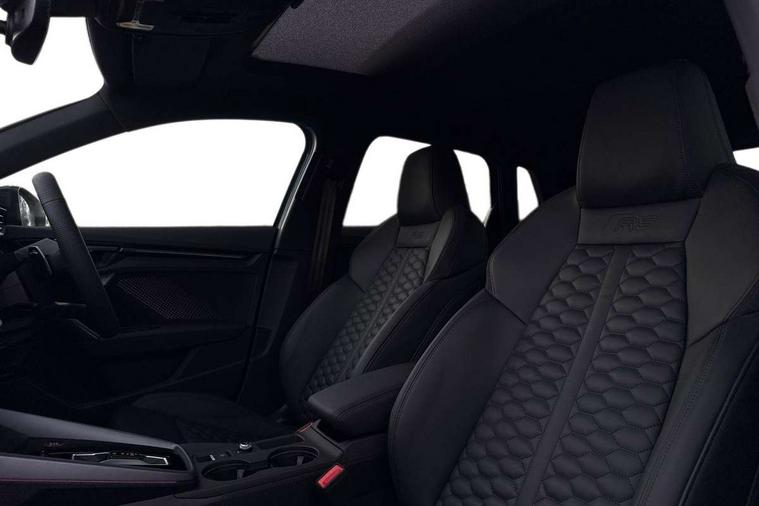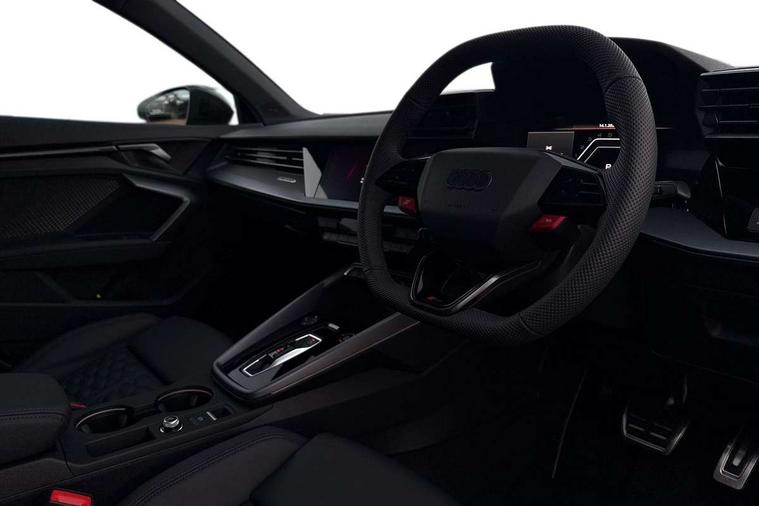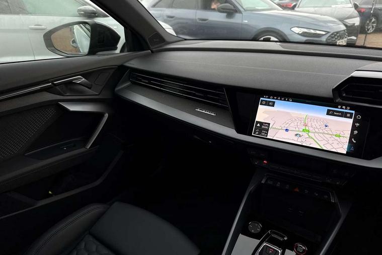 Adjustable speed limiter, Audi drive select comfort, auto, dynamic and efficiency, Audi smartphone interface with app store includes wireless Apple carplay, Android auto and Amazon alexa integration, Audi virtual cockpit plus with RS specific design and 12.3" display with additional graphic display options, Automatic start/stop system with recuperation, Bluetooth interface, Camera based traffic sign recognition, Collision avoidance assistant, Distraction and Fatigue warning, e-Call (emergency call), Lane departure warning system, MMI Navigation Plus with high resolution 10.1" colour touch screen display, Park Assist with parking system Plus, Progressive steering, RS specific driving modes - RS Individual, RS Performance and RS Torque rear, Voice control system with natural language interaction, Adaptive suspension with audi drive select, Increase of top speed to 174 mph, Quattro permanent four wheel drive, Audi Phonebox light with wireless charging, DAB Digital radio, USB ports with charging function in the rear, Audi beam LED projection of RS logo on ground as you exit, Auto dimming frameless rear view mirror, Automatic dynamic range control, Carbon door mirror housings, Carbon fibre engine cover, Dipped beam, main beam, position light and turning light, Electrically adjustable/heated/folding/auto dimming door mirrors with integrated LED indications + kerb view function for passenger side, Exterior model badging, Front electric windows, Heat insulating glass windscreen, LED 3rd brake light, LED brake lights, LED daytime running x3, LED rear number plate lights, LED reverse light, LED tail lights, Light and rain sensors, Privacy glass - dark tinted rear window, rear door and side windows, Rear electric windows, Rear side wing doors, Rear wiper, Roof edge spoiler in carbon, RS dual branch exhaust system with two chrome plated oval tailpipe trims, 12V socket and storage compartment in front centre console, 3 seat bench in 2nd row, 3 Spoke flat top and bottomed black leather multi function steering and gear shift paddles, 3-zone deluxe automatic air conditioning, 40/20/40 split folding rear seat bench, Black cloth headlining, Front and rear headrests, Front centre armrest, Front door sill trims with RS 3 logo, Front sports seats RS embossed logo, Front/rear floor mats, Heated front seats, Height and reach adjustable steering wheel, Manual boot compartment lid, Rear centre armrest with cupholder, Seat side bolsters, Single front passenger seat, Stainless steel pedals and front footrest in black, Vanadium look - Interior door handles, Door trim, power latching, Air vents, window controls, mirror adjust, rear door lock, Selector lever in centre console, Black Styling plus package - RS3, Extended ambient lighting package Pro with Multi-coloured contour lighting of instrument panel - RS3, RS exterior features pack in carbon and gloss black - RS3, RS sport suspension pack - RS3, Storage package - RS3 Sportback, 3x3 point rear seat belts, Driver and front passenger airbag with passenger airbag deactivation, Electronic Stabilisation Control (ESC) including ABS, ASR and EDL, First aid kit with warning triangle and 2 safety vests, Hill hold assist, Pre-sense front with pedestrian and cyclist detection, RS steel brakes, Seatbelt monitoring, Tyre pressure loss indicator, Anti theft alarm, Anti-theft wheel bolts, Electronically operated child locks, Inlays in carbon atlas structure, Tyre repair kit,