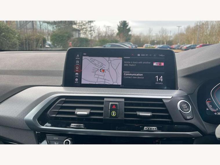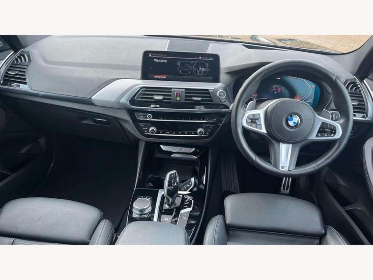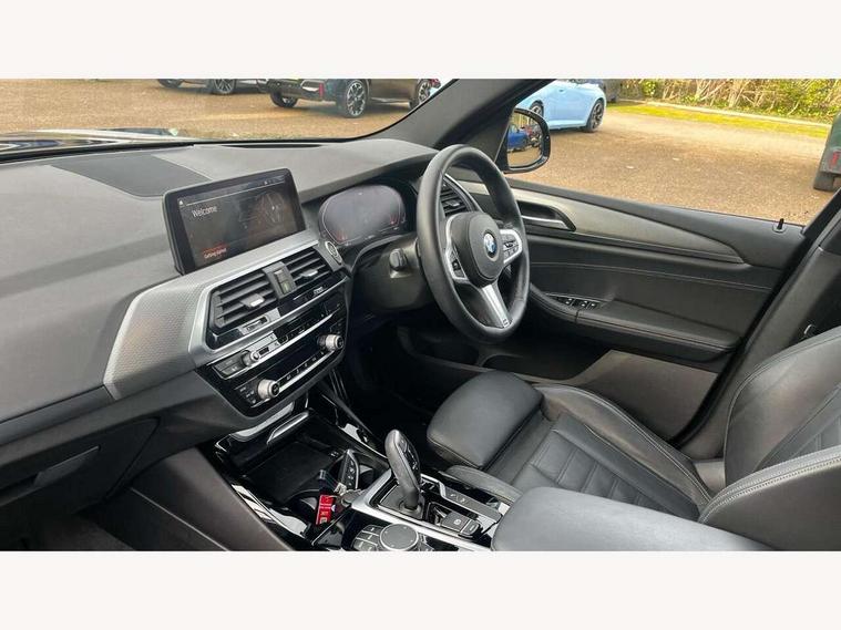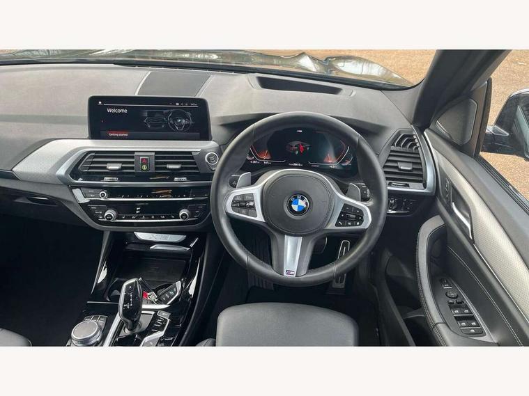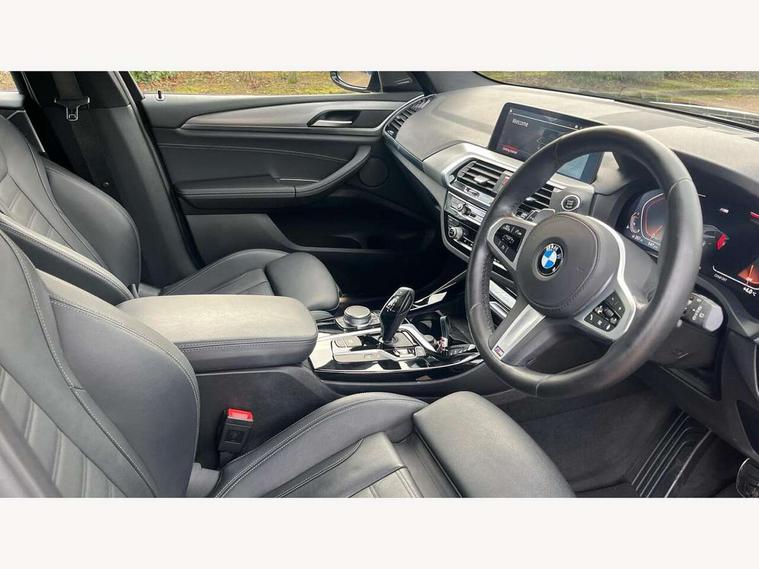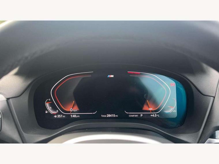 Attentiveness assist, Automatic tailgate operation, BMW Live Cockpit Professional sat nav system including 10.25" high resolution display and Intelligent Voice Assistant, BMW Online services, BMW Teleservices, Brake pad wear indicator in front and rear, Check Control warning system for monitoring of lights and door/luggage compartment open warning, Control display - 6.5" colour display screen, Electric Power Steering (EPS) with Servotronic, iDrive Controller with 8 favourite buttons, Lights on warning by audio warning signal when ignition is switched off, Navigation system - BMW Professional multimedia with Hard disc drive (HDD) and 10.25" touch display, Oil sensor for level and grade, warning by check control system, On board computer - average speed+fuel consumption, service interval, clock/date, odometer/trip meter, outside temperature display and ice warning, Optimum shift indicator, Personal Profile - automatic lock when driving away selectable, Semi digital instrument cluster, Stop/start system, Automatic transmission with gearshift paddles, Drive performance control with ECO PRO comfort + sport mode, Incorrect fuelling protection, M sport suspension, Multi-link rear suspension, Performance Control, Auxiliary socket for external MP3 player, BMW professional radio/CD/MP3, DAB Digital radio, Acoustic glazing, Black finish on B pillars, Body colour door handles, Body colour electric adjust heated aspherical door mirrors, Body colour roof mouldings, Body coloured bumpers, Chrome kidney grille with high gloss black vertical slats, Direction indicator, side repeaters, integrated in exterior mirrors, Dual chrome exhaust, Dynamic brake lights, Exterior mirrors - electrically folding with anti-dazzle, Fingertip control / anti-trap function on electric window, Follow me home headlights, Front and rear bumper system with replaceable deformation elements, Front and rear electric windows, Green tinted heat insulating glass, Heated windscreen washer jets, Height adjustable headlamps, High gloss black door sill finishers, High gloss black shadow line roof rails, High gloss shadowline exterior trim in decorative moulding side frame/recess cover/guide rail/B, C pillars/mirror frame and triangle with mirror base, High level 3rd brake light incorporating LED Technology, Interior rear view electrochromatic mirror with automatic anti dazzle function, LED front fog lights, LED tail lights, Lightweight engineering, M aerodynamic bodystyling, Model designation, Rain sensor including auto headlights activation, Rear wiper, Shark fin antenna, Side exterior M designation badges, Visible VIN plate, Welcome lighting, Windscreen wipers with adjustable interval, 12V socket in centre console and luggage area, 3 rear headrests, 3 zone automatic air conditioning, 4 lashing points to secure luggage, Ambient lighting, Anthracite headlining, Anthracite Velour floor mats, Door sill finishers with BMW Individual designation, Driver/passenger sunvisors with ticket holders + illuminated vanity mirrors, Foldable boot floor with storage compartment, Four grab handles integrated in roof lining, Front and rear bottle holders integrated into door trim storage compartments, Front and rear side armrests integrated into door trim, Front centre armrest with storage compartment, Front footwell lights, Front sports seats, Front/rear courtesy lights with soft on/off dimming, Front/rear reading lights, Height adjustable front/rear head restraints, Isofix rear child seat preparation, Leather gear knob, Luggage area underfloor compartment, Luggage compartment lighting, M leather steering wheel, Parcel shelf removeable and storable under boot floor, Reach and rake adjustable steering column, Rear centre armrest with 2 cupholders, Removable / retractable luggage cover, Slope adjustable rear seats, Storage compartment in rear centre console and front/rear door trims, Through loading system with 40/20/40 split folding rear seat, Toolkit located in luggage compartment, Two front cupholders with removable oddments tray/lid, Vernasca leather upholstery, Connected pack professional - X3, ABS/EBD, ADB - Automatic Differential Brake, Automatic Stability Control (ASC), Battery safety cut-off, BMW emergency call, Brake assist, Brake drying, Brake energy regeneration, Braking pre-tensioning, Child locks on rear doors, Cornering brake control (CBC), Crash Sensor - activation of central locking release, hazard warning light and interior lighting, Deactivation of fuel pump in the event of a crash, Driver and front passenger front and side airbags with passenger deactivation and ITS front and rear head airbags, DSC+, Dynamic brake control, Dynamic Traction Control - DTC, Electromechanical parking brake, Front seat belts warning, Hill descent control, Hill start assist, Seatbelt security check for front seats, Side impact protection, Three point seatbelts to all seats with front and outer rear pyrotechnic belt tensioners and seat belt force limiters, Two tone horn, Tyre pressure monitoring system, Ventilated front and rear disc brakes, Warning triangle and first aid kit, Central locking switch for all doors, fuel filler cap and luggage compartment, Electronic engine immobiliser, Locking wheel nuts, Remote control including two integrated key - one button for open/close all lockable content, windows and separate button for open luggage compartment, Remote control Thatcham category 1 alarm, Start/stop button with Comfort Go keyless engine start and auto Start/stop deactivation button, Low rolling resistance tyres,