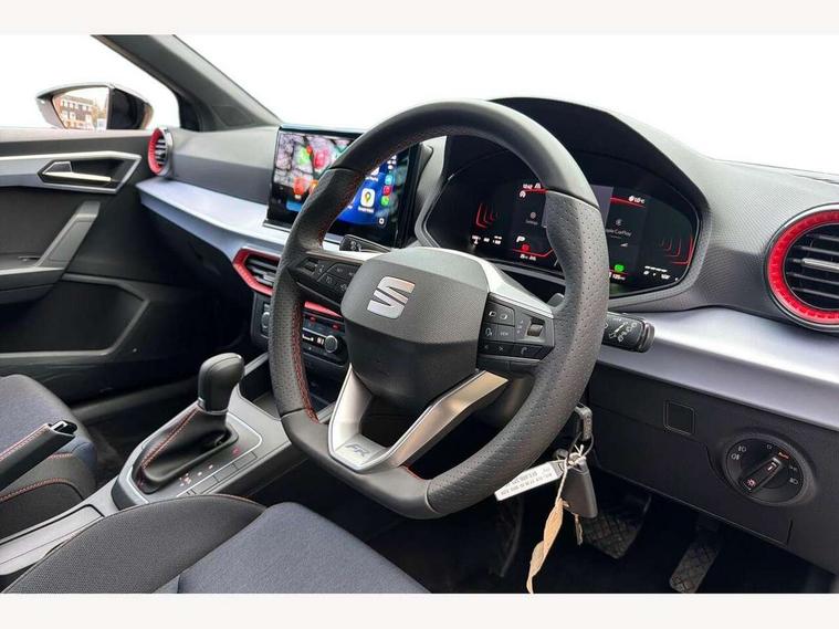 'Lights On' Reminder warning buzzer, 8" Digital cockpit, 9.2" touchscreen navigation system with type C USB socket, Voice control and DAB/AM/FM radio, Auto start and stop system, Bluetooth audio streaming with handsfree system, Digital clock, E-call, Full link smartphone integration with mirror link, wireless apple carplay, Google android auto + USB Type C cable for apple and android devices, Lane assist, Low fuel warning light, Outside temperature gauge, Power Steering, Rear parking sensor, Seat connect plus with safety, service, remote and online, SEAT drive profiles and ECO function, SEAT logo boot release, Speed limiter, Traffic sign recognition, Trip computer, Sports suspension, Auxiliary input socket, Radio/MP3 player, SD card slot, Steering wheel mounted controls, Anti theft roof antenna, Auto dimming rear view mirror, Automatic rain sensing wipers, Black door mirror caps, Body colour bumpers, Body colour door handles, Brilliant black window surrounds, Dark tinted rear windows, Electric adjustable/heated/folding door mirrors, Electric front windows, Electric headlight adjustment, Electric rear windows, Front/rear fog lights, FULL LED automatic headlights with dynamic headlight range control, coming and leaving home, LED daytime running lights, LED 3rd brake light, LED tail lights, Rear roof spoiler with FR twin exhausts, Rear side wing doors, Rear wiper, 3 seat bench in 2nd row, 60/40 split folding rear seat, Ambient interior lighting, Chrome detailing and black headlining, Cloth upholstery, Dual zone climate control with combination filter, Front courtesy lights, Front cupholders x 2, Front reading lights, Gear shift indicator, Glovebox, Height adjustable front and rear headrests (five), Height adjustable front seats, Height/reach adjust steering wheel, Illuminated air vent surrounds, Illuminated boot, Instrument lighting with brightness control, Isofix, Leather multifunction flat bottomed sports steering wheel with gearshift paddles, Passenger sunvisor, Single front passenger seat, Sports seats, Sunvisors with mirror and driver side card holder, Safety and driving pack (S) - Ibiza, 3 point seatbelts on all 3 rear seats, ABS, Active front headrests, Child locks on rear doors, Electronic stability control, Energy recovery system, Front driver and passenger side airbags with curtain airbag and front passenger airbag deactivation, Hill hold control, Multi-Collision braking, Seat belt reminder for front and rear seats, Tiredness recognition system, Tyre pressure monitoring system, Locking wheel bolts, Perimeter alarm and interior monitoring with backup horn and tow away protection, Remote central locking + deadlocks, 17" Alloy wheels in Brilliant silver,