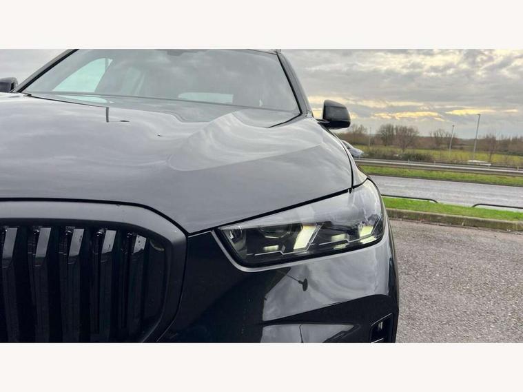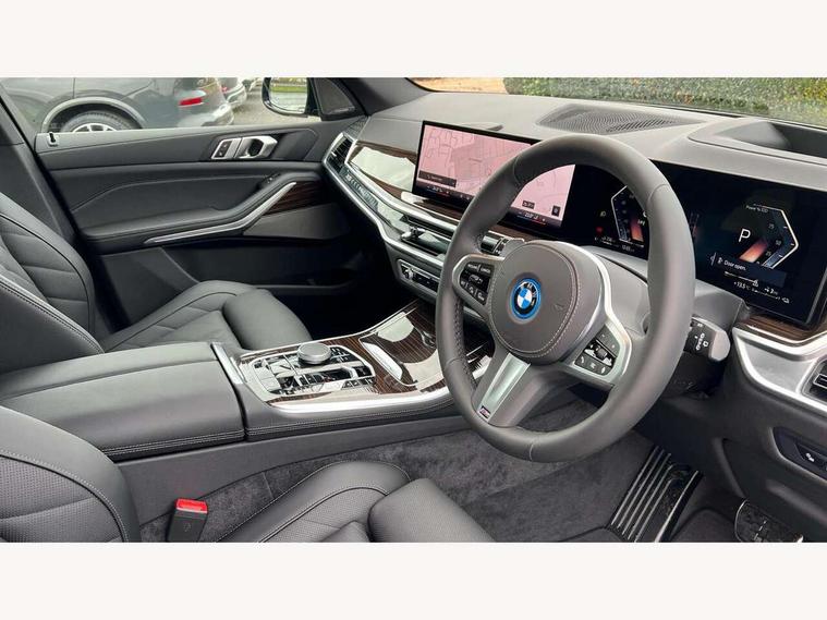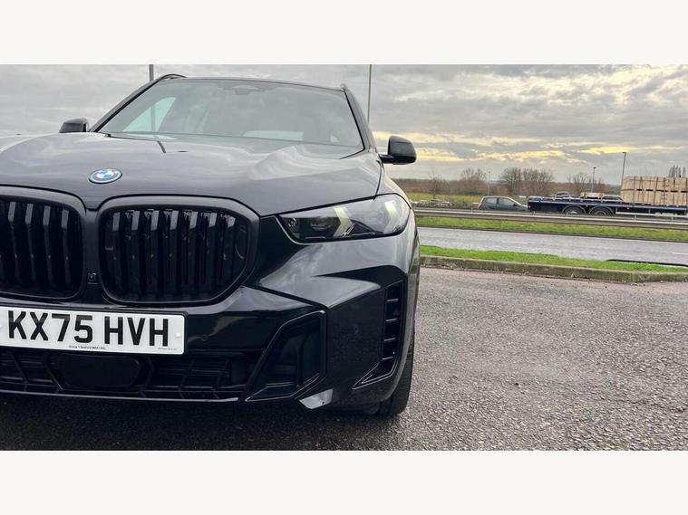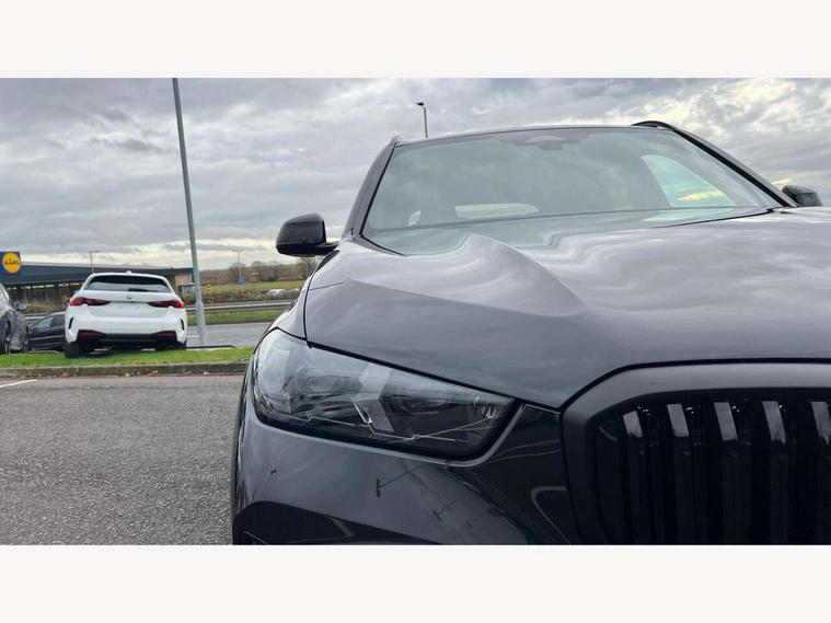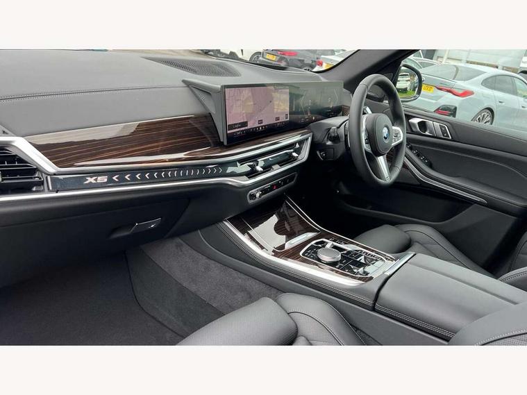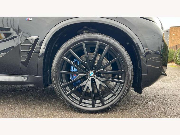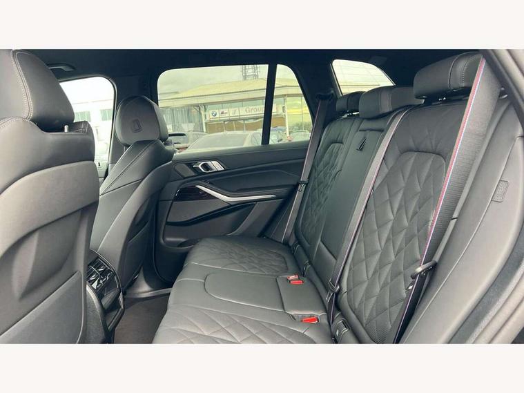 Attentiveness assist, Automatic tailgate operation, BMW ConnectedDrive online services, BMW live cockpit + with curved 12.3 instrument cluster/14.9 central display, nav/Tuner with diversity reception, RDS/4GLTE/remote software upgrade, BMW Teleservices, Condition based service, Cruise control with brake assist, eCall emergency call system, Enhanced bluetooth with wireless charging, Integrated owner's handbook, PAS, Speed limiter, Wi-Fi hotspot, AC Fast charging preparation (Maximum charging power 11kW), Adaptive 2-axle Front and rear air suspension, Drive performance control with ECO PRO comfort + sport mode, Eight speed steptronic sport automatic transmission and gearshift paddles on the steering wheel, Adaptive LED Headlights, Front and rear electric windows, High beam assistant, High gloss black shadow line roof rails, LED daytime running lights, Rain sensor, Rear side wing doors, Third brake light in rear spoiler, Variable intermittent rear wash/wipe, 12V - Power sockets with 2x centre console and 1x luggage compartment, 3 seat bench in 2nd row, Entry sills illuminated BMW inscription front and rear, Foldable rear centre armrest with 2 cupholders and storage compartment, Front and rear side armrest integrated into door trim, Grab handles in 1st and 2nd row of seats with Integrated in headliner, at rear with coat hooks, plastic, Headrests for all seats, Luggage compartment separating net, Lumbar support with height and depth adjustment in backrest, Single front passenger seat, Sunvisors with illuminated vanity mirrors and ticket pocket, Three spoke sport M leather steering wheel, Velour floormats, Ambient light interior pack - X5, Driving assistant pack with radar based driver assistance system - X5, Expanded exterior mirror pack - X5/X5 M, M aerodynamics pack - X5, Parking assistant pack - X5, 3 rear seatbelts, Acoustic protection for pedestrians, Active protection, Airbags - driver/front passenger, rear and side, first and second row seats head airbags, front passenger seat airbag deactivation + knee airbag, Anti-lock braking system (ABS), Automatic Stability Control (ASC), Brake energy regeneration, Cornering brake control (CBC), Crash sensor activating central locking release, hazard warning lights, fuel cut off, interior lighting + activation of safety battery terminal clamp, DSC - Dynamic Stability Control, Dynamic Traction Control - DTC, Electromechanical parking brake with automatic drive away release and auto hold function, Electronic brake force distribution, Hill start assistant, M Sport blue painted brake calipers with 'M' designation, Mechanical child proof lock on rear doors, Tyre pressure monitoring system, Tyre pressure sensors, Ventilated front and rear disc brakes, Warning triangle and first aid kit, Alarm system, Closing system with central locking, Comfort access system, Locking wheel bolts,