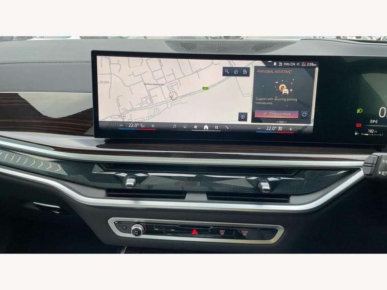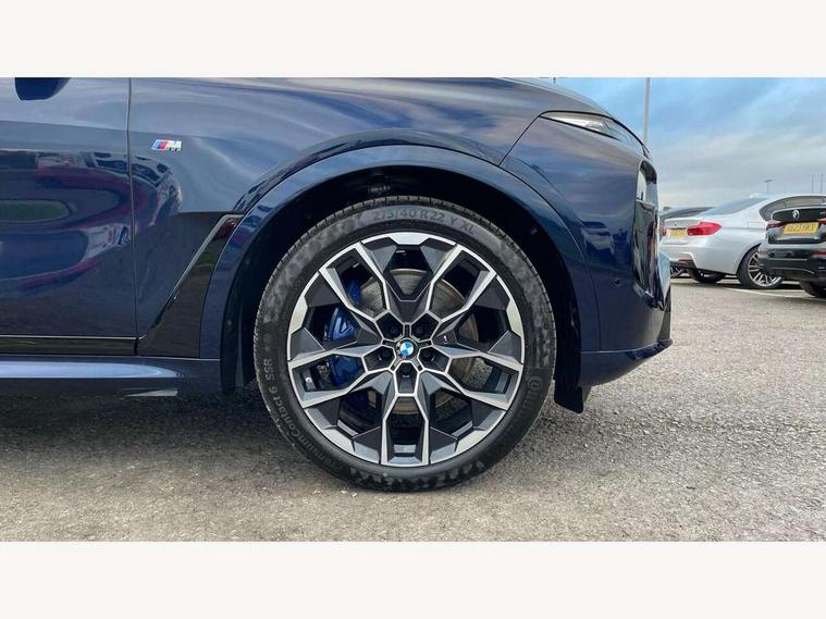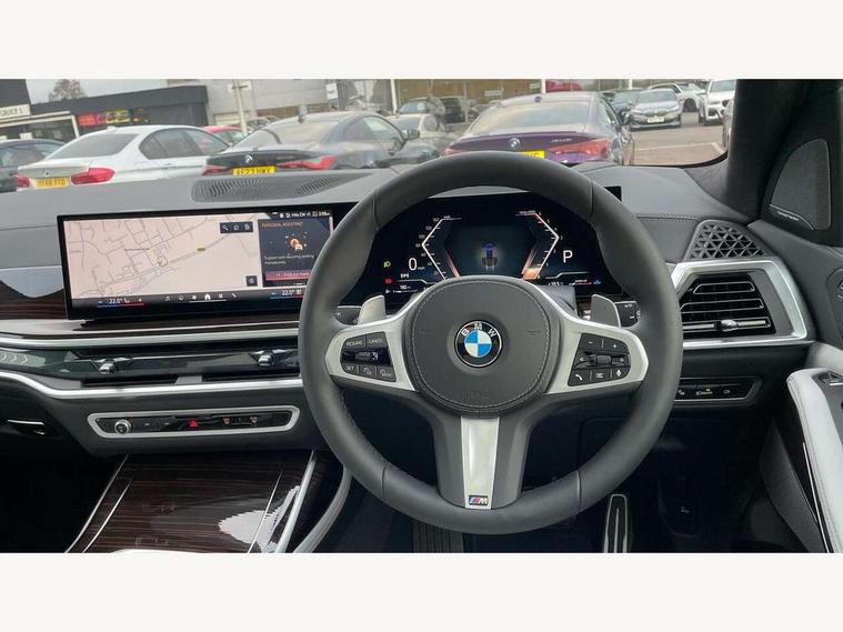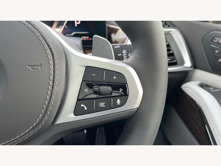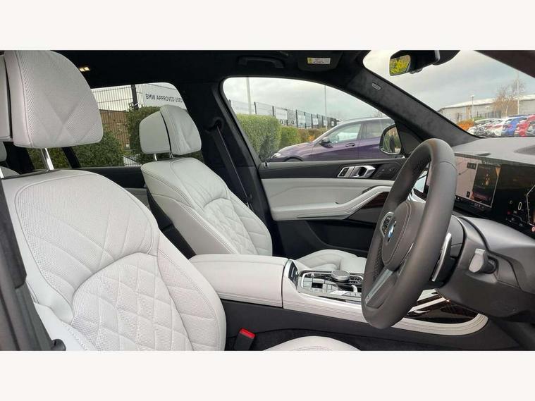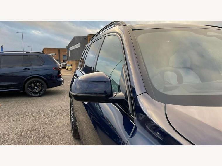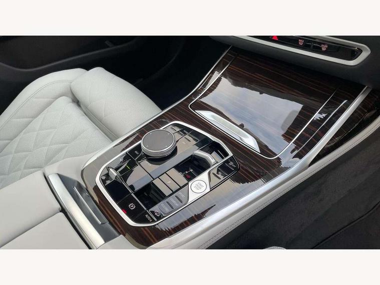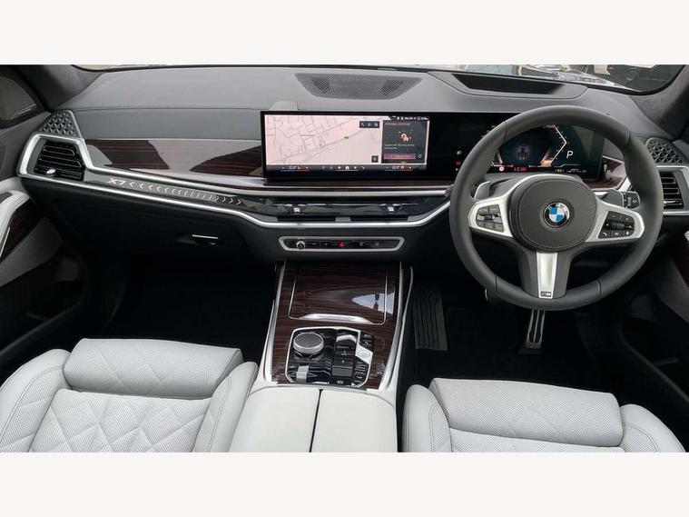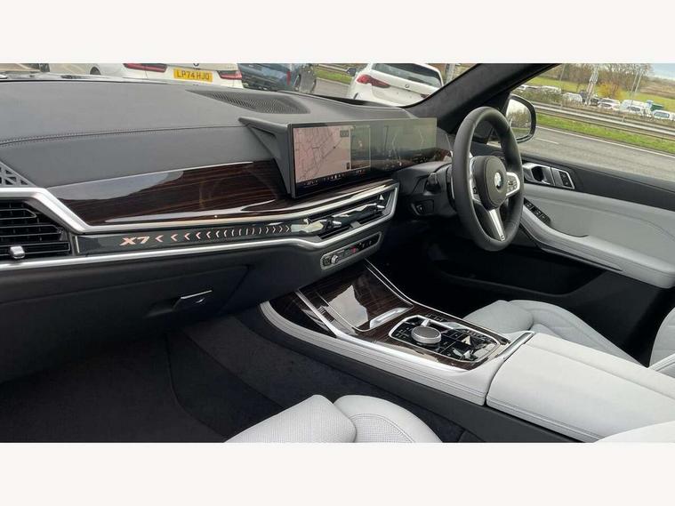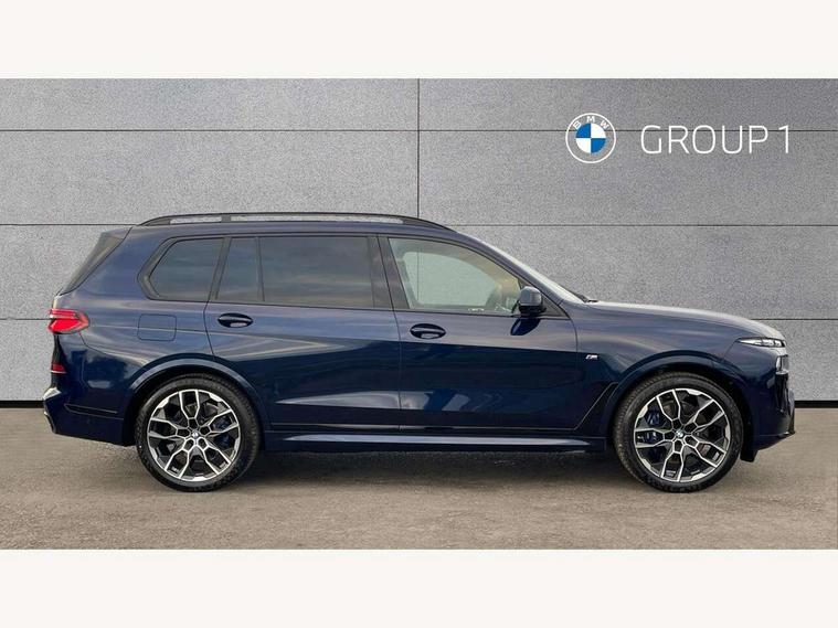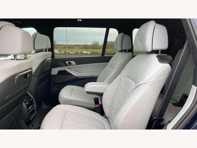 2 rear USB-C ports, Attentiveness assist, Automatic start/stop function, Automatic tailgate operation, BMW ConnectedDrive online services, BMW Drive recorder, BMW gesture control, BMW Teleservices, Brake pad wear indicator in front and rear, Condition based service, Integrated owner's handbook, Live Cockpit Professional with head up display including 12.3" instrument cluster and 14.9" central display, Parking assistant pro including reversing assistant, PDC, lateral parking aid, reversing assist camera, parking drive off monitoring, 48V Mild hybrid technology, 8 speed automatic with steptronic transmission including automatic hold function and gearshift paddles on the steering wheel, Drive experience switch with comfort mode + ECO PRO + sport mode, Permanent all wheel drive, 2x Front USB (1x USB-C, 1x USB-A), DAB radio, Personal eSim, Acoustic glazing, Adaptive air flap control bars in high gloss black, Air breather and door claddings in high gloss chrome, Body coloured wheel arches, Dynamic brake lights with LED technology, Electrically adjustable and heated aspheric folding side mirrors with auto dimming, electric fold in function, automatic parking function, Exterior and central air inlets in front bumper painted pearl chrome, Follow me home headlight function, Frameless interior mirror, Front and rear electric windows, Heated windscreen washer nozzles, High beam assist, High gloss black shadow line roof rails, High gloss black shadowline trim in side/window frame, window recess cover, window guide, B and C pillar, mirror triangle, mirror base, mirror frame, Integrated turn indicators, LED daytime running lights, LED rear lights, LED third brake light in rear spoiler, Rain sensor with automatic headlight activation and windscreen wiper control, Rear side wing doors, Sump guard front and rear painted in silver, Trailer stabilisation logic, 12V - Power sockets with 2x centre console and 1x luggage compartment, 2 comfort seats with armrest for passenger in 2nd row, 2 seat bench in 3rd row, 2x cupholders for 2nd row passengers in rear end of central console, 2x cupholders in front and rear centre armrest in 3rd row, 3 spoke M leather multifunction steering wheel, 40:20:40 split folding rear seat backrests, 6 seater, Ambient lighting strip in the instrument panel with illuminated, Armrest in front centre console, Compartment in front of cupholder, Driver and front passenger sunvisors with illuminated vanity mirrors and ticket holder, Electrical steering column with adjustable height and length with activation and control on the steering column, Entry sills with illuminated M inscription, Front and rear colour co-ordinated with all standard carpet colours, Front and rear door pockets, Front and rear side armrests integrated into door trim, Front seat back pockets, Grab handles, Height adjustable front headrests, Height adjustable rear headrests, Lockable glove compartment, Lower section separating net for load protection, Nano filter, Seat and backrest adjustment for 2nd row, Single front passenger seat, Soft close doors, Storage tray and compartment with lid in centre console, Wireless charging tray, Additional storage compartment pack - X7, Ambient light interior pack - X7, Connected Package Professional - X7, Interior lighting pack - X7, Luggage compartment pack - X7, M aerodynamics pack - X7, M Sport pack - X7, 3 point seatbelts on all seats, front pyrotechnic belt tensioners, stopper and belt force limiters, front and outer rear seats, Acoustic protection for pedestrians, Active protection, Airbag - Front driver and passenger, side airbags and Head airbags, Anti lock braking system (ABS) with cornering brake control, BMW emergency call, Child seat ISOFIX attachment rear outer seats in 2nd row and both seats in 3rd row includes top tether, Comfort access system with digital key plus, Comfort cushion seats for outer seats in 2nd row, Crash sensor inclu activation of airbags, interior light, safety battery terminal clamp, hazard warn flasher, unlock doors, deactivation of fuel pump, DSC - Dynamic Stability Control, Dynamic Traction Control - DTC, Electromechanical parking brake with automatic drive away release and auto hold function, Front and rear brake discs with interior ventilation, Hill descent control, Integrated braking system, Manual child lock in rear doors, PC iBrake PostCrash approach control warning with light braking function, Tyre pressure monitoring system, Tyre pressure sensors, Variable torque distribution, Warning triangle and first aid kit, Alarm, Central locking including 2 vehicle keys with integrated emergency key, Engine immobiliser, Locking wheel bolts, Galvanic embellisher for controls,