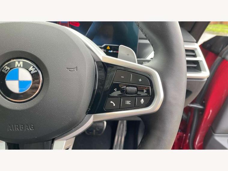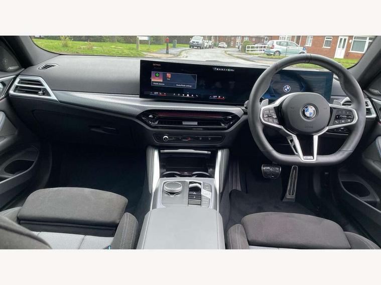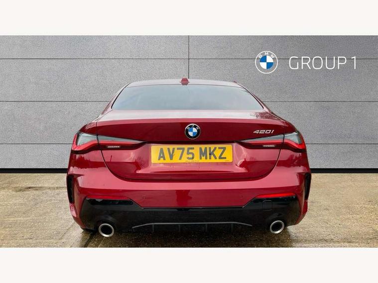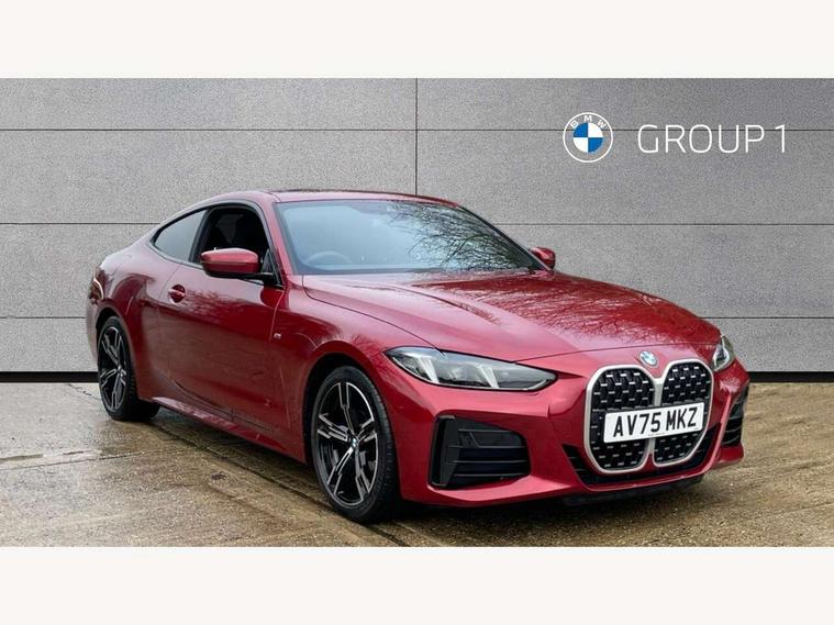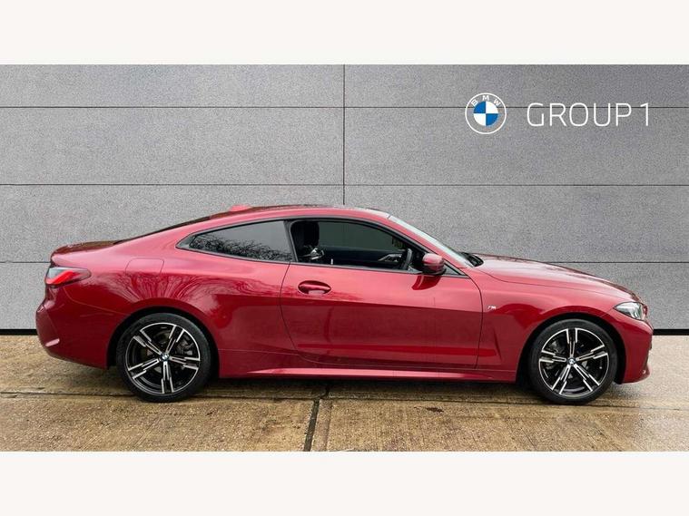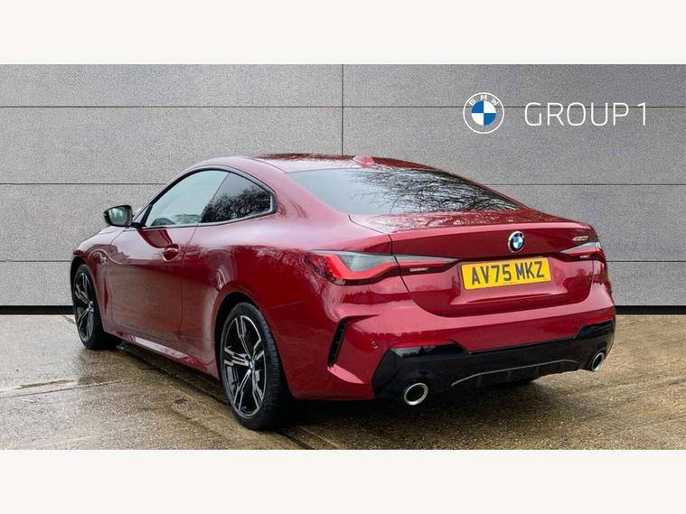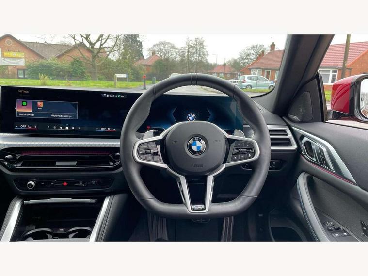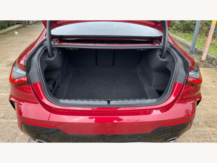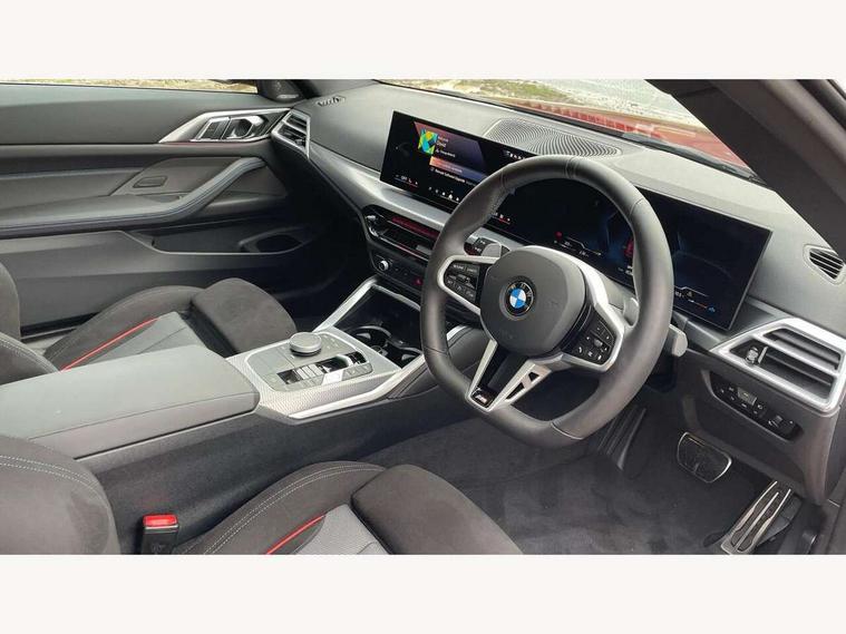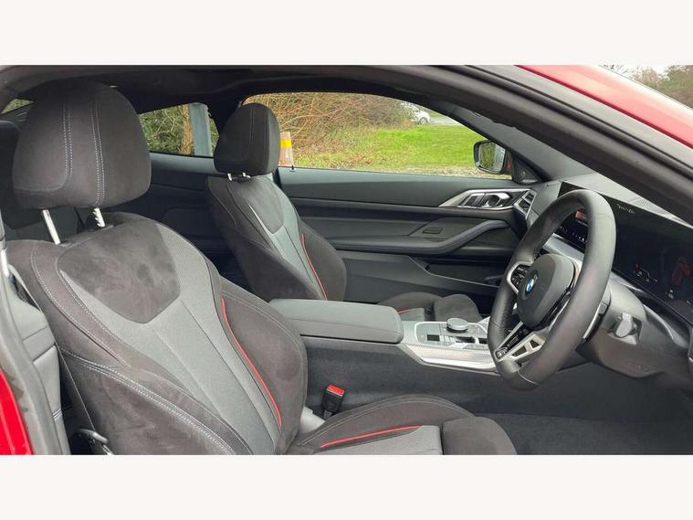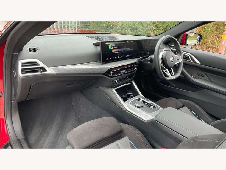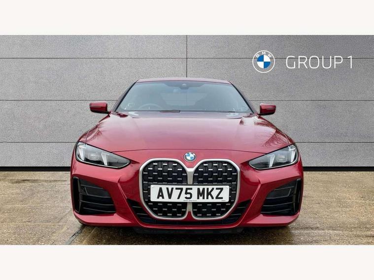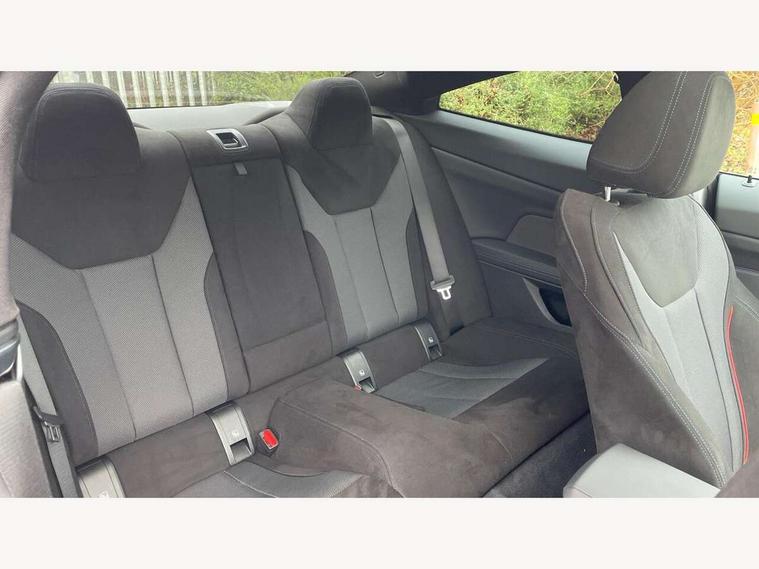 Active guard plus, Attentiveness assist, Automatic start/stop function, BMW ConnectedDrive online services, BMW iDrive controller on centre console, BMW service history, BMW Teleservices, Brake pad wear indicator in front and rear, Check Control warning system for monitoring of lights and door/luggage compartment open warning, Condition based service, Electric power steering with Servotronic steering optimised at all speed ranges, Instrument cluster with speedometer with mph readout, tachometer, fuel gauge and oil temperature gauge, Integrated owners handbook, Language version English, Oil sensor for level and grade, On board computer - average speed, fuel consumption, outside temp display with acoustic warning, clock/date, service interval, odometer/trip meter, Run flat indicator, Shifting point display, Start/stop button in black, Variable sport steering, 8 speed automatic steptronic transmission with gearshift paddles, Balanced 50/50 weight distribution, Double joint spring strut front axle, Drive experience mode switch - Comfort mode, ECO PRO mode and SPORT mode, Low centre of gravity, Petrol Particulate Filter, Stroke dependent dampers, DAB tuner, Personal eSim, Acoustic glazing, Automatic headlight beam throw control with load dependent regulating reaction, dynamic compensation of braking dive and acceleration squat, Automatic windscreen wipers and automatic headlight, BMW radiator grille with mesh grille, end face of the nuggets in aluminium matt and frame in chrome matt, Body colour fuel filler flap, Body colour roof fin, Bonnet and tailgate badge, Electric folding wing mirrors - Driver side electrochromic, auto anti dazzle function & front passenger side auto parking function without anti dazzle, Electric windows - front and rear, with open/close fingertip control, anti trap facility and comfort closing function all round, Follow me home headlights, Front and rear bumper system, Front apron plastic in body colour, Green tinted heat protection glazing, Illuminated bow type door handles in body colour drivers side with door lock, Interior rear view electrochromatic mirror with automatic anti dazzle function, LED 3rd brake light, LED daytime running lights, LED front fog lights, LED front indicators, Licence plate panel integrated into front bumper and tailgate, Low and high beam headlights in Bi-LED, M designation on front side panels, left and right, M Sport entry door sill strips, Model designation on right side of tailgate, One piece front bumper cover including towing eye cover in body colour, Preparation for high beam assistant, Reversing light, Side frame trim strip black matt, Two part LED tailights in L-shape with components in smoked glass, brake light, LED turn indicator and rear fog light, Visible exhaust tailpipe finisher, Visible VIN plate, Welcome lights in interior and door handle area, Widened track and increased camber values for max transverse dynamics, agility and steering precision, Windscreen washer jets concealed underneath bonnet, 12V power socket in front centre console, 2 front cupholder in centre console with clamping elements and matt black inlay, 2 Rear seat headrests, 2 seat bench in second row, 2 zone automatic air conditioning, 3 spoke flat bottom M sport leather multifunction steering wheel, 4 pieces lashing eyelets in luggage compartment, 40:20:40 split folding rear seat and rear centre armrest with two cupholders, Anthracite headlining, Armrest integrated in front and rear door trim + front centre console armrest, Battery in luggage compartment, BMW ID, Extended storage - Luggage compartment partition net on left side trim panel, Bag hook on both sides of the luggage compartment, Four grab handles integrated in roof lining, Front and rear door pockets, Front footwell lights, Heated driver and front passenger seats, Height adjustable front headrests, Illuminated armrest storage compartment, Illuminated glove compartment with separate small compartment, Interior light and front reading light, Luggage compartment light, Single front passenger seat, Steering column adjustment - Infinitely variable in height and length, Sunvisors with illuminated vanity mirrors and ticket pocket, Through load system, Toolkit located in luggage compartment, Velour front floor mats, Ambient lighting pack - 4 Series, BMW Live Cockpit Plus pack - 4 Series, Connected professional package - 4 Series, M High gloss shadowline exterior trim pack - 4 Series, M sport exterior styling pack - 4 Series, Park assist pack - 4 Series, 2 x 3-point rear seatbelts, BMW emergency call, Brake energy regeneration, Braking pre-tensioning, Child seat ISOFIX attachment for the two outer rear seats, Crash sensor activating of airbags, Unlocking doors, hazard warning lights, interior light, safety battery terminal, Driver and front passenger side airbags, integrated in the door side seat backrest bolsters for all seat variants, Driver/Front Passenger airbags, Dry braking, Dynamic brake control, Dynamic stability control + (DSC+) - Anti-lock Braking System (ABS) with brake assist and cornering brake control + Automatic Stability Control (ASC), Dynamic Traction Control - DTC, Electric parking brake including automatic hold function and automatic release of the parking brake when driving off, Electronic differential lock control (EDLC), Front and rear ventilated brake disc, Front passenger manual airbag deactivation, Head airbags for all 4 outer seats, Hill start assistant, Seat belt security check for driver and front passenger, Seat belt with belt stopper, pyrotechnic belt tensioners and belt force limiters, Seat occupancy detection for driver and passenger side, Side impact protection, Tyre pressure sensors, Warning triangle and first aid kit, Alarm system for monitoring doors, engine compartment, interior movement sensor, tilt sensor and siren with emergency power supply, Centre lock switch - Button in driver's side front door, complete locking of car, Closing system with centre locking for all 