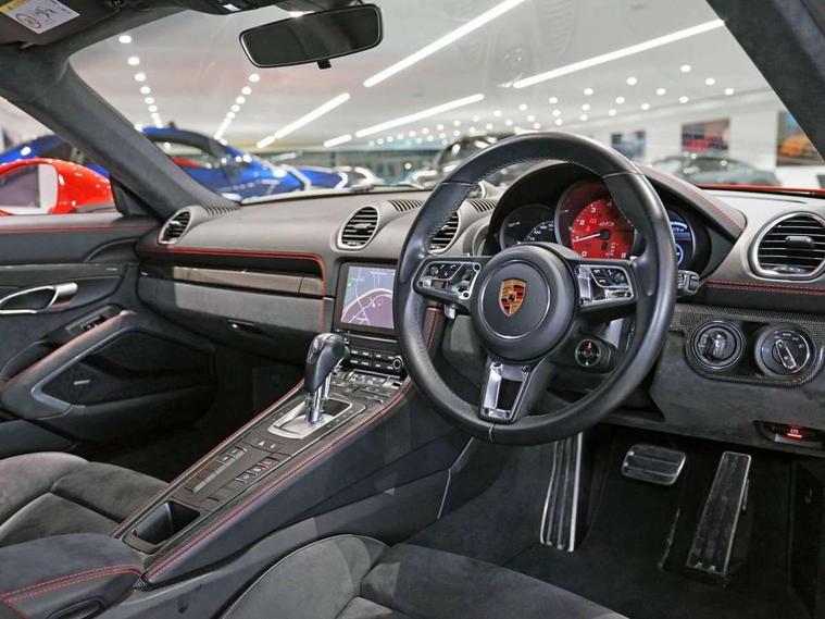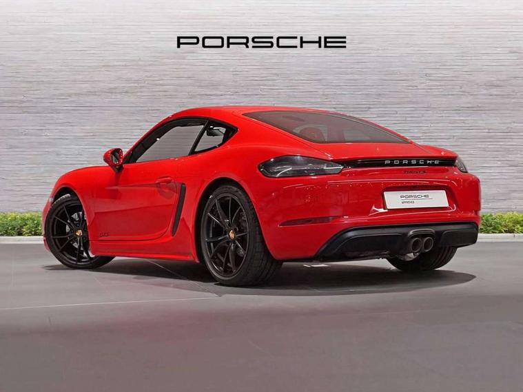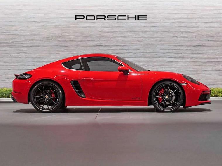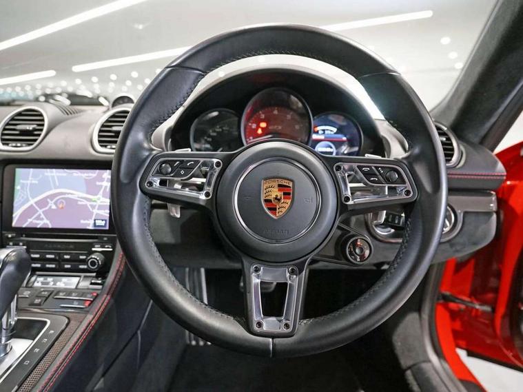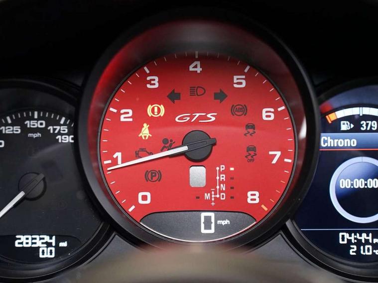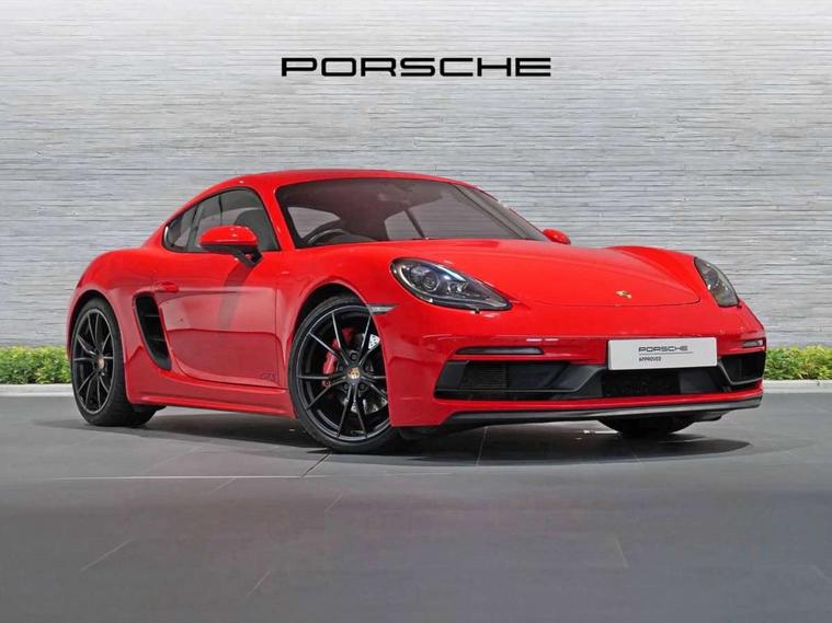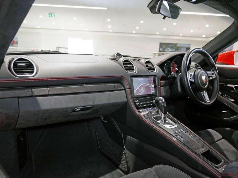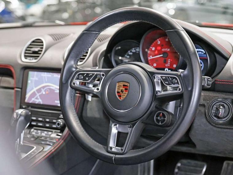 Connect Plus, Apple CarPlay, telephone module, wireless internet access, carfinder, remote vehicle status, remote service, vehicle track, Digital displays for vehicle speed, chosen gear, odometer, trip odometer and clock, Instrument cluster with central rev counter and high-resolution 4.6 inch colour display, Porsche Communication Management (PCM) including online navigation module, mobile phone preparation, audio interfaces and voice control system, 64 litre fuel tank, Gasoline particulate filter, Porsche Doppelkupplung (PDK), Porsche Stability Management (PSM), ABS with extended brake functions, Porsche TORQUE Vectoring (PTV) with mechanical rear differential lock, Turbocharger with variable turbine geometry (VTG) and intercooler, VarioCam Plus variable valve timing and switchable valve lift, DAB Digital radio, Integrated compatible SIM including Porsche Connect Services, Wifi and music streaming, Aerodynamic wipers, Automatic headlight activation including welcome home lighting, Automatically extending rear spoiler, Black model designation on doors, Body colour bumpers, Electrically adjustable heated exterior mirrors on door waist rails, aspherical on driver's side, Green tinted heat insulating glass, GTS front apron partially painted in black, GTS rear apron partially painted in black, Intelligent lightweight body in Aluminium/Steel composite construction, LED taillights and integral 4 point brake lights and reversing lights, Painted Porsche logo and model designation, Power windows with one touch operation and door seal protection, Separate auxiliary lights in the front end with LED indicators and position lights, Top tinted windscreen, Twin tract sports exhaust system with black central twin tailpipe in stainless steel, Wide opening rear hatch with heated screen, Windscreen washer system with two wiper speeds and washer jets, 12V sockets in passenger footwell and centre console storage compartment, Adjustable fan with air recirculation and defroster functions, Clothes hooks on front seat backrests, Door sill guards with model designation logo, Elevated centre console with uncovered storage compartment and closed storage compartment, Front and rear luggage compartments, Front centre console storage box, GT alcantara sports steering wheel and PDK gear selector, LED reading lights, orientation, ignition lock, additionally luggage compartment and glove compartment lighting, Lockable glovebox, Smooth finish leather on steering wheel rim, gear lever and door handles, Storage compartments in each doors, Three way catalytic converter and on board diagnostics for monitoring emission control system, Two individual cup holders (integral to dashboard trim strip), Sport chrono package including mode switch - Cayman, Electrically controlled parking brake, Front and rear 4 piston aluminium monobloc fixed calipers, discs internally vented and cross drilled, front/rear disc diameter, brake calipers in red, Front and rear lightweight spring strut axle, Full size driver and passenger airbags, Porsche side impact protection doors with thorax airbag in outer backrest side bolster and head airbag for driver/passenger in door panel, Tyre pressure monitoring system, Alarm system with interior surveillance, Anti-theft wheel bolts, Auto start/stop function including coasting (in connection with PDK), Engine immobiliser with in key transponder, central locking and remote control, Tyre sealing compound and electric air compressor kit,