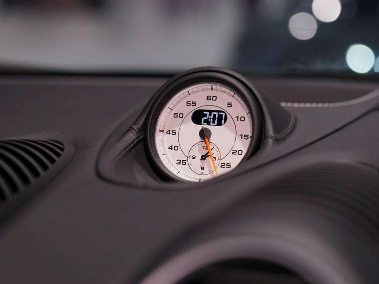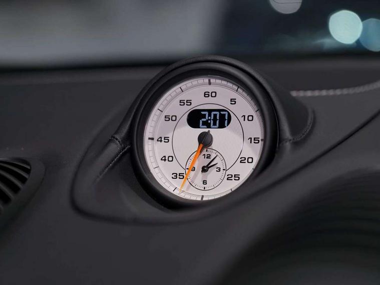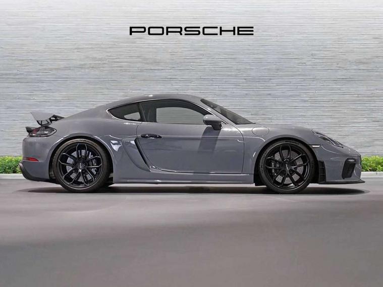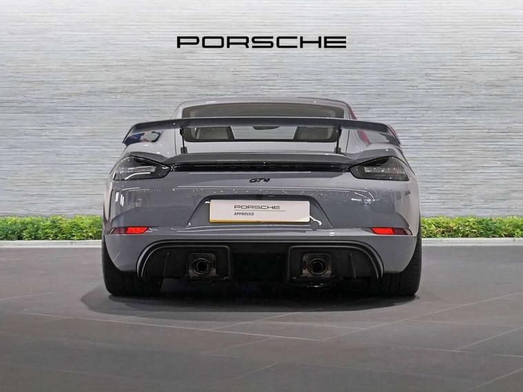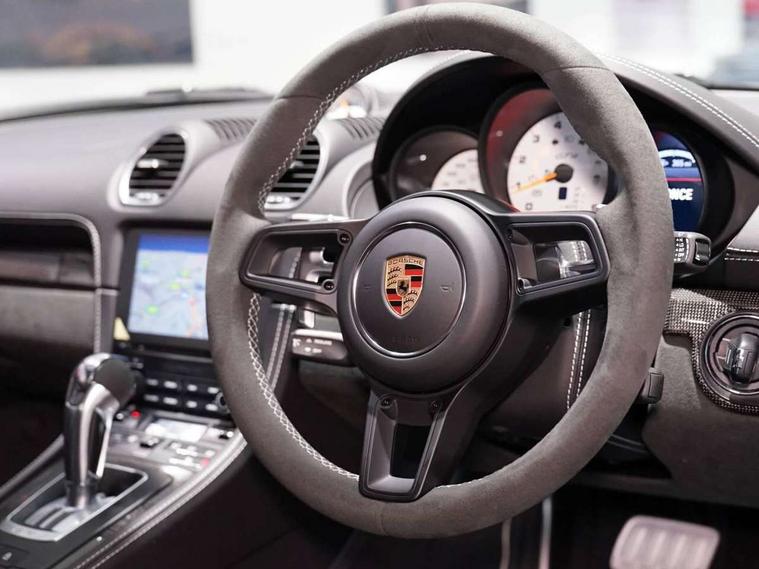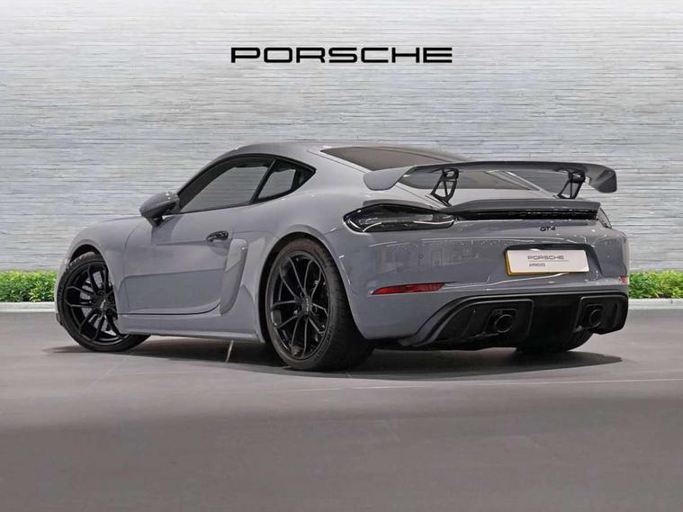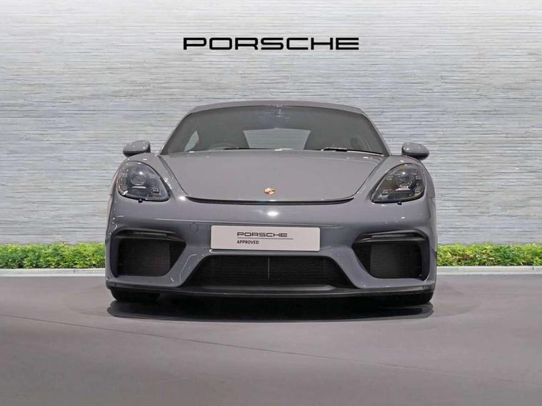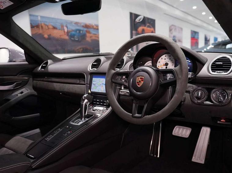 Auto blip button to activate automatic throttle-blipping for downshifts, Auto start and stop system, Cruise control, Digital displays for vehicle speed, chosen gear, odometer, trip odometer and clock, eCall emergency call system, Electromechanical direct steering with variable steering ratio and steering pulse generator, Instrument cluster with central rev counter and high-resolution 4.6 inch colour display, Porsche track precision app, 64 litre fuel tank, Adjustable chassis for race track use (toe, camber, anti-roll bars), Aluminium block and cylinder heads, Central cooler, Direct fuel injection (DFI), Dynamic gearbox mount system, Gasoline particulate filter, Integrated dry-sump lubrication with an on-demand oil pump, Porsche Active Suspension Management (PASM) sport suspension with lowered 30mm ride height, Porsche Doppelkupplung (PDK), Porsche stability management (PSM) including ABS with two switchable stages (ESC OFF and ESC+TC OFF), Porsche TORQUE Vectoring (PTV) with mechanical rear differential lock, Rear wheel drive, Shortened gear lever, Two seater vehicle with mid mounted engine, Two three-way catalytic converters and on-board diagnostics for monitoring emission control system and coated particulate filter, Variable intake manifold with two switchable resonance valves, VarioCam (camshaft control for inlet and exhaust valves) and adaptive cylinder management, Water cooled with thermal management, DAB Digital radio, Integrated 4G/LTE compatible SIM including data for the Porsche Connect Services, Integrated compatible SIM including Porsche Connect Services, Navigation incl porsche + Apple Carplay, connect module, wireless internet access, carfinder, remote vehicle status, remote service and vehicle track, Wifi and music streaming, 3rd brake light, Automatic headlight activation including welcome home lighting, Black side window trim, Body colour bumpers, Body colour door handles, Closed underbody panel with two additional ventilation openings (NACA) for exhaust system, Door opening loops in silver, Electrically adjustable heated exterior mirrors on door waist rails, aspherical on driver's side, Fixed GT4 rear wing in exterior colour with integrated sideplates, wing uprights in black aluminium, Fixed rear spoiler, Front apron with large cooling intakes with grilles and spoiler lip with recessed GT4 logo in black and central air outlet, Green tinted heat insulating glass, Grey top tinted windscreen, Heated rear windscreen, Intelligent lightweight body in Aluminium/Steel composite construction, LED tail lights and integral 4 point brake lights and reversing lights, Power windows with one touch operation and door seal protection, Rain sensor, Rear apron lower part in black with integrated rear diffuser, Rear boot, Separate tinted auxiliary lights in the front end with LED indicators and position lights, Side air intakes with sideblades embossed with 'GT4' logo painted in exterior colour, Twin tract sports exhaust system with two tailpipe in stainless steel high gloss black, Wide opening rear hatch with heated screen, Windscreen washer system with aero wiper blades and washer jets, 12V sockets in passenger footwell and centre console storage compartment, Additional smooth finish leather with door panel armrest and centre console main storage compartment, Adjustable fan with air recirculation and defroster functions, Ascending centre console with uncovered storage compartment and closed storage compartment, Clothes hooks on front seat backrests, Footwell illumination, Front and rear luggage compartments, Front headrests, GT4 logo on gear lever, Heated seats, LED reading lights, orientation, ignition lock, additionally luggage compartment and glove compartment lighting, Lockable glovebox, Performance display in Porsche communication management (PCM), Race-Tex roof lining and A pillar trims, Seat centres in race tex, side bolsters, headrests in leather and headrests embroidered with GT4 logo in silver, Single front passenger seat, Storage compartments in each doors, Two individual cup holders (Passenger side, integrated into dashboard trim strip), 3 point automatic seatbelts, ASR, Electrically controlled parking brake, Front lightweight spring strut axle, Front seatbelt pretensioners + load limiters, Full size driver and passenger airbags, Lightweight spring strut rear axle, helper springs, anti roll bar, suspension mountings partly ball jointed, Passenger airbag deactivate switch, Porsche side impact protection doors with thorax airbag in outer backrest side bolster and head airbag for driver/passenger in door panel, Tyre pressure monitoring system (TPM) with track mode, Alarm system with interior surveillance, Anti-theft wheel bolts, Dashcam prep, Engine immobiliser with in key transponder, central locking and remote control, 20" 718 GT4 alloy wheels in satin platinum in sport tyre, Tyre repair kit,
