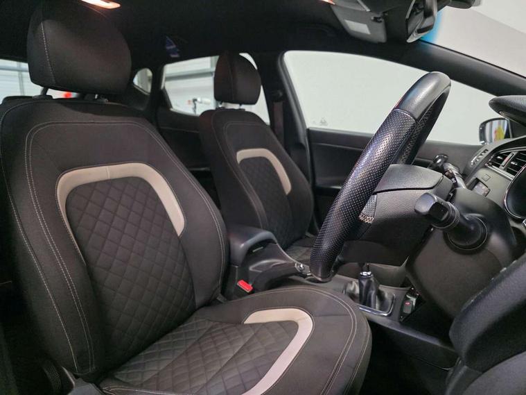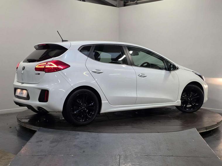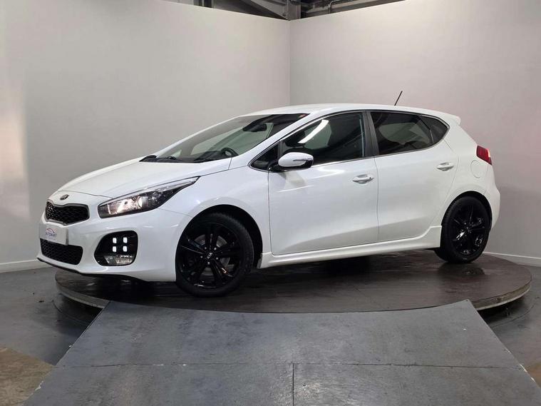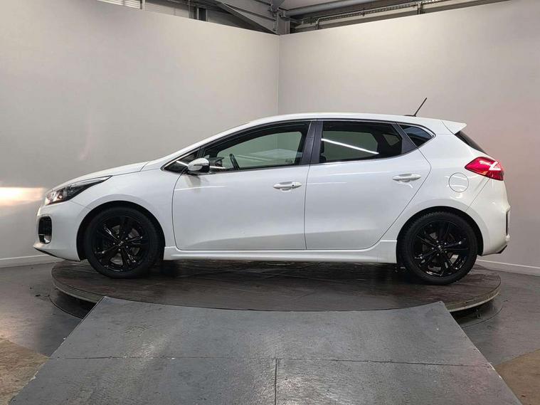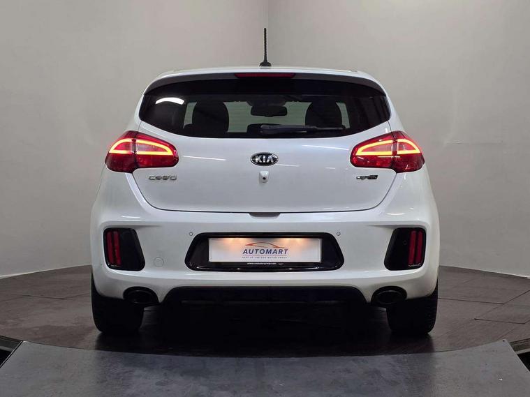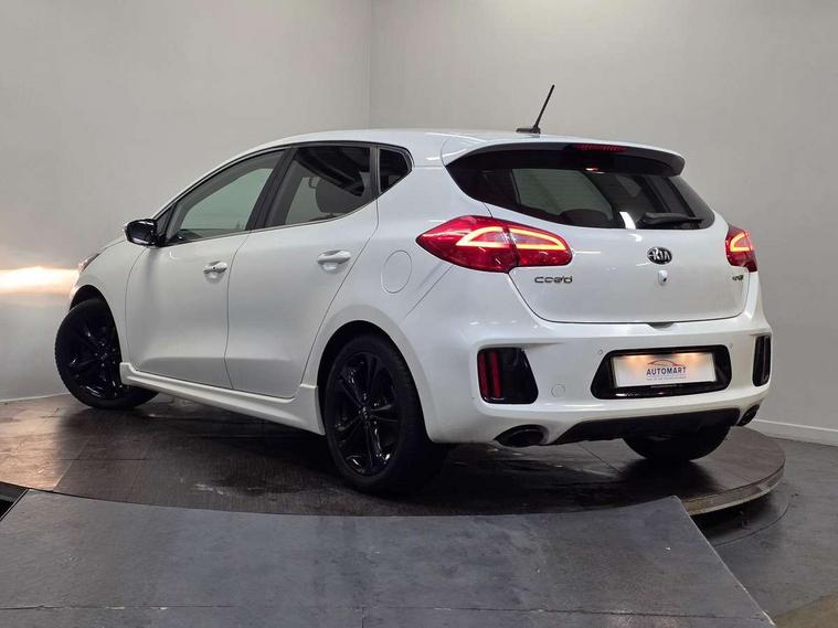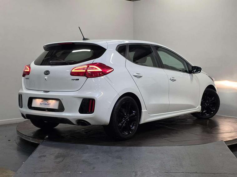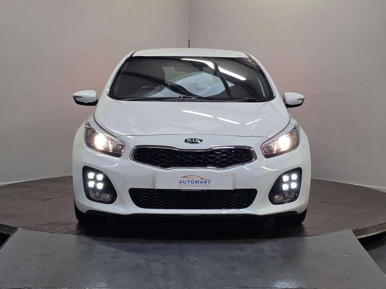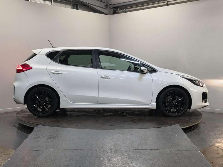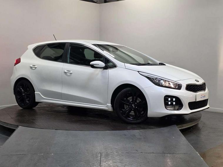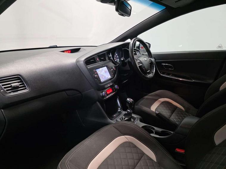 7" touchscreen full map navigation system with TomTom Connected Services, Cruise control + speed limiter, Digital clock with date indicator, Electric power steering, Emergency stop signalling system, Flex Steer variable steering settings, Instrument cluster in chrome, Internal fuel flap release, Kick down switch, Low screen washer fluid warning, Multi function display colour screen, Outside temperature gauge, Rear parking sensor, Rear view camera, Service interval indicator, Start/stop button with aluminium finish, Trip computer, Intelligent Stop and Go, 6 speakers, Bluetooth audio streaming, DAB Radio/CD + MP3, Steering wheel mounted audio controls, USB and auxiliary socket, Auto dimming rear view mirror, Automatic defog system, Automatic headlights, Body colour bumpers, Body colour door handles, Body colour door mirrors, Chrome window surround, Cornering light, Dual projection headlights, Electric adjustable/heated/folding door mirrors, Electric front/rear windows/one touch facility, Follow me home headlights, Front fog lights, Headlamp levelling, Heated rear window with timer, Illuminated front door handles, LED indicators in door mirrors, LED rear lights, Privacy glass, Puddle lights, Rain sensing front wipers, Rear spoiler, Rear wash/wipe, Tinted glass, Wide angle door mirrors, Windscreen wiper de-icer, 12V power socket in front console (x2), 12V socket in luggage compartment, 3 passenger grab handles, 5 height adjustable headrests, 60/40 split folding rear seat, Black headlining, Centre console storage box, Centre console storage box/armrest, Chrome interior door handles, Cupholders in centre console, Driver + front passenger electric lumbar support, Driver and passenger illuminated vanity mirror, Driver's sunvisor with ticket holder/vanity mirror, Driver/front passenger seat height adjustment, Dual zone automatic air conditioning, Front map light with sunglasses case, Front seat and rear pockets, Gear shift indicator, Illuminated air conditioned glovebox, Illuminated front centre console tray, ISOFIX top tethers and lower anchor points, Leather handbrake, Load area cover, Luggage area lamp, Luggage area underfloor compartment, Luggage net, Rear centre armrest with cupholders, Rear coat hooks, Rheostat dimmer switch, Stainless steel pedals, Stainless Steel Scuff Plates, Storage bins on all doors, Tilt/telescopic adjustable steering wheel, Exterior styling pack - Cee'd GT Line/GT Line S, Interior styling pack - Cee'd GT Line/GT Line S, 3 point seatbelts on all seats, ABS/EBD, Automatic unlocking of doors in case of impact, Curtain airbags, Dual horn, ESC + BAS + VSM + HAC, Fasten seatbelt reminder, Front passenger airbag deactivation, Height adjustable front seatbelts, Rear door child safety locks, Traction control, Twin front and side airbags, Tyre pressure monitoring system, Alarm system, Deadlocks, Immobiliser, Locking wheel nuts, Smart keyless entry, Speed sensitive auto door locking, Black high gloss front console tray garnish & door trim, Black nano centre fascia, Chrome air vent surrounds, Faux leather front door trim, 17" Alloy wheels, Temporary spare wheel,
