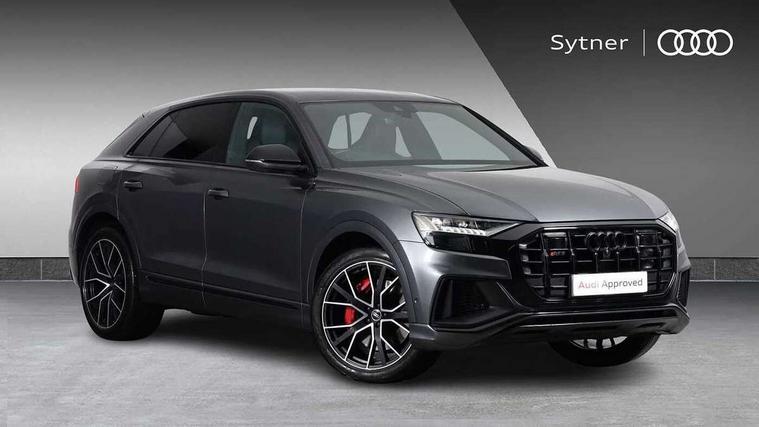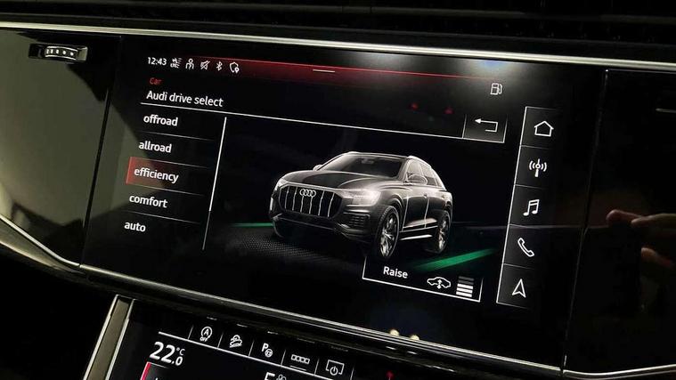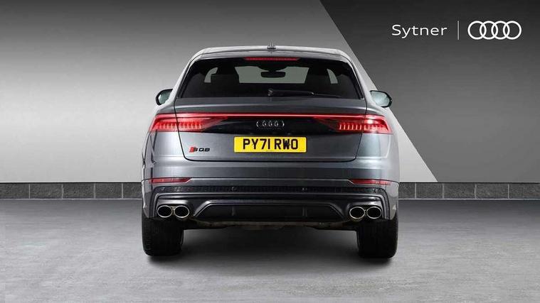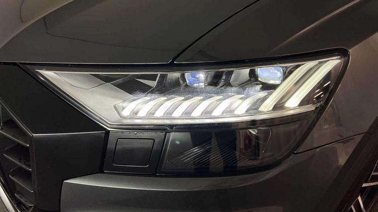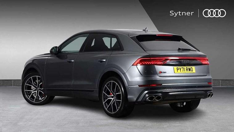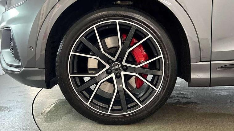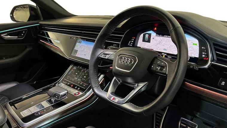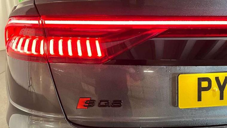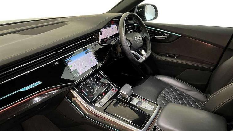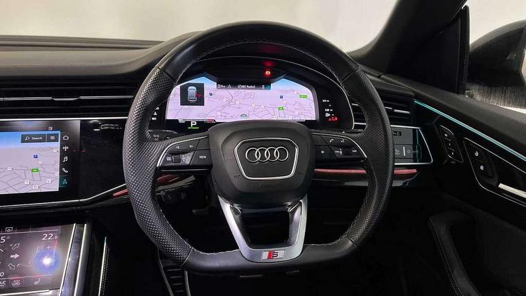 10.1" and 8.6" Dual colour touchscreens, All wheel steering, Audi connect safety and service (e-call), Audi connect with Amazon Alexa Integration, Audi drive select, Audi parking system plus includes 360 degree display with front and rear sensors, Audi virtual cockpit - 12.3" high resolution LCD display with fully customisable instrument cluster, Automatic start/stop system, Electro-mechanical PAS, Low washer fluid indicator, MMI - Multi Media Interface control system, MMI navigation plus with MMI touch, Natural voice recognition, On board computer, Operating buttons in black, glass look with haptic feedback, Power operated tailgate, Rear view camera, Service interval indicator, Smartphone interface includes wireless Apple carplay/Android Auto, 48V Mild hybrid technology, 85 litre fuel tank, Quattro all wheel drive with self locking centre differential, S specific Adaptive air suspension, Audi music interface with 2 USB ports with charge and data functions, Audi sound system with 6 channel amplifier, 180 watt amplifying capacity and 10 loudspeakers including subwoofer, Aux-in socket, DAB Digital radio, Acoustic windscreen, Audi Beam uses LEDs to project the Audi logo, Audi HD Matrix LED headlights with dynamic front and rear indicators, Auto dimming frameless rear view mirror, Body coloured bumpers, Coming/leaving home lighting function, Electric front+rear windows, Electrically folding auto dimming/adjustable/heated door mirrors with memory function, LED side indicators and kerb view function for passenger side, Gloss black finish for exterior Audi rings and SQ8 logo, Headlight washers, Heat insulating glass in windshield, LED signature daytime running lights, Platinum grey front spoiler lip and diffuser insert, Privacy glass - dark tinted rear and rear side windows from B-pillar backwards, Rain and light sensors, Rear wiper, S specific dual brach chrome tailpipes on both the left and right, S specific front and rear bumpers, S specific side skirts in matt selenite silver, Side air inlet grilles in matt titanium black, Trim and underbody protection in matt selenite silver, 4 zone deluxe automatic climate control, 4-way lumbar support for front seats, 40:20:40 split folding rear bench seat, Black cloth headlining, Comfort front centre armrest, Driver seat memory function, Electrically adjustable front seats, Front head restraints, Front/rear floor mats, Heated front seats, Illuminated door sill trims, ISOFIX child seat mounting for front passenger seat and 2 outer rear seats with top tether child seat mounting for all 3 rear seats, LED interior ambient lighting, Luggage compartment sill protection in stainless steel, Rear centre armrest with 2 cupholders, Rear headrests, Rear seat bench plus, Stainless steel pedals, Sunvisors with illuminated vanity mirrors, Upper and lower interior elements in leather, leather door armrests, Titanium Black Styling Pack - Q8, 3 point seatbelts on all seats, Audi pre sense front, Driver and front passenger, front side and curtain airbags, Electromechanical parking brake, Electronic Stability Control (ESC) including ABS, ASR and EDL, Front passenger airbag deactivation, Hill descent control, Hill hold assist, Predictive pedestrian protection, Seatbelt monitoring, Traction control, Tyre pressure loss indicator, Warning triangle and first aid kit, Anti theft alarm with tow away protection, Anti-theft wheel bolts and wheel loosening detection, Immobiliser, Keyless go with remote central locking, Polished oak trim with grey finish inlay, Tool kit, Tyre repair kit,