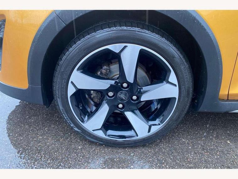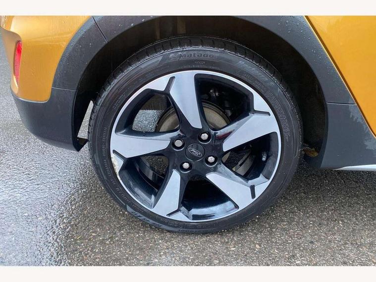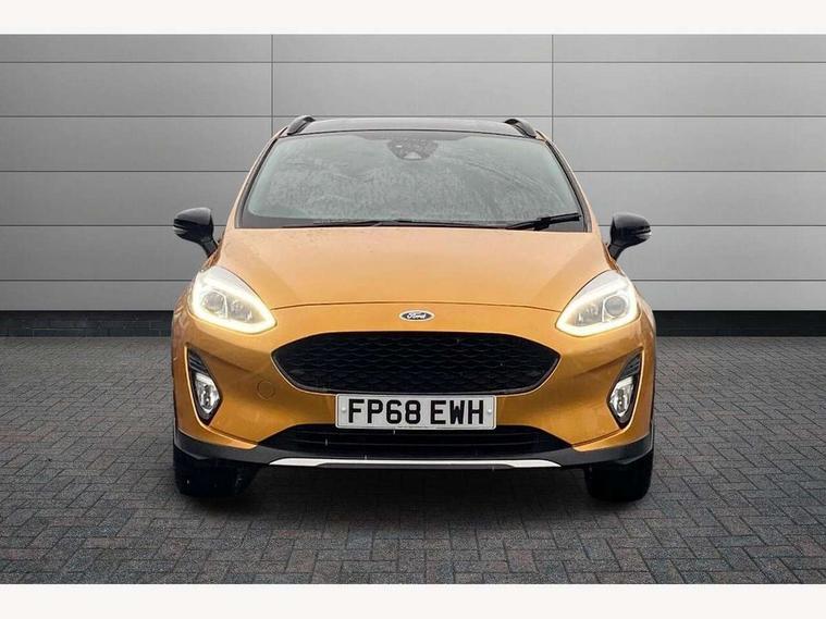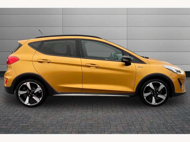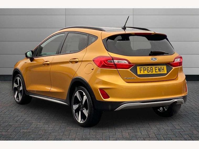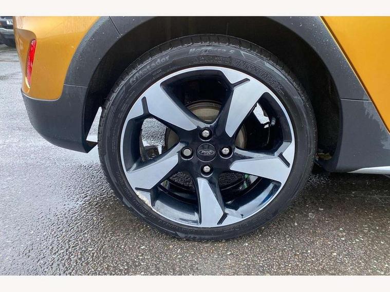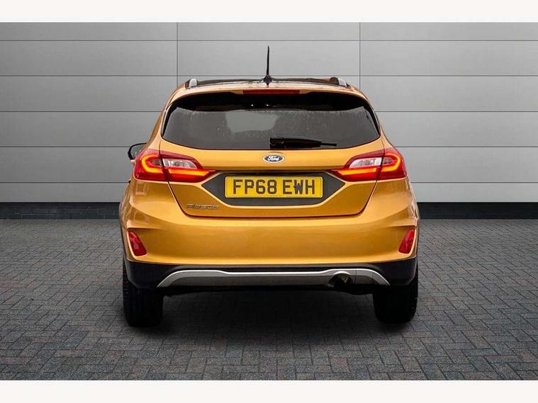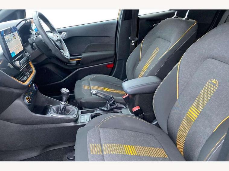 Bluetooth system, Drive mode selector, Electric power steering, Ford easy fuel, Trip computer, Rough road suspension with increased ride height adjust, 2 USB ports, Auxiliary input socket, Steering wheel mounted controls, Active logo front door thershold plates, Auto dimming rear view mirror, Automatic headlights, Black roof rails, Body colour bumpers, Body colour door handles, Body colour rear spoiler, Chrome beltline trim, Chrome door handles, Chrome lower window surround, Cornering front fog lights, Electric front windows/one touch facility, Electric rear windows, Electrically operated and heated door mirrors with side indicators, LED Night signature to rear lights, LED rear lights, Quickclear heated windscreen, Rain sensing wipers and auto dimming rear view mirror, Rear privacy glass, Rear wiper, Rugged body styling kit with active front wing badges, Shadow black contrast roof and door mirrors, Tinted glass, Upper front grille chrome surround, 12V Accessory socket in centre console, 3 spoke leather trimmed steering wheel with audio control, 60/40 split folding rear seat, Adjustable head restraints, Ambient lighting, Black headlining, Boot carpet, Centre console with armrest and illuminated cupholders, Chrome inner door handles, Cloth upholstery, Driver's seat lumbar support, Footwell illumination, Front map reading lights, Front seat and rear pockets, Front/rear floor mats, Height adjustable driver's seat, Illuminated glovebox, Leather gear knob, Leather trimmed handbrake handle, Load area light, Manual air conditioning, Overhead console with sunglasses holder, Pollen filter, Rake/reach adjustable steering wheel, Rear centre head restraint, Driver assistance pack - Fiesta/Titanium/Titanium X/Active B+O/Active X/ST-Line X, NCAP Pack - Fiesta, Yellow pack - Fiesta, 3 point seatbelts on all rear seats, ABS+EBA, Curtain airbags, Driver and passenger airbags, Drivers knee airbag, Electronic stability control with hill start assist, Front passenger airbag deactivation, Front side airbags, Seatbelt warning, Tyre pressure monitoring system, MyKey system, Remote central locking & engine immobiliser, Thatcham Cat.1 alarm, 17" 5 spoke alloy wheels with shadow black machined finish, Tyre repair kit,