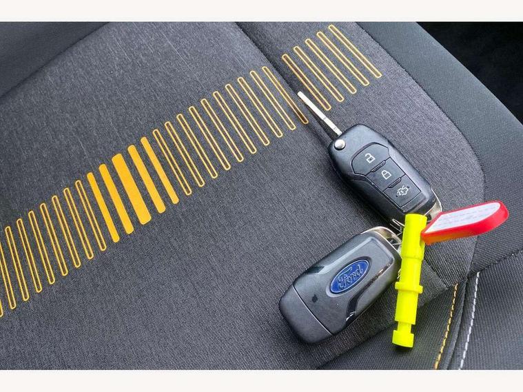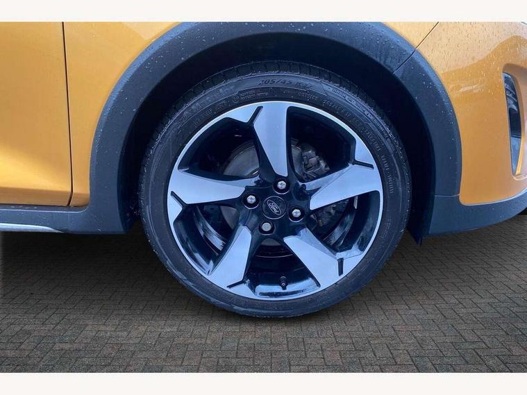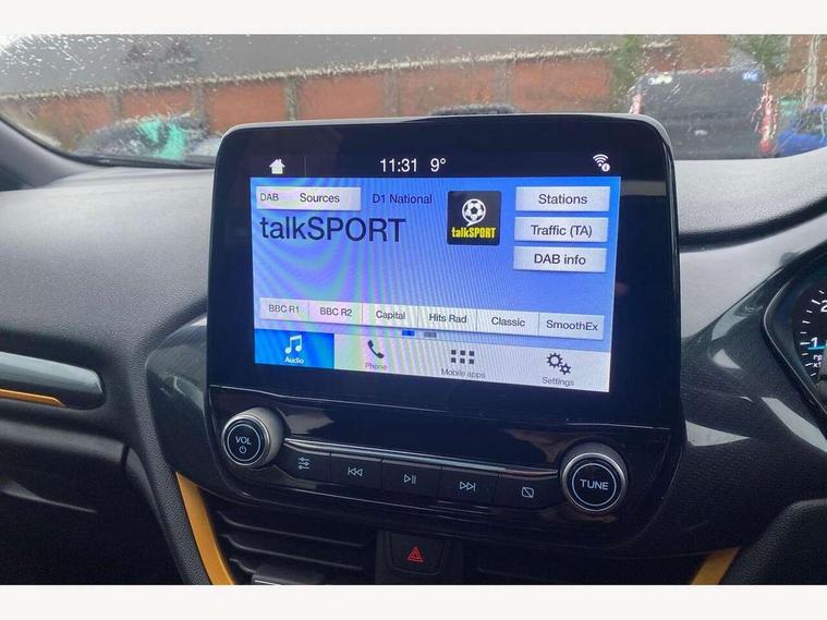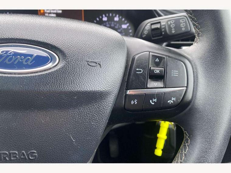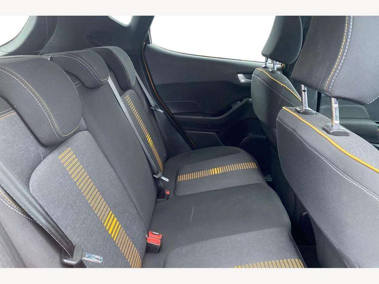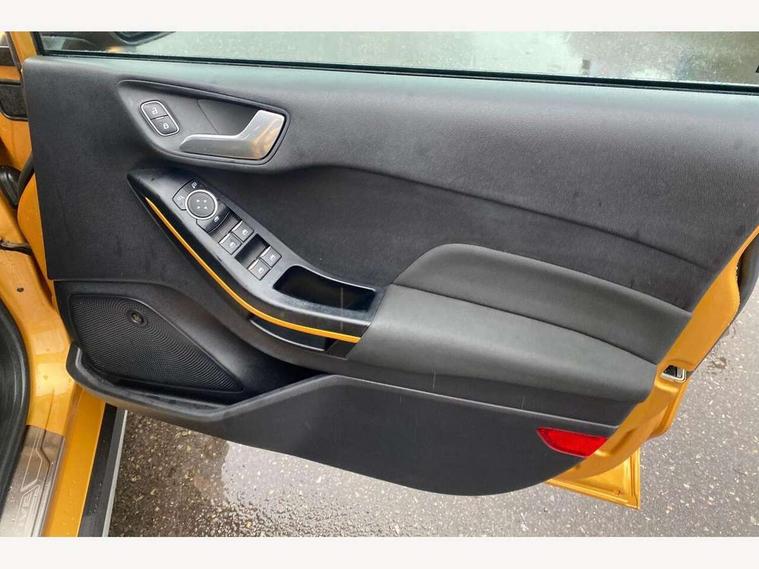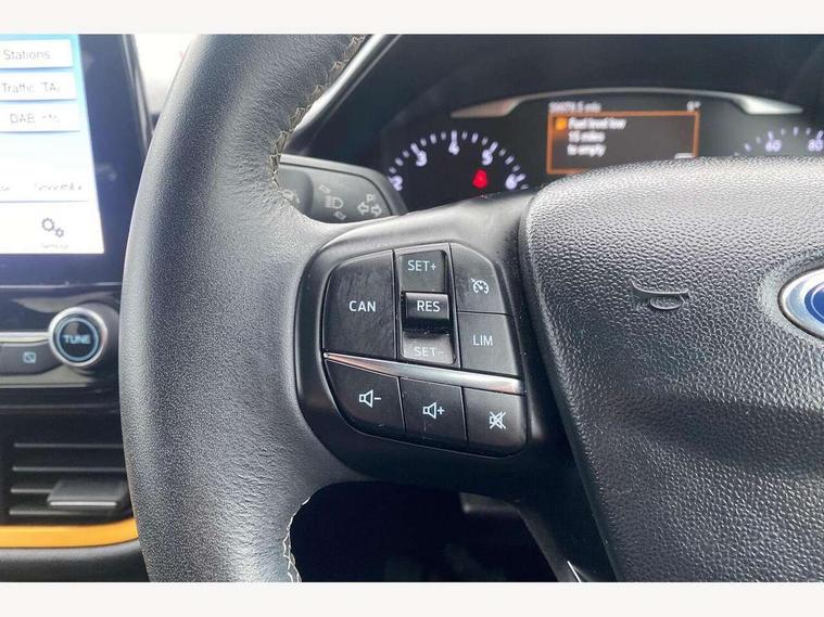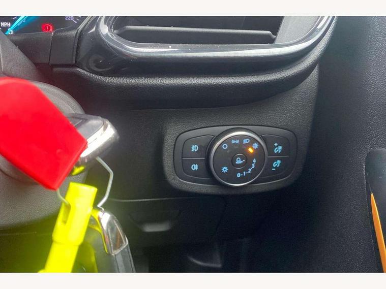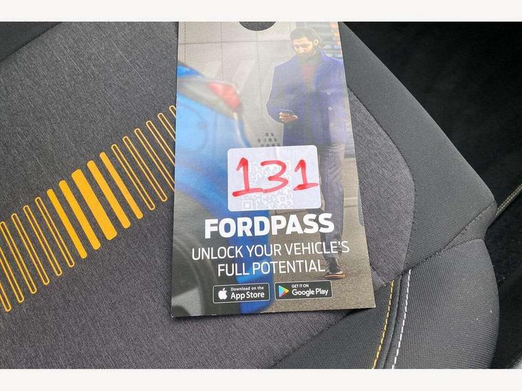 Bluetooth system, Drive mode selector, Electric power steering, Ford easy fuel, Trip computer, Rough road suspension with increased ride height adjust, 2 USB ports, Auxiliary input socket, Steering wheel mounted controls, Active logo front door thershold plates, Auto dimming rear view mirror, Automatic headlights, Black roof rails, Body colour bumpers, Body colour door handles, Body colour rear spoiler, Chrome beltline trim, Chrome door handles, Chrome lower window surround, Cornering front fog lights, Electric front windows/one touch facility, Electric rear windows, Electrically operated and heated door mirrors with side indicators, LED Night signature to rear lights, LED rear lights, Quickclear heated windscreen, Rain sensing wipers and auto dimming rear view mirror, Rear privacy glass, Rear wiper, Rugged body styling kit with active front wing badges, Shadow black contrast roof and door mirrors, Tinted glass, Upper front grille chrome surround, 12V Accessory socket in centre console, 3 spoke leather trimmed steering wheel with audio control, 60/40 split folding rear seat, Adjustable head restraints, Ambient lighting, Black headlining, Boot carpet, Centre console with armrest and illuminated cupholders, Chrome inner door handles, Cloth upholstery, Driver's seat lumbar support, Footwell illumination, Front map reading lights, Front seat and rear pockets, Front/rear floor mats, Height adjustable driver's seat, Illuminated glovebox, Leather gear knob, Leather trimmed handbrake handle, Load area light, Manual air conditioning, Overhead console with sunglasses holder, Pollen filter, Rake/reach adjustable steering wheel, Rear centre head restraint, Driver assistance pack - Fiesta/Titanium/Titanium X/Active B+O/Active X/ST-Line X, NCAP Pack - Fiesta, Yellow pack - Fiesta, 3 point seatbelts on all rear seats, ABS+EBA, Curtain airbags, Driver and passenger airbags, Drivers knee airbag, Electronic stability control with hill start assist, Front passenger airbag deactivation, Front side airbags, Seatbelt warning, Tyre pressure monitoring system, MyKey system, Remote central locking & engine immobiliser, Thatcham Cat.1 alarm, 17" 5 spoke alloy wheels with shadow black machined finish, Tyre repair kit,