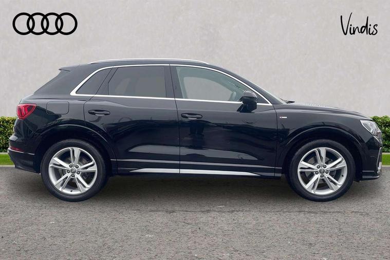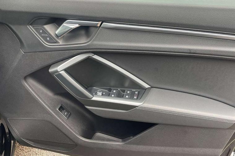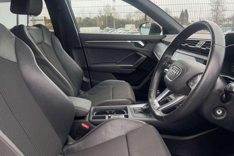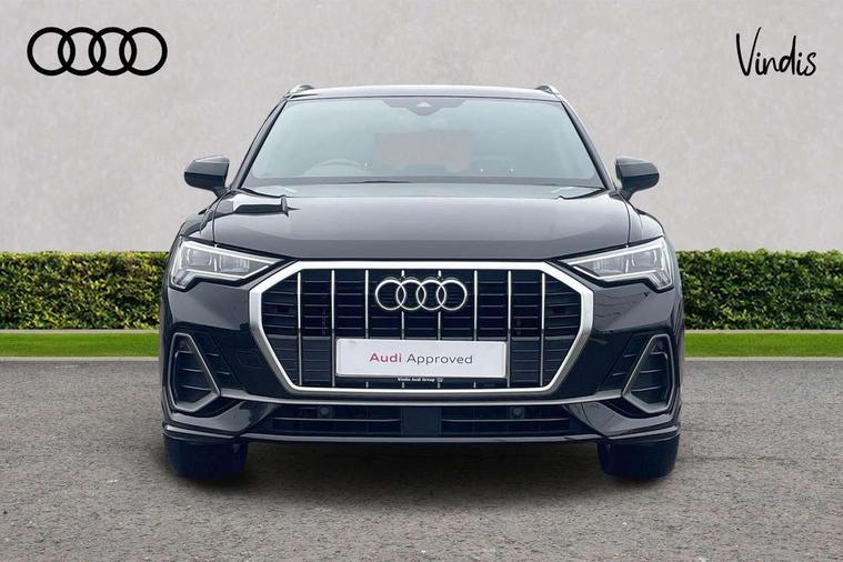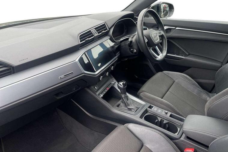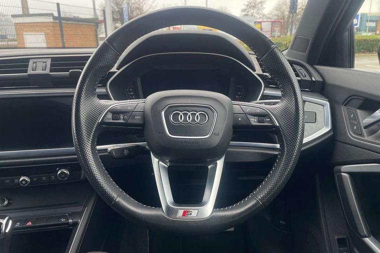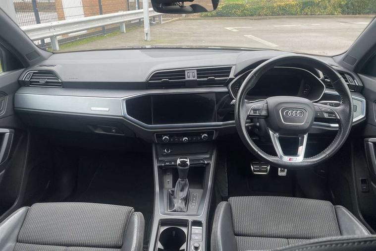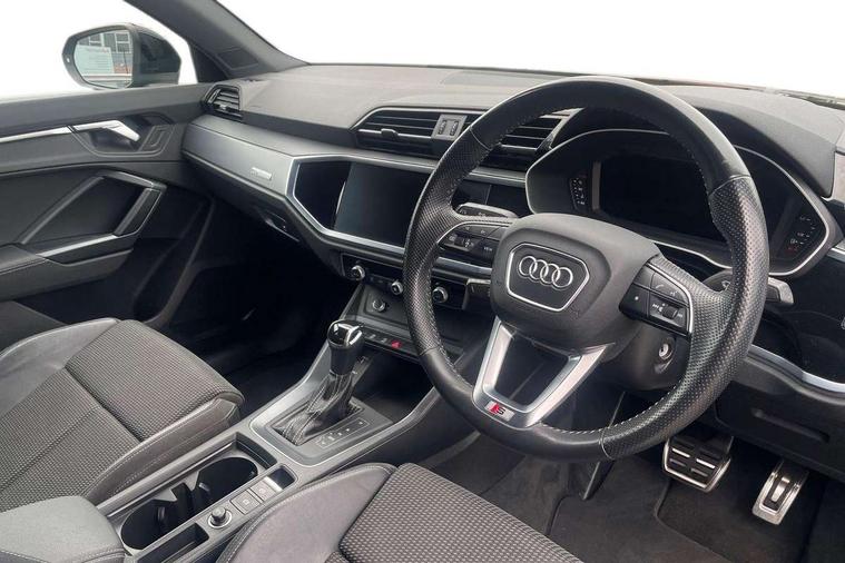 Audi connect safety and service (e-call), Audi drive select, Audi lane departure warning, Audi side assist, Audi smartphone interface includes wireless Apple carplay/Android Auto, Audi Virtual Cockpit - 10.25" display, Bluetooth interface, Camera based traffic sign recognition, MMI Navigation Plus with high resolution 10.1 inch touchscreen colour display, Power operated tailgate, Progressive steering, Service interval indicator, Start stop system with recuperation, Voice control system with natural language interaction, Diesel particulate filter, Sports suspension, 1 x USB type C and 1 USB type A charging points, 6 passive loudspeakers, DAB digital radio module, Acoustic windscreen, Aluminium roof rails, Aluminium window trim, Auto dimming frameless rear view mirror, Body coloured bumpers, Electrically folding, adjustable and heated door mirrors with integrated LED side indicators and kerb view function for passenger side, Front and rear electric windows, Front fog lights, Front side air inlets in matt platinum grey, Front spoiler blade in matt platinum grey, Grille vertical bars in aluminium silver/Matt, High gloss black finish B and C pillars, LED headlights with LED daytime running lights and dynamic rear indicator, LED rear lights, Privacy glass dark tinted rear and rear-side windows (from B-pillar backwards), Rain and light sensors, Rear diffuser strip in matt titanium black, S line badges on front wings, S Line front and rear bumpers, Side skirt insert in matt Platinium grey, Silver chrome grille surround, Titanium black radiator grille, 12V socket in rear centre console, 40:20:40 folding with manual adjustment for 60:40 forwards/backwards position and backrest angle, Adjustable rear seat bench/backrest with centre armrest and cupholder, Black cloth headlining, Dual zone electronic climate control, Front and rear black floor mats with contrast stitching in rock grey, Front and rear headrests, Front and rear roof module including reading lights, Front centre armrest, Glove compartment lighting, Height and reach adjustable steering wheel, Illuminated door sill trims with S logo, ISOFIX child seat mounting for front passenger with airbag deactivation and outer rear seat including top tether attachment point for outer rear seats, Luggage compartment light, Manual front seats with height adjustment, Perforated leather gearknob, Stainless steel luggage compartment sill finisher, Stainless steel pedals, Non smoking pack - Q3, 3x3 point rear seatbelts, 6 airbags - Driver, front passenger, curtain and side windows, Audi pre-sense front with pedestrain and cyclist recognition, Electrically operated child locks on rear doors, Electromechanical parking brake, Electronic stabilisation control including ABS, ASR and EDL, Hill descent control, Hill hold assist, Pre sense basic, Seatbelt monitoring, Tyre pressure warning, Warning triangle and first aid kit, Anti theft alarm, Anti theft wheel bolts, Remote central locking, Dark matt brushed aluminium inlay, Detail dashboard around MMI touch colour display in glass look, black with surround in aluminium look, Leatherette door armrest,
