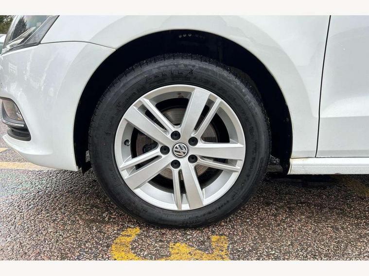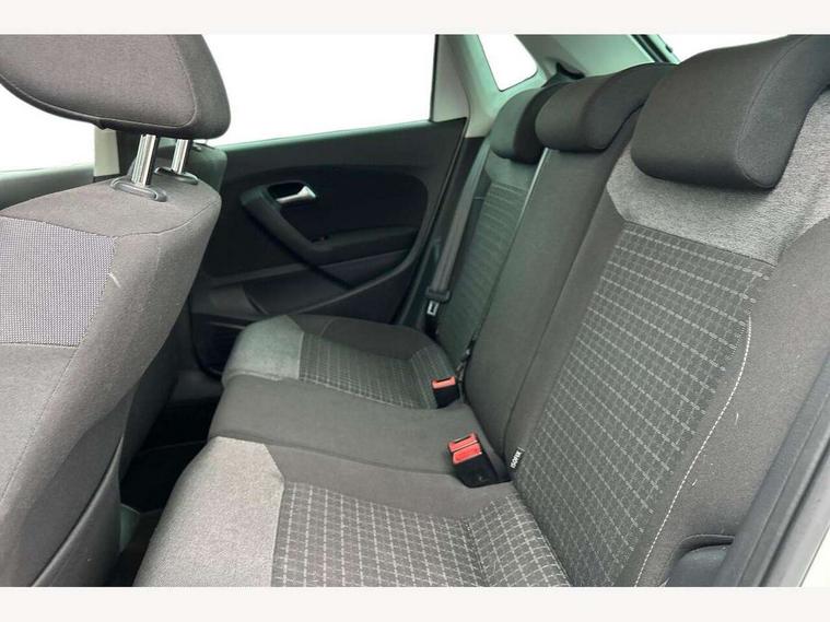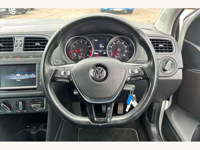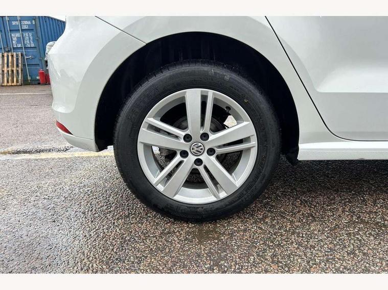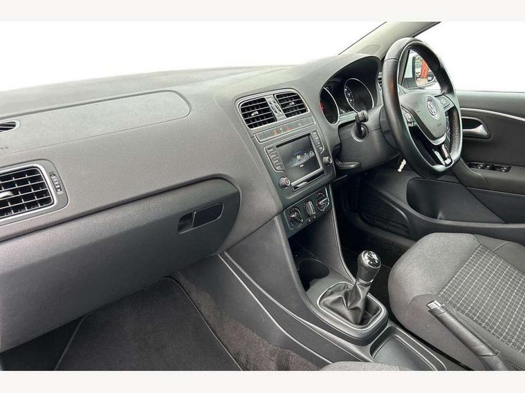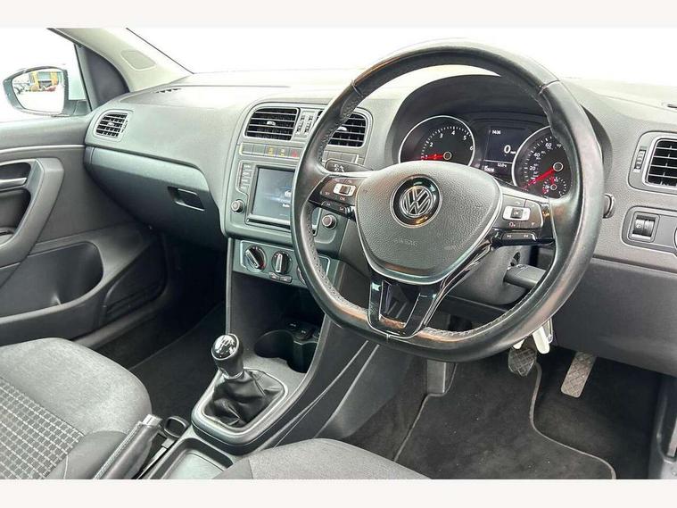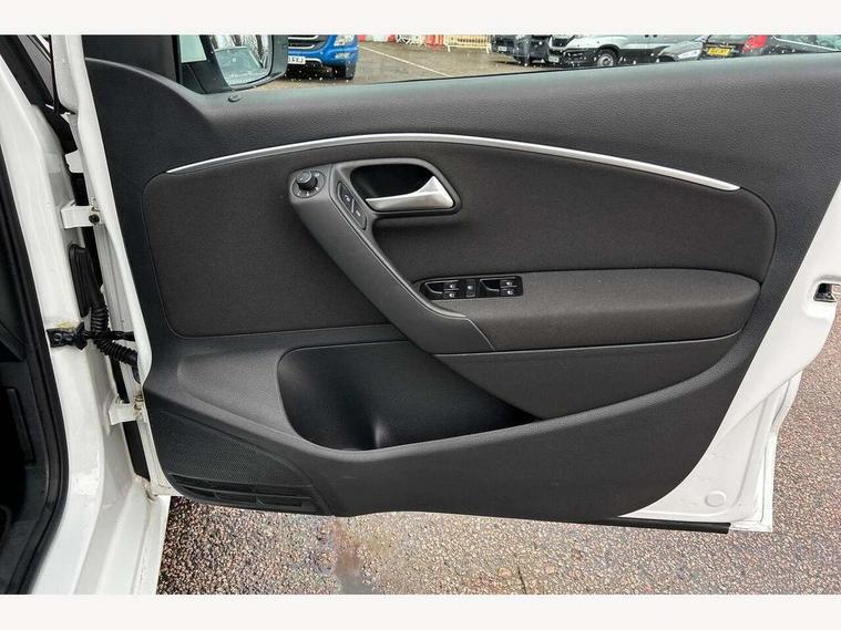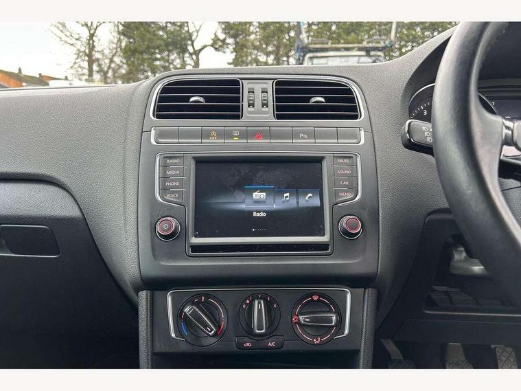 App-Connect, Bluetooth Telephone preparation, Driver alert system, Multi function display, Multifunction computer, PAS - speed related, Service interval indicator, Ultrasonic front and rear optical and audible parking sensors, Warning buzzer and light for front seatbelts unfastened, 6 speakers, Composition media system with radio, glovebox mounted CD, colour touch screen, SD card, aux-in, USB, multimedia interface, DAB Digital radio, Black grille with chrome surround, Body colour bumpers, Body colour door handles, Body colour door mirrors, Body coloured side sills, Chrome trimmed front air intake surrounds, Electric folding door mirrors, Electric front windows, Electric operated/heated door mirrors, Front fog lights with static cornering function, Front wash/wipe with interval delay, Heat insulated tinted glass 65% light absorbing from B pillar back, Heated rear window with auto timer, Rear electric windows, Rear windscreen washer and wiper with interval delay, 12V power socket in centre console, 2 bag hooks in luggage compartment, 2 cupholders, 3 rear head restraints, 3 spoke steering wheel, 4 grab handles, 60/40 split folding rear seat, Centre console storage, Chrome interior door handles, Driver and passenger sunvisors, Driver seat height adjust, Dust/pollen filter, Front door pockets, Front passenger seat height adjust, Front seat backrest storage nets, Front/rear reading lights, Glovebox, Height/reach adjustable steering column, Illuminated vanity mirror, Interior light with delay, Isofix Preparation 2 Rear child seats, Luggage compartment cover, removable, Luggage compartment lighting, Matt chrome gear lever gaiter surround, Multifunction leather steering wheel with leather gear knob/handbrake grip, Storage compartment in front doors, Storage compartment in rear doors, Sunglasses holder, Variable boot floor, Light and sight pack - Polo, 3 point height adj front seatbelts + pretensioners, 3x3 point rear seatbelts, ABS, Automatic post collision braking, Driver/front passenger airbag, Driver/Passenger whiplash optimised head restraints, ESC - Electronic Stability Control + traction control, ESP with EDL + ASR, Hill hold control, Hydraulic Brake Assist (HBA), Tyre pressure monitoring system, Alarm with remote central locking and interior protection, Electronic engine immobiliser, Air vents in Matt chrome, Matt chrome interior trim, 15" steel spare wheel,
