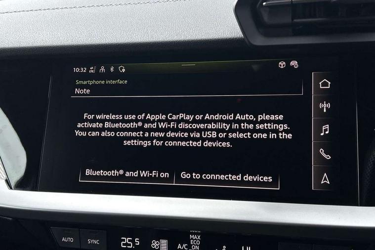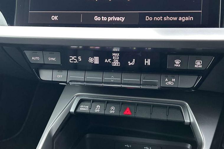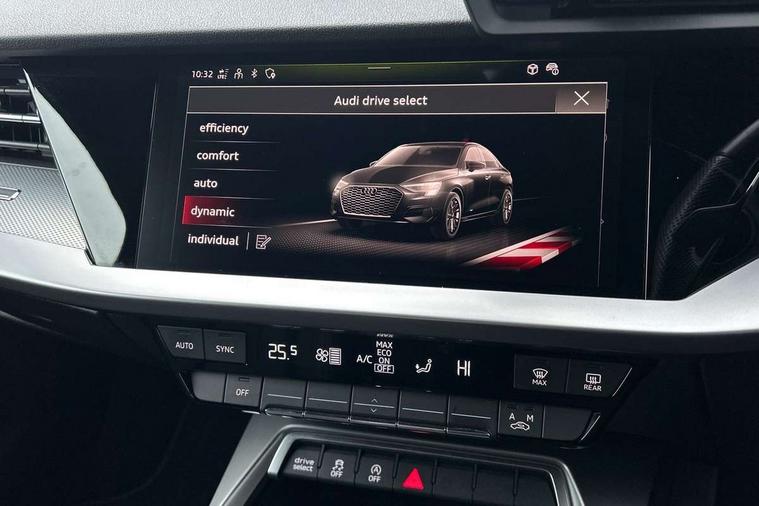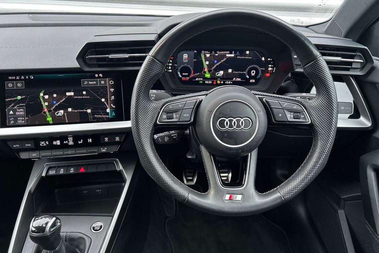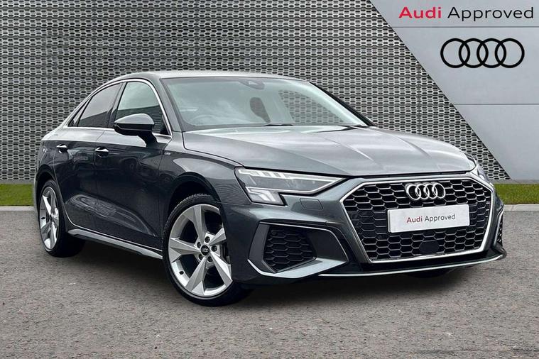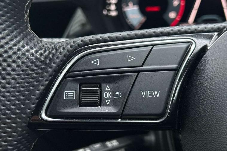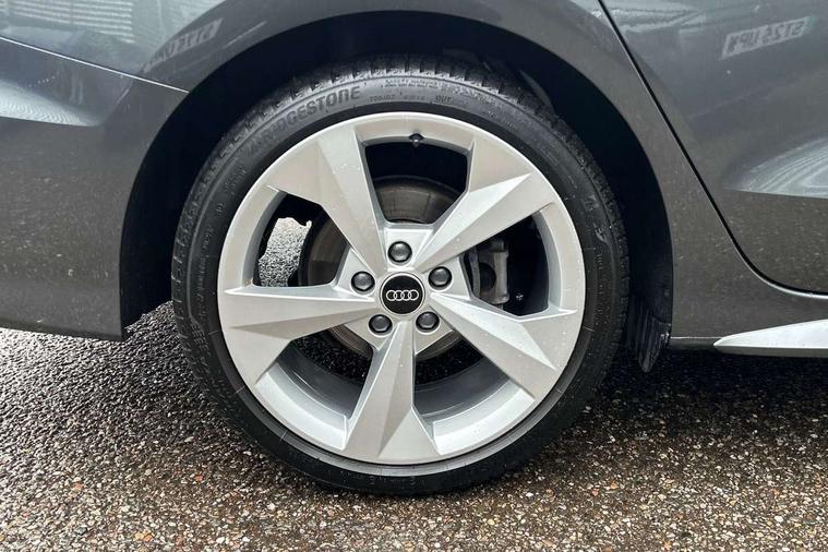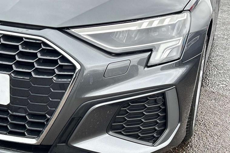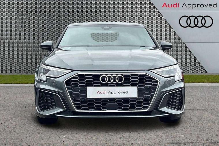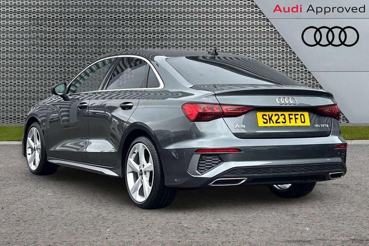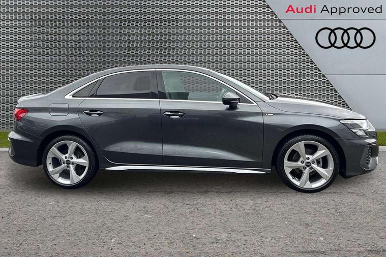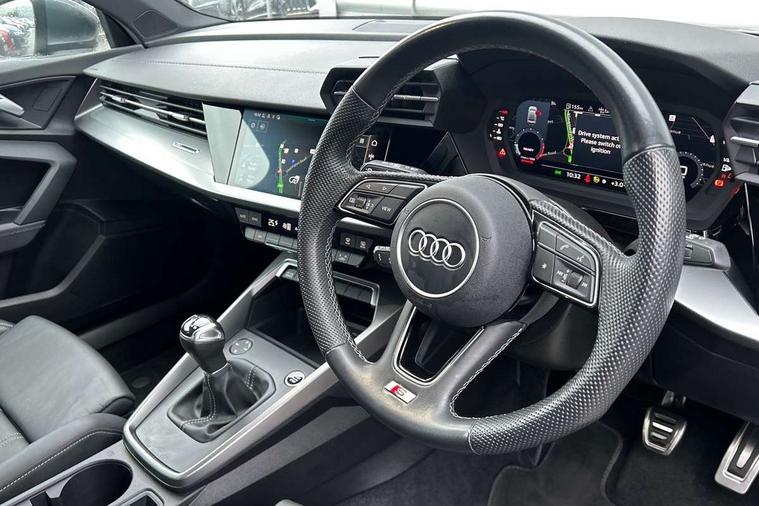 Audi connect emergency call and service, Audi drive select (Auto, Comfort, Dynamic, Efficiency and Individual), Audi smartphone interface, Audi Virtual Cockpit - 10.25" digital and colour instrument cluster, Automatic start/stop system with recuperation, Bluetooth interface, Collision avoidance assistant, Cruise control + speed limiter, Electromechanical power speed sensitive steering, Lane departure warning system, MMI Navigation Plus with high resolution 10.1" colour touch screen display, Rear parking sensors, Service indicator, Voice control system with natural language interaction, Sports suspension, 2x USB Type C ports (for charging and data transfer), 6 passive loudspeakers, CD player, DAB Digital radio, 3rd brake light, Acoustic glass windscreen, Aluminium window trim, Auto dimming frameless rear view mirror, Body colour exterior mirrors, Electrically adjustable/heated/folding/auto dimming door mirrors with integrated LED indications + kerb view function for passenger side, Front electric windows, Illuminated door sills with aluminium inserts at the front with S logo, LED daytime running lights, LED headlights with LED rear lights and dynamic rear indicators, Light and rain sensors, Model and engine designation badges at rear, Privacy glass - dark tinted rear window, rear door and side windows, Rear boot, Rear electric windows, Rear side wing doors, S line bumpers, S roof spoiler, 12V socket and storage compartment in front centre console, 3 seat bench in 2nd row, 3 spoke leather multifunction steering wheel, 40/20/40 split folding rear seat bench with cupholder, Black cloth headlining, Dual zone electronic climate control, Front and rear centre armrest in leather, Front and rear headrests, Front/rear floor mats, Height and reach adjustable steering wheel, Illuminated vanity mirror, Interior lighting - glove compartment light and right hand side, Luggage compartment floor covering, Manual boot compartment lid, Manually adjustable front sport seats, Seat side bolsters, Single front passenger seat, Stainless steel pedals and front footrest in black, Twin leather upholstery with front sports seats S embossed logo, Aluminium interior elements pack - A3, LED interior lighting pack - A3 Saloon, S line styling pack - A3 Saloon, 3x3 point rear seat belts, Driver and front passenger airbag with passenger airbag deactivation, Electronic Stabilisation Control (ESC) including ABS, ASR and EDL, First aid kit with warning triangle and 2 safety vests, Front side airbags with head airbags and interaction airbag, Hill hold assist, Pre-sense front with pedestrian and cyclist detection, Seatbelt monitoring, Tyre pressure loss indicator, Anti theft alarm, Anti-theft wheel bolts, Electronically operated child locks, Immobiliser, Remote control central locking, Aluminium air vent surrounds, Aluminium trim elements, Dark spectrum aluminium inlays, accent surfaces in the dashboard and centre console in platinum grey silk effect paint finish,