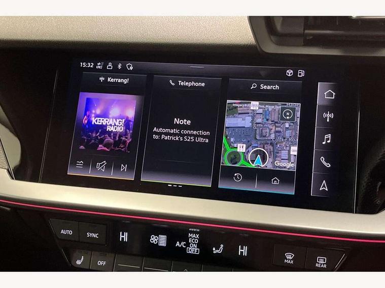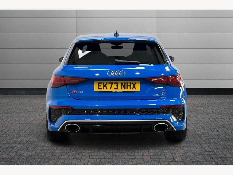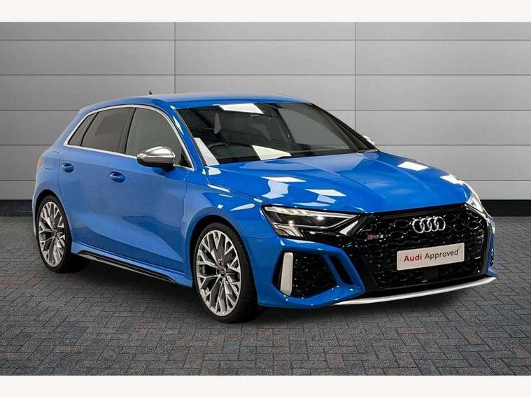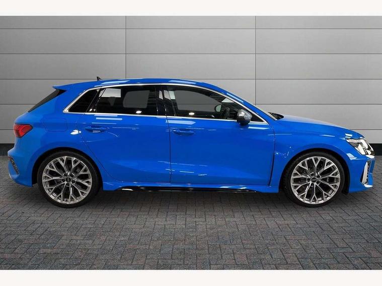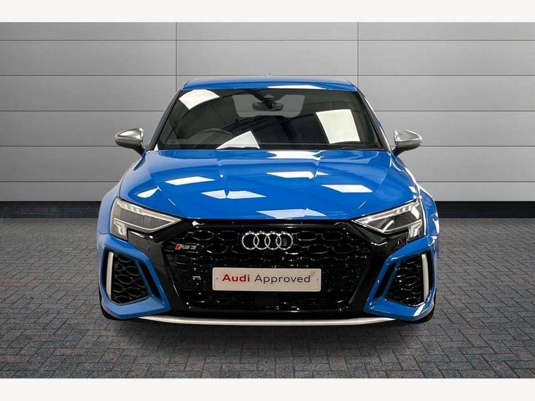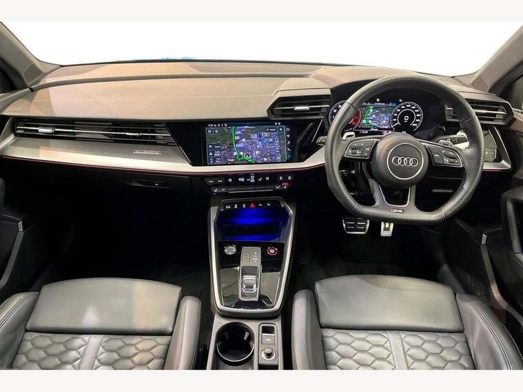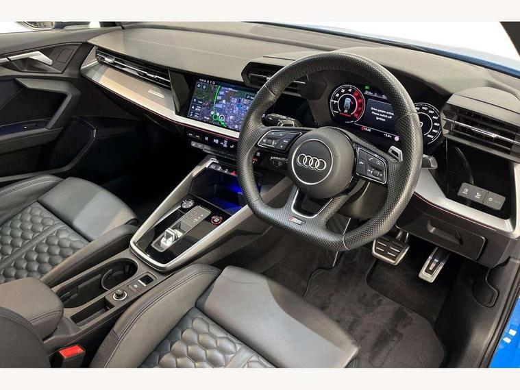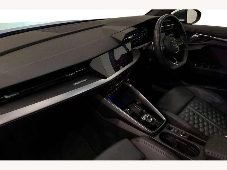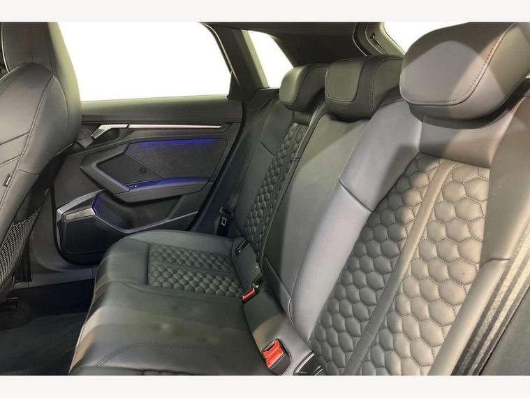 Audi smartphone interface, Audi virtual cockpit with RS specific display 12.3" full colour digital instrument cluster, Automatic start/stop system with recuperation, Bluetooth interface, Collision avoidance assistant, Emergency e-call, Lane departure warning system, Legal emergency call, Manual boot opening, Parking assist with parking system plus, Progressive power assisted steering, Quattro permanent four wheel drive, Rear suspension, Audi sound system impressive sound with 10 loudspeakers including centre speaker and subwoofer, 6-channel amplifier with a total output of 180 watts, DAB Digital radio, 3rd brake light, Acoustic glass windscreen, Audi beam uses LEDs to project the Audi sport logo onto the ground as you exit your RS 3, Auto dimming rear view mirror, Black side skirts, Body colour roof, Daytime running lights, Door mirrors - electrically adjustable, heated, folding and auto dimming on both sides, Headlight washers, LED headlights with LED rear lights + dynamic rear indicators, Light and rain sensors, Matt aluminium door mirrors, Matt aluminium window trims, Privacy glass - dark tinted rear and rear side windows from B-pillar backwards, Rear side wing doors, Rear window wiper and washer system, 3 seat bench in 2nd row, 40/20/40 split folding rear seat bench, Black cloth headlining, Dual zone electronic climate control, Front and rear headrests, Front centre armrest, Front sports seats RS embossed logo, Front/rear floor mats, Heated front seats, Honeycomb stitching and RS embossing, Illuminated door sill trims inlays in aluminium with RS 3 logo, Illuminated vanity mirror, Manually adjustable front seats, RS emblems, Single front passenger seat, Stainless steel pedals and front footrest in black, Aluminium interior elements pack - RS3, Ambient lighting pack - RS3, MMI navigation plus with MMI touch - RS3, RS bodystyling - RS3, Storage Pack - RS3, 3x3 point rear seat belts, ABS/EBD, ASR, Audi pre sense front, Driver/Front Passenger airbags, EDL, ESC - Electronic Stability Control + traction control, Front passenger airbag deactivation, Front side airbags with head airbags and interaction airbag, Hill hold assist, Seat belt reminder with passenger presence detection in rear, Tyre pressure loss indicator, Warning triangle and first aid kit, Anti theft alarm, Anti-theft wheel bolts, Electronically operated child lock, Remote control central locking, Carbon inlays, accent surfaces in the dashboard and centre console in platinum grey silk effect paint finish, 19" 10 Y spoke platinum grey, gloss turned finish alloy wheels, Tool kit, Tyre repair kit,