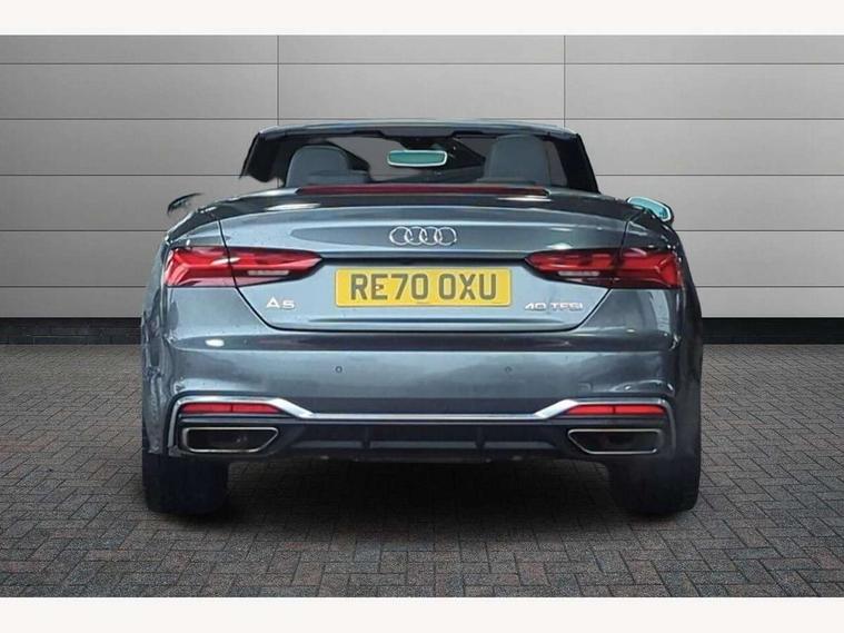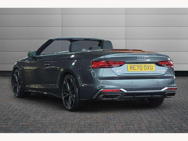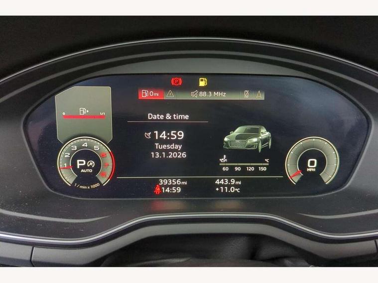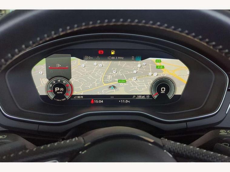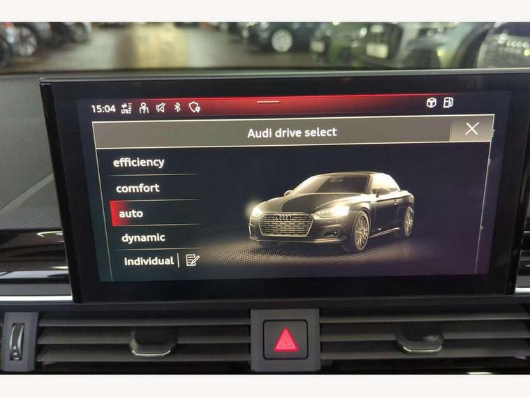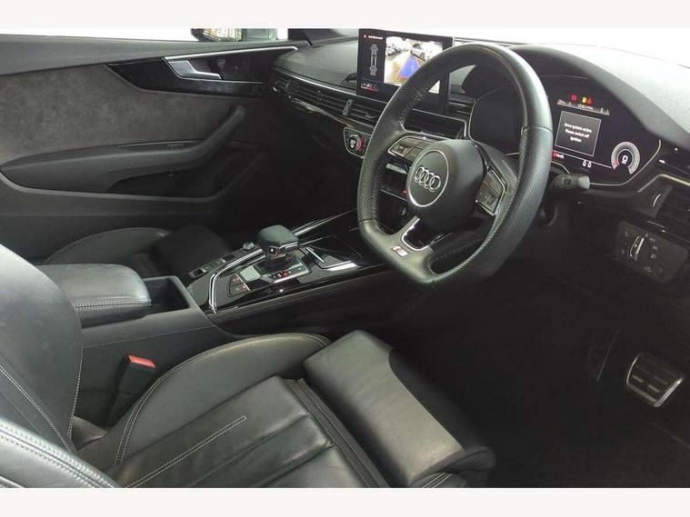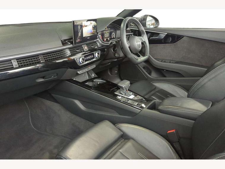 Audi connect safety and service (e-call), Audi drive select (Auto, Comfort, Dynamic, Efficiency and Individual), Audi parking system plus with front and rear sensors, Audi phone box with wireless charging, Audi smartphone interface, Audi virtual cockpit - 12.3" full colour digital instrument cluster, vehicle/engine speed, Radio/media information+Driver assistance systems, Automatic start-stop system with coasting functionality and efficiency programme, Bluetooth interface, Electric boot lid release, Electro-mechanical power steering, Email, calendar and text messages displayed via MMI, MMI nav+ with MMI touch - 10.1" high resolution MMI display, touch sensitive, 3D map, route/country info, dynamic route guide, personal route assist, Rear view camera, Service interval indicator, Voice control system, Sports suspension lowered by 23mm, 8 passive loudspeakers, CD player, DAB digital radio reception, Two additional USB ports for rear passenger in rear centre console, Two SDXC card slots, Auto dimming rear view mirror, Body colour bumpers, Body colour door handles, Body colour front spoiler lip, Body colour side sill trim, Body coloured door mirrors, Electric adjustable heated door mirrors, Electric folding door mirrors, Electric front windows, Front fog lights, Honeycomb structure radiator grille in grained matt black, Matrix LED headlights with Audi laser light, dynamic light sequencing and dynamic indicator, Matt aluminium silver tailpipe trim, Rain and light sensors, Rear diffuser in matt titanium black with trim strip in matt aluminium silver, Side air inlets in grained matt black with matt aluminium silver inlay, Sport front and rear bumpers with side skirts, Towbar preparation, Windscreen with acoustic glazing, 4 way electric lumbar support for driver and front passenger, 50/50 split folding 2 seater rear bench seat, Adjustable steering column, Black cloth headlining, Black perforated leather gearknob, Contrast stitching on seats, steering wheel and gear lever gaiter, Deluxe 3 zone electronic climate control, Electrically adjustable front seats, Fine Nappa leather upholstery with front sports seats S embossed logo, Front centre armrest, Front head restraints, Front/rear floor mats, Heated front seats, Illuminated door sill trim with S logo, ISOFIX child seat mounting and top tether, Luggage compartment mat, Rear headrests, Stainless steel pedals, Sunvisors with vanity mirrors, LED interior light pack - A5/RS5, 6 airbags - Driver, front passenger, curtain and side airbags, Electromechanical parking brake, Electronic Stabilisation Control (ESC) including ABS, ASR and EDL, Front passenger airbag deactivation, Height adjustable front seatbelts, Hill hold assist, Multi collision brake assist, Pop-up bonnet for pedestrian protection, Seatbelt monitoring, Tyre pressure warning, Variable restraint system, Warning triangle and first aid kit, Anti theft alarm system, Anti theft wheel bolts, Immobiliser, Keyless Go, Remote central locking, Piano black finish inlay, 20" 5 twin spoke polygon design alloy wheels in gloss anthracite black and gloss turned finish, Tool kit, Tyre repair kit,