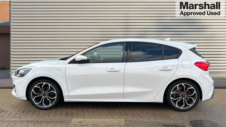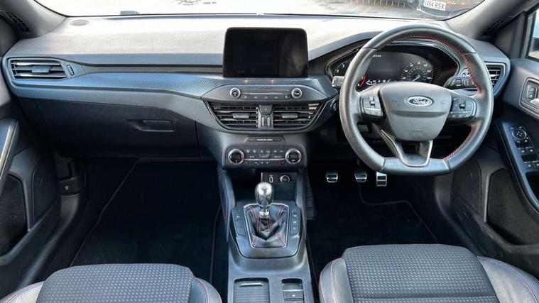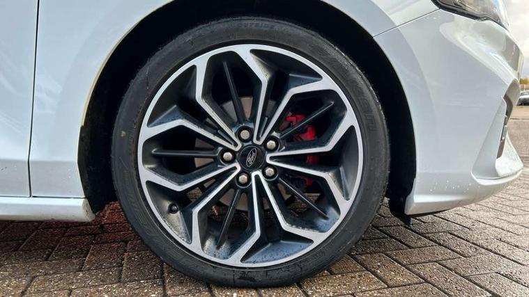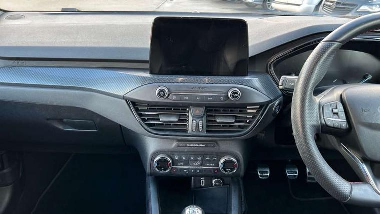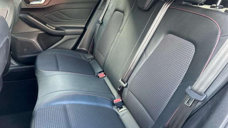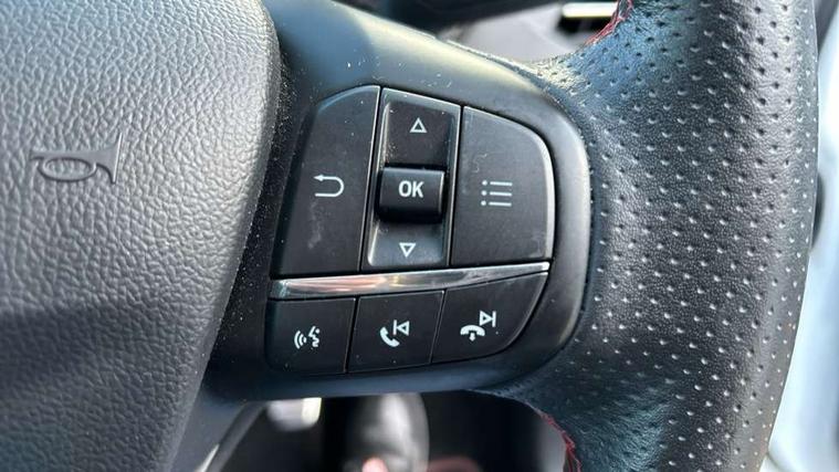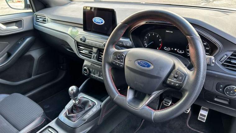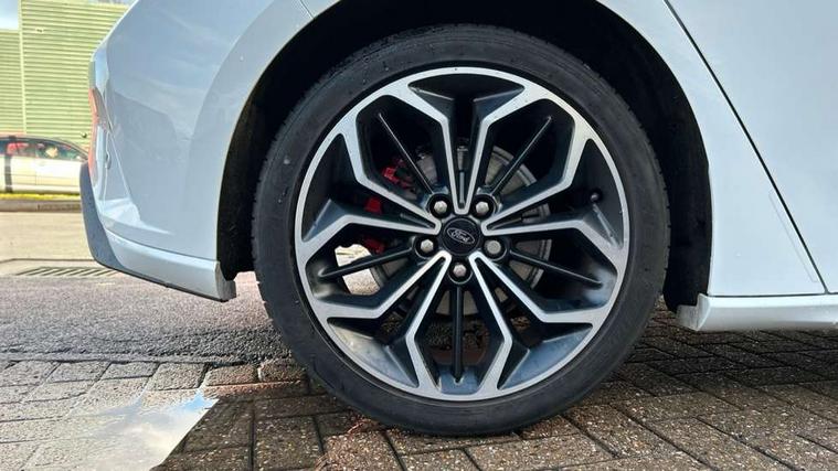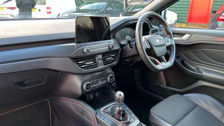 4" TFT coloured cluster screen, Bluetooth system, Digital clock, Easy fuel capless refuelling system, Eco mode, Ford pass connect, Ford SYNC 3 nav system with DAB radio, 8" colour touch screen, voice control, app link, Apple car play/Android auto and 4.2" TFT coloured cluster, Lane keeping aid with lane departure warning, PAS, Selectable drive mode, Trip computer, Sports tuned suspension, 2 USB ports, Aux input, 'Quickclear' heated windscreen/heated washer jets, Auto dimming rear view mirror, Auto headlamps (on/off), Automatic rain sensing wipers, Body colour large rear spoiler, Body colour power folding door mirrors with puddle lights, Body colour side skirt, Body coloured bumpers, Body coloured door handles, Body coloured electrically operated and heated door mirrors with side indicators, Electrically operated front and rear windows with one touch opening and closing, Front variable intermittent wipers with electric wash, Heated rear window, LED daytime running lamp, LED front fog lamps with cornering function, Polished twin tailpipe, Rear privacy glass, ST-Line upper and lower grille with full body styling kit and wing badges, Tailgate wash/wipe, Unique door and instrument panel inserts, 3 spoke flat bottomed leather steering wheel with red stitching, 6 way power adjustable driver seat, 60/40 split back and cushion rear seats with 2 height adjustable headrests, Alloy finish pedals, Aluminium gear knob, Centre console with armrest, Dark headliner, Dual zone electronic air temperature control, Front and rear floor mats with red stitching, Front passenger seat manual height and lumbar adjust, Heated front seats, Height adjustable front headrests, Isofix child seat preparation, Part leather upholstery with red stitching, Reach + rake adjustable steering column, Rear centre headrest, Red stitching on steering wheel, Soft console knee pads with red stitching, ABS+Electronic Brake force Distribution, Auto hold function, Driver airbag, Electronic parking brake, Electronic stability control, Front and rear seatbelt reminder, Front inertia reel height adjustable seatbelts with pre-tensioners, Front passenger airbag, Front side airbags, Hill start assist, Passenger airbag deactivate switch, Post collision braking, Pre collision assist with autonomous emergency braking and pedestrian/cyclist detection, Red brake calipers, Side curtain airbags, Three rear inertia reel lap/diagonal seatbelts, Tyre pressure monitoring system, MyKey system, Remote central locking & engine immobiliser, Thatcham category 1 alarm, Contrast stitching - Red, 18" 5x2 spoke matt black machined finish alloy wheels, Mini steel spare wheel,