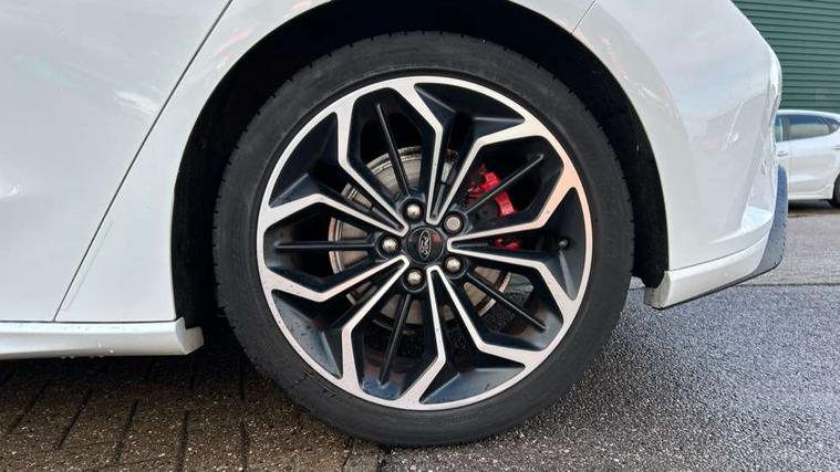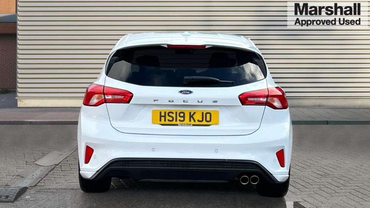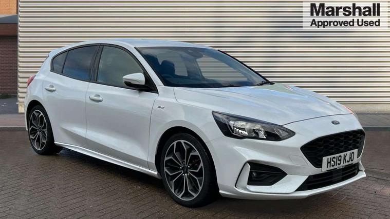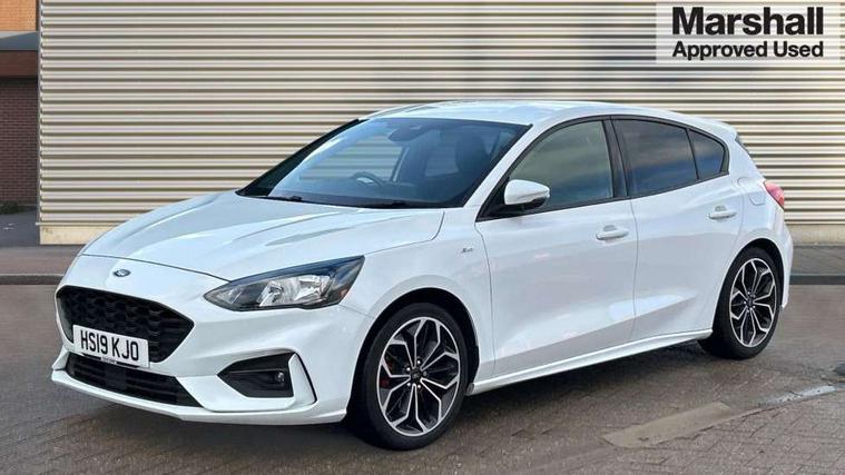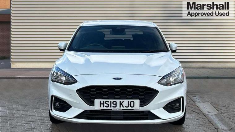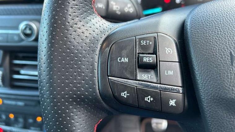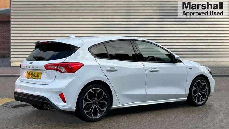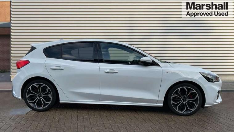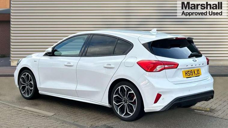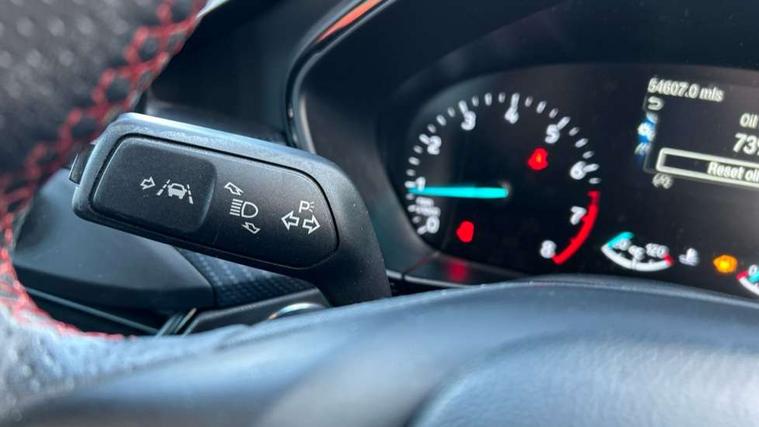 4" TFT coloured cluster screen, Bluetooth system, Digital clock, Easy fuel capless refuelling system, Eco mode, Ford pass connect, Ford SYNC 3 nav system with DAB radio, 8" colour touch screen, voice control, app link, Apple car play/Android auto and 4.2" TFT coloured cluster, Lane keeping aid with lane departure warning, PAS, Selectable drive mode, Trip computer, Sports tuned suspension, 2 USB ports, Aux input, 'Quickclear' heated windscreen/heated washer jets, Auto dimming rear view mirror, Auto headlamps (on/off), Automatic rain sensing wipers, Body colour large rear spoiler, Body colour power folding door mirrors with puddle lights, Body colour side skirt, Body coloured bumpers, Body coloured door handles, Body coloured electrically operated and heated door mirrors with side indicators, Electrically operated front and rear windows with one touch opening and closing, Front variable intermittent wipers with electric wash, Heated rear window, LED daytime running lamp, LED front fog lamps with cornering function, Polished twin tailpipe, Rear privacy glass, ST-Line upper and lower grille with full body styling kit and wing badges, Tailgate wash/wipe, Unique door and instrument panel inserts, 3 spoke flat bottomed leather steering wheel with red stitching, 6 way power adjustable driver seat, 60/40 split back and cushion rear seats with 2 height adjustable headrests, Alloy finish pedals, Aluminium gear knob, Centre console with armrest, Dark headliner, Dual zone electronic air temperature control, Front and rear floor mats with red stitching, Front passenger seat manual height and lumbar adjust, Heated front seats, Height adjustable front headrests, Isofix child seat preparation, Part leather upholstery with red stitching, Reach + rake adjustable steering column, Rear centre headrest, Red stitching on steering wheel, Soft console knee pads with red stitching, ABS+Electronic Brake force Distribution, Auto hold function, Driver airbag, Electronic parking brake, Electronic stability control, Front and rear seatbelt reminder, Front inertia reel height adjustable seatbelts with pre-tensioners, Front passenger airbag, Front side airbags, Hill start assist, Passenger airbag deactivate switch, Post collision braking, Pre collision assist with autonomous emergency braking and pedestrian/cyclist detection, Red brake calipers, Side curtain airbags, Three rear inertia reel lap/diagonal seatbelts, Tyre pressure monitoring system, MyKey system, Remote central locking & engine immobiliser, Thatcham category 1 alarm, Contrast stitching - Red, 18" 5x2 spoke matt black machined finish alloy wheels, Mini steel spare wheel,