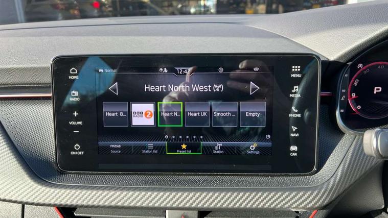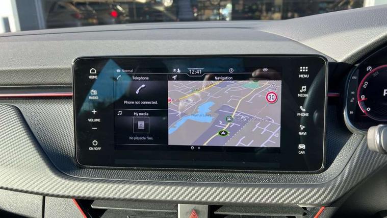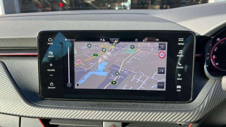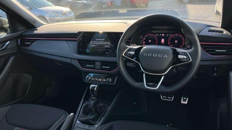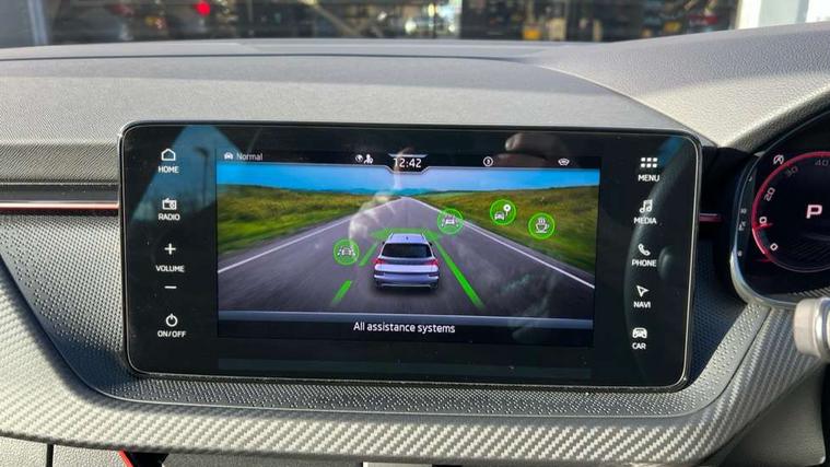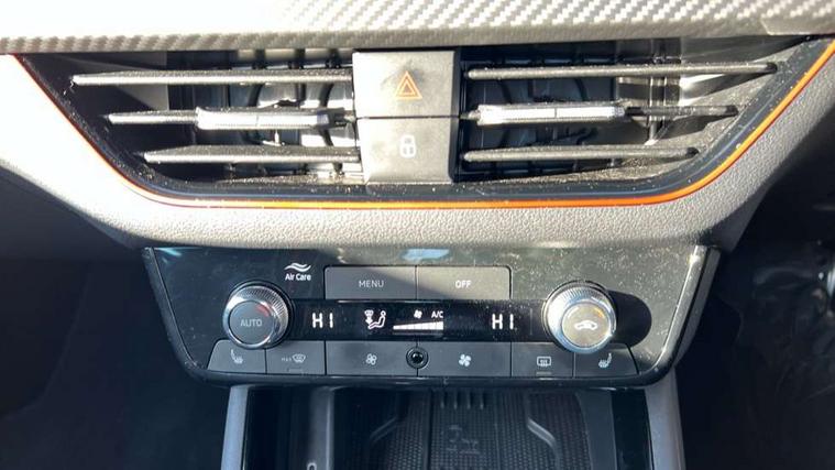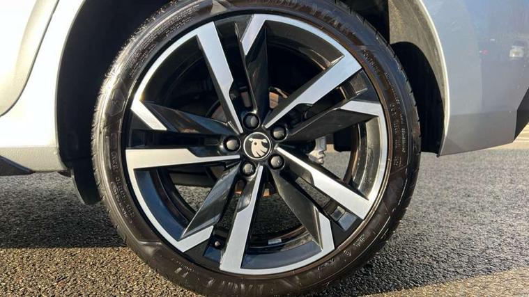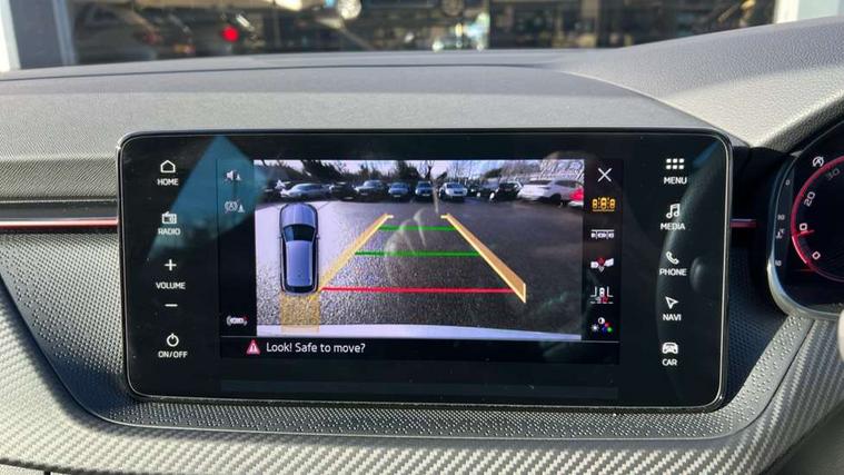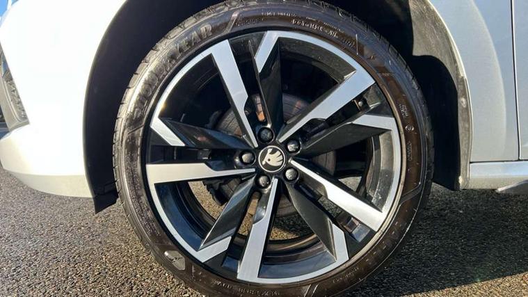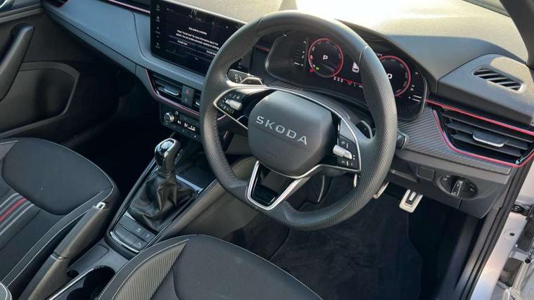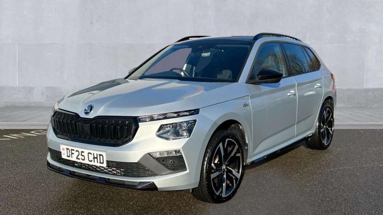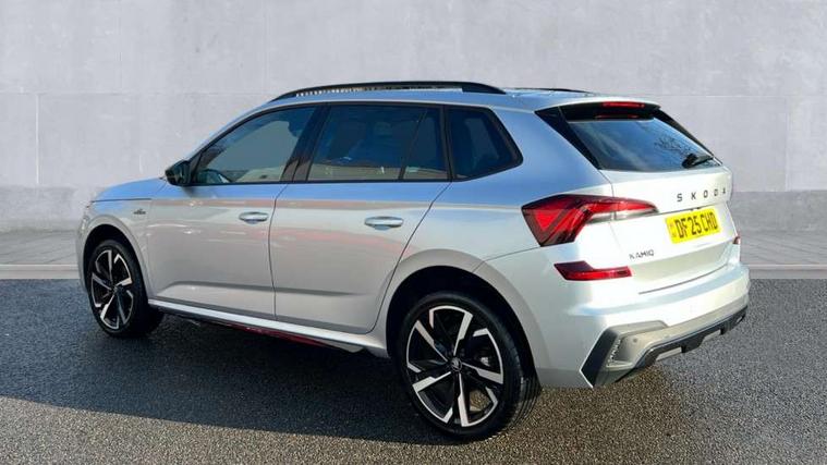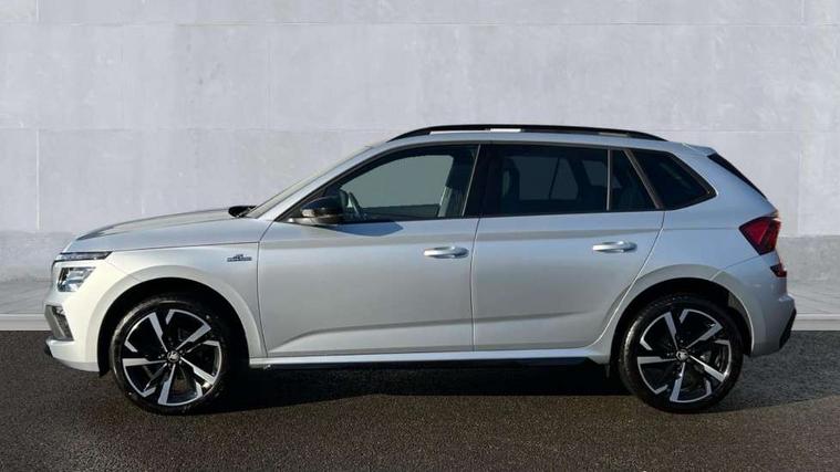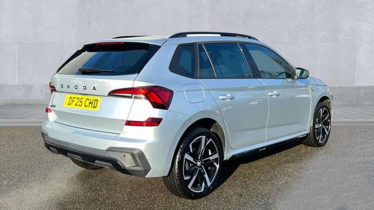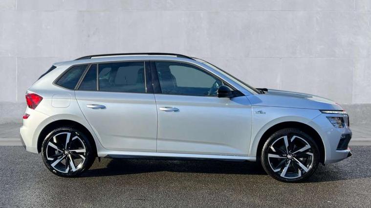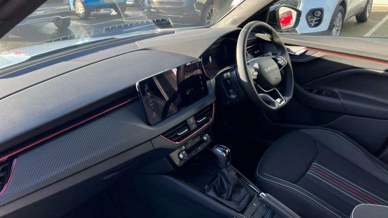 Advanced driver attention and drowsiness monitor, Bluetooth system, E-call, Front assist system, PAS, Rear parking sensors, Rear view camera, Service indicator, Speed limiter, Traffic sign recognition, Virtual cockpit with 10.25" display, Voice control system, Wireless smartlink, 4 USB C ports, 8 Speakers, 9.2" Skoda navigation display, DAB Digital radio, Auto dimming rear view mirror, Automatic headlight control with coming home and leaving home feature, Black door mirrors, Black radiator grille, Black rear diffuser, Black roof spoiler, Body colour bumpers, Body colour door handles, Boot lettering in black, Extended tailgate glass, Fixed panoramic sunroof with black roof rails, Front and rear electric windows, Heated rear window, LED daytime running lights, LED high beam, LED low beam, LED third brake light, Light sensors, Monte carlo plaque, Privacy glass, Rear side wing doors, Rear wiper, Ticket holder inside windscreen, 12V socket in luggage compartment, 3 seat bench in 2nd row, Aluminium pedals, Ambient lighting in white/red, Art leather carbon decor inserts, Art leather carbon door inserts, Black roof lining, Cargo elements, Chrome inner door handles, Driver and passenger sun visors with vanity mirror, Dual zone climate control, Front and rear roof lights, Front centre armrest, Front head restraints, Glove compartment with illumination, Height adjustable driver seat, Height adjustable front passenger seat, Ice scraper, Inner circulation control with pollen filter, ISOFIX on front passenger seat, Isofix preparation for back seats, Leather gearknob and handbrake lever, Manual lumbar support for front seats, Monte Carlo cloth upholstery, Net package and top tether hooks in boot space, Net under rear shelf, Pocket on the back of both front seats include mobile phone pockets, Rake/reach adjustable steering wheel, Reading lights, Rear centre armrests, Red hotstamping, Single front passenger seat, Sports seats, Textile floor mats, Third rear headrest, Top tether for front passenger seat, Umbrella in driver's door, Light and view plus package - Kamiq, 3x3 point rear seatbelts, Airbags - driver and front passenger, Disc brakes, ESP, Extended and predictive pedestrian/cyclist protection, Front passenger airbag deactivation switch, Front side airbags with curtain airbags, Hill hold control, Manual leather parking brake, Manual rear child locks, One tone horn, Seatbelt reminder for driver an co-driver, Traction control, Tyre pressure monitor, Anti-theft alarm system with interior monitoring, backup horn, towing protection and remote central locking with SAFE system, Anti-theft wheel bolts, Electronic engine immobilizer, 18" Ursa black diamond cut alloy wheels,