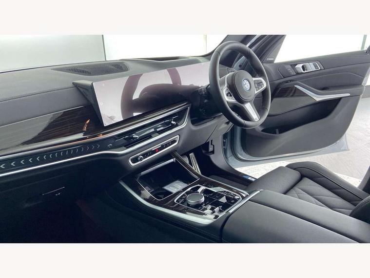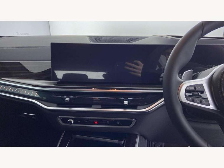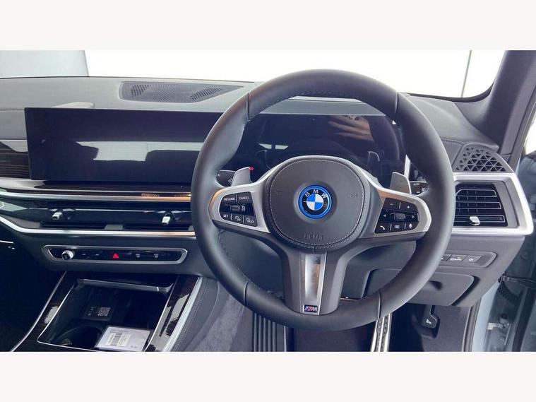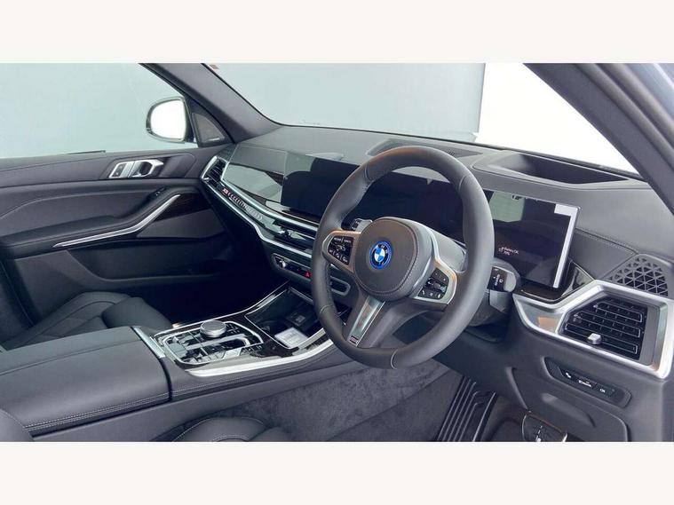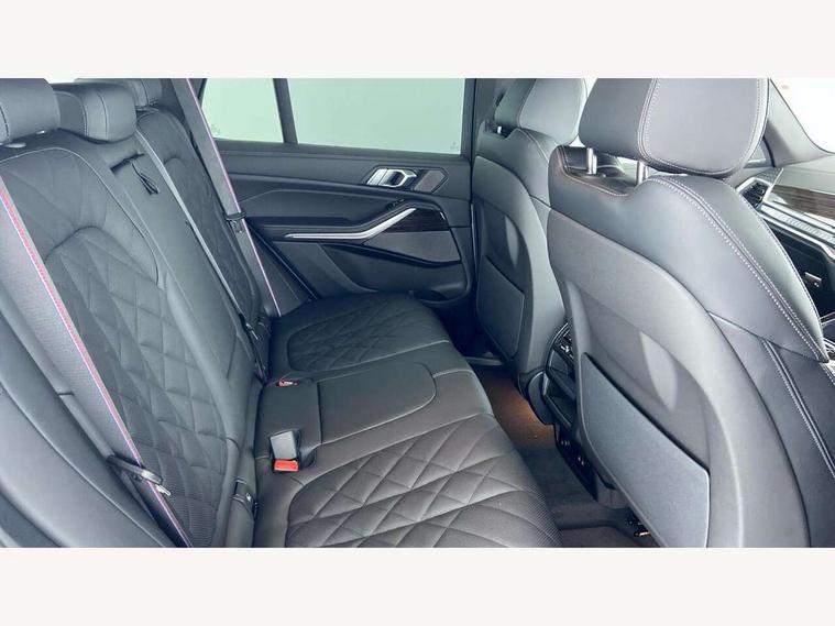 Attentiveness assist, Automatic tailgate operation, BMW ConnectedDrive online services, BMW live cockpit + with curved 12.3 instrument cluster/14.9 central display, nav/Tuner with diversity reception, RDS/4GLTE/remote software upgrade, BMW Teleservices, Condition based service, Cruise control with brake assist, eCall emergency call system, Enhanced bluetooth with wireless charging, Integrated owner's handbook, PAS, Speed limiter, Wi-Fi hotspot, AC Fast charging preparation (Maximum charging power 11kW), Adaptive 2-axle Front and rear air suspension, Drive performance control with ECO PRO comfort + sport mode, Eight speed steptronic sport automatic transmission and gearshift paddles on the steering wheel, Adaptive LED Headlights, Front and rear electric windows, High beam assistant, High gloss black shadow line roof rails, LED daytime running lights, Rain sensor, Rear side wing doors, Third brake light in rear spoiler, Variable intermittent rear wash/wipe, 12V - Power sockets with 2x centre console and 1x luggage compartment, 3 seat bench in 2nd row, Entry sills illuminated BMW inscription front and rear, Foldable rear centre armrest with 2 cupholders and storage compartment, Front and rear side armrest integrated into door trim, Grab handles in 1st and 2nd row of seats with Integrated in headliner, at rear with coat hooks, plastic, Headrests for all seats, Luggage compartment separating net, Lumbar support with height and depth adjustment in backrest, Single front passenger seat, Sunvisors with illuminated vanity mirrors and ticket pocket, Three spoke sport M leather steering wheel, Velour floormats, Ambient light interior pack - X5, Driving assistant pack with radar based driver assistance system - X5, Expanded exterior mirror pack - X5/X5 M, M aerodynamics pack - X5, Parking assistant pack - X5, 3 rear seatbelts, Acoustic protection for pedestrians, Active protection, Airbags - driver/front passenger, rear and side, first and second row seats head airbags, front passenger seat airbag deactivation + knee airbag, Anti-lock braking system (ABS), Automatic Stability Control (ASC), Brake energy regeneration, Cornering brake control (CBC), Crash sensor activating central locking release, hazard warning lights, fuel cut off, interior lighting + activation of safety battery terminal clamp, DSC - Dynamic Stability Control, Dynamic Traction Control - DTC, Electromechanical parking brake with automatic drive away release and auto hold function, Electronic brake force distribution, Hill start assistant, M Sport blue painted brake calipers with 'M' designation, Mechanical child proof lock on rear doors, Tyre pressure monitoring system, Tyre pressure sensors, Ventilated front and rear disc brakes, Warning triangle and first aid kit, Alarm system, Closing system with central locking, Comfort access system, Locking wheel bolts,