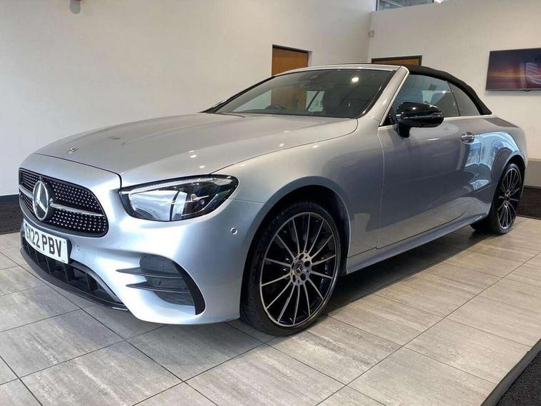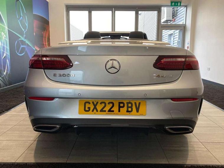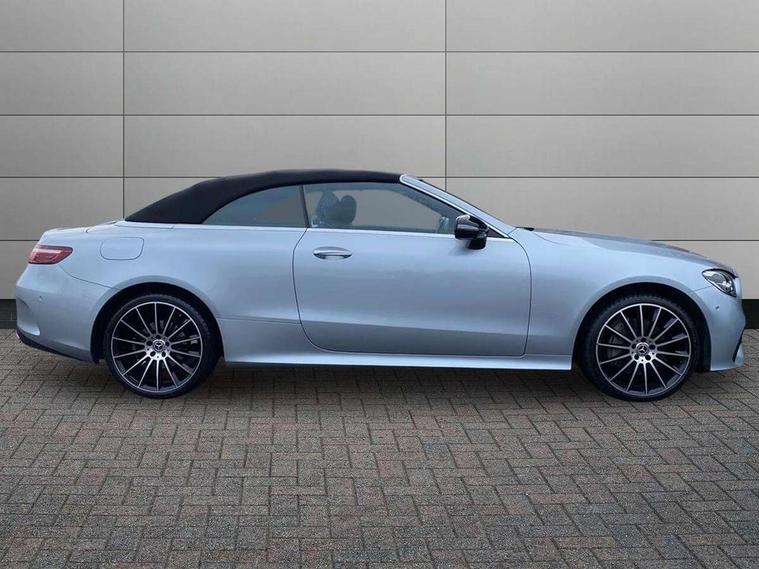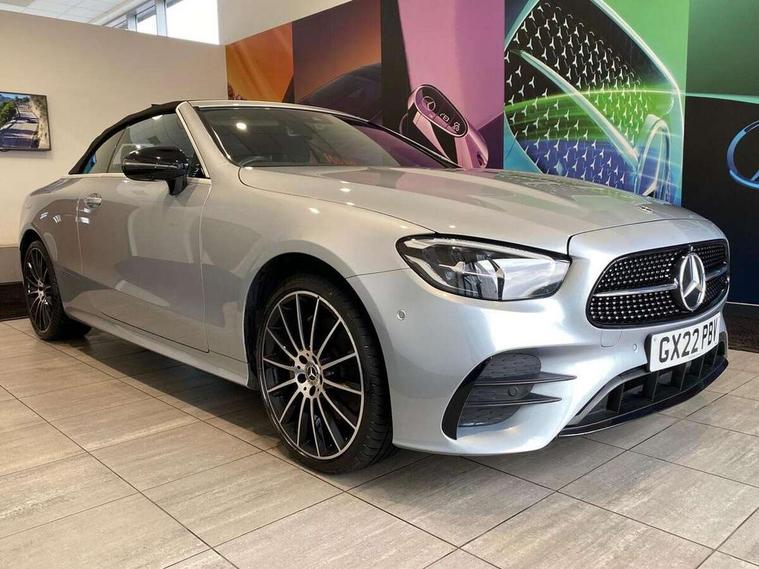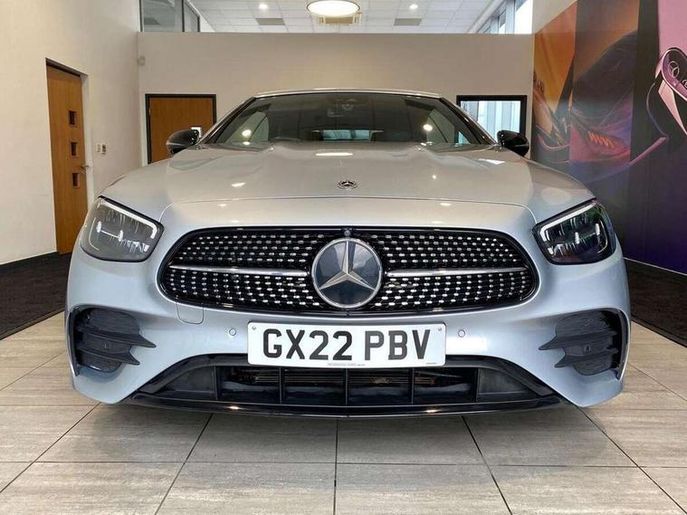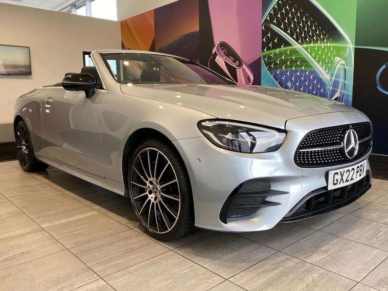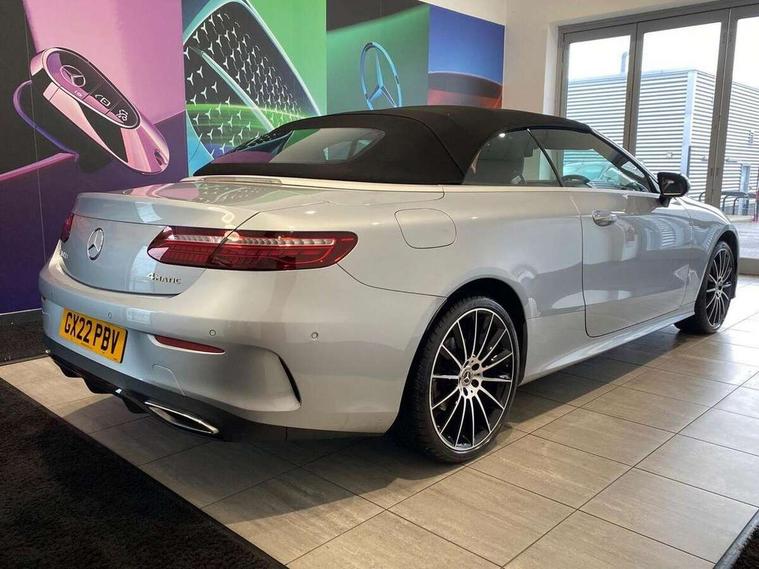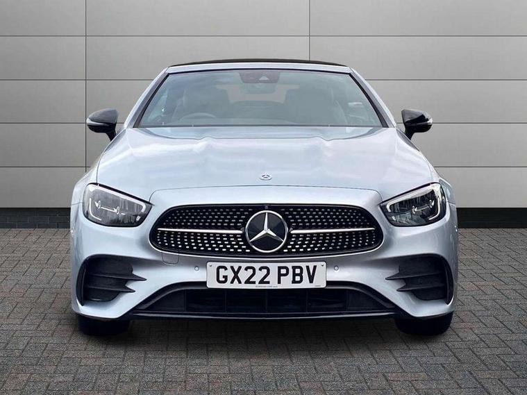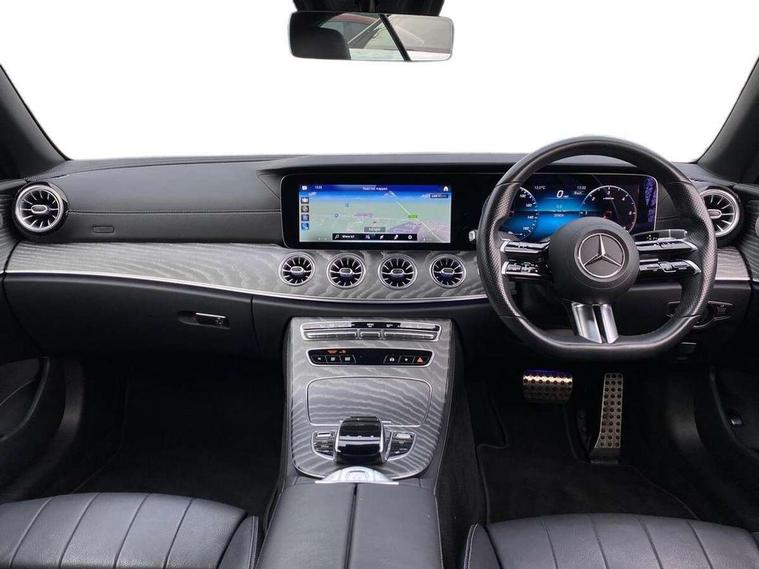360 degree parking camera, Active parking assist including front and rear parking sensors, Analogue clock, Attention assist, Automatic boot separator, Brake wear warning display, Cockpit display 12.3" widescreen digital instrument cluster, Collision prevention assist plus, Direct steer speed sensitive steering, DYNAMIC SELECT with a choice of driving modes (ECO, Comfort, Sport, Sport+ and Individual), E-call, ECO start/stop function, Hey Mercedes Voice activation, High resolution 12.3" multimedia colour display, Mercedes connect me, Outside temperature display, Pre-installation for Vehicle Monitoring, Pre-installation for Vehicle Setup, Remote boot release, Service indicator (ASSYST), Status display for rear seat belts in instrument cluster, Touchpad with controller, Traffic sign assist, Trip computer in multifunction display showing current fuel consumption, 14 litre AdBlue tank, 66 litre fuel tank, 9G TRONIC 9 speed automatic transmission, Agility control sports suspension with selective damping system, Diesel particulate filter, Incorrect fuelling protection, 2 USB ports in centre console, 2 USB ports in the rear, Burmester surround sound system with 13 speakers and a 9 channel amplifier with total output of 590 watts, MBUX multimedia system with DAB digital radio and touchpad including satellite navigation, Smartphone integration via Android Auto/Apple CarPlay, Media Interface, USB and Bluetooth interface and touchpad with control wheel, Acoustic soft-top with enhanced climate and noise comfort, Adaptive brake lights, AIRCAP wind deflector and draught stop, AMG bodystyling front and rear aprons in polished aluminium, AMG boot lid spoiler in body colour, Body colour door handles, Body coloured bumpers, Daytime running lights, Diamond radiator grille with integral star and single louvre in high gloss black, Electric windows with one touch opening/closing and obstruction sensors, Exterior mirrors heated and electronically adjustable, High gloss black exterior mirror housing, High gloss black front apron, High gloss black rear bumper with chrome trim, Illuminated front door sill panels with Mercedes-Benz lettering, LED high performance headlamps, Magic Vision Control heated windscreen wiper system, Radio aerial integrated into rear window, Rain sensing windscreen wipers, Rear boot, Rear LED lights, Third brake light, Top surround of side windows in polished aluminium, Visible twin pipe exhaust system integrated into bumper, Waistline in polished aluminium, 2 seat bench in 2nd row, 3-spoke flat bottom multifunction AMG steering wheel with Touch Control buttons, trimmed in black nappa leather, 50/50 split folding rear seat, Airscarf - neck level heating, Artico man-made leather upper dashboard and beltlines with contrast stitching, Automatic child seat recognition sensor, Belt feeder driver and front passenger seat belt automatically positioned within easier reach, Black door pins, Black roof lining, Central stowage compartment with 12 V socket in centre console, Central stowage compartment with USB socket for use with Android Auto and Apple CarPlay, Centre armrest and door handle illumination, Centre console in grey open-pore ash wood, Floor mats with AMG lettering, Front and rear door pockets, Front centre armrest with stowage compartment, Front footwell lights, Glasses compartment in overhead control panel, Glove compartment - lockable, air conditioned and illuminated, Head restraints for driver and front passenger (four-way adjustability) and in rear (two-way), Heated front seats, Interior lighting - 64 colour Ambient lighting, Interior rear light/integral reading lights, Isofix rear child seat fastenings, Leather upholstery, Multi contour front sports seats, Seat occupancy sensor for front passenger seat, Single front passenger seat, Sports pedals in brushed stainless steel with black rubber studs, Steering column manually adjustable for height and reach, Steering wheel gearshift paddles, Sunvisors with illuminated vanity mirrors, THERMOTRONIC automatic climate control system with 3 climate zones, Memory pack - E Class, Mirror pack - E Class, Night package - E Class, Seat comfort pack - E Class, Stowage pack - E Class, 2 x 3-point rear seatbelts, Active bonnet pedestrian safety measure which detects an impact and raises bonnet, Adaptive brake system with HOLD function and brake drying in the wet, Adaptive driver and front passenger airbags, Airbags - sidebag for driver and front passenger with combined thorax/pelvis bag, Anti-lock braking system (ABS), Drivers knee airbag, Electric parking brake, Electronic Stability Programme, Front and rear window airbags, Head airbags, Hill hold function, Perforated front brake discs with "Mercedes-Benz" lettering, Seatbelt warning, Tyre pressure monitoring system, Warning triangle and first aid kit, Alarm system/interior protection/immobiliser, Central locking with interior switch, automatic locking and crash sensor with emergency opening function, Chrome surround electric key, Keyless Go entry and starting function, Open-pore grey ash wood trim, 20" AMG multi spoke design alloy wheels painted in high gloss black with high sheen finish, Run flat tyres,