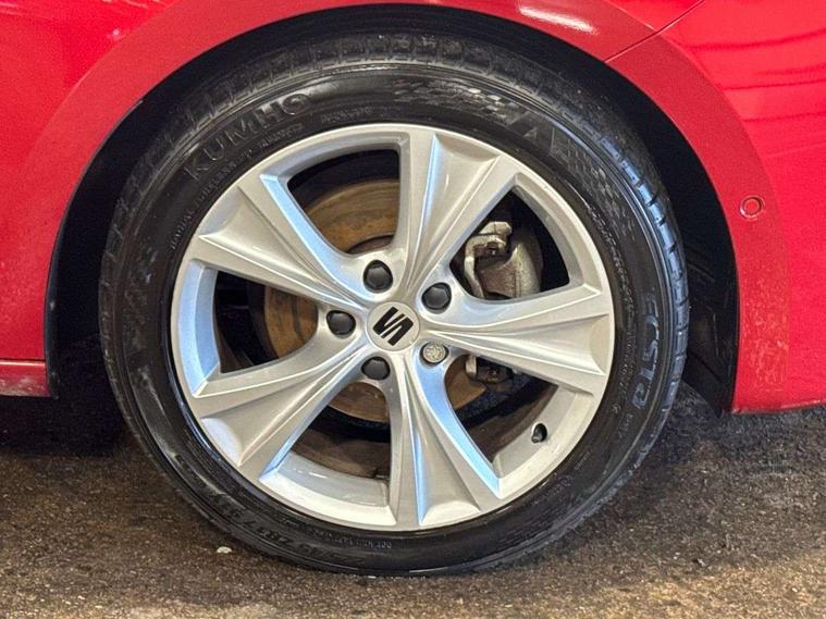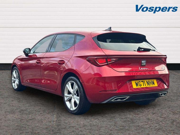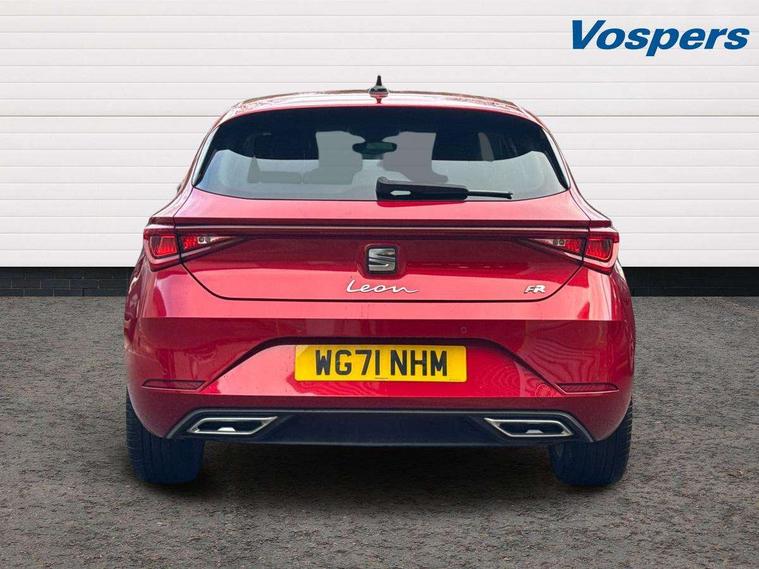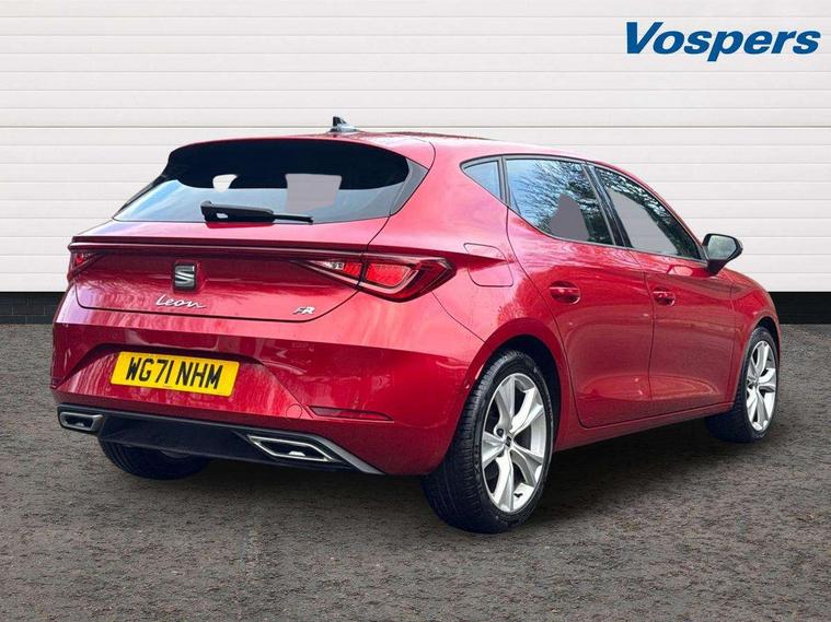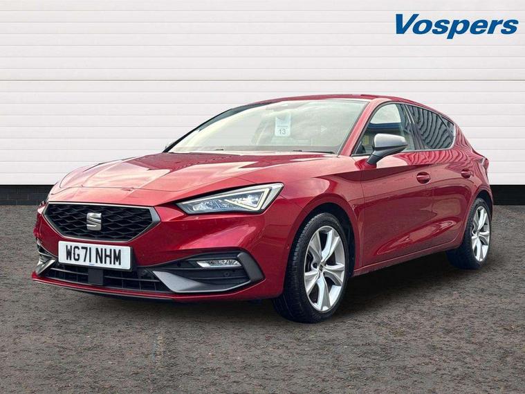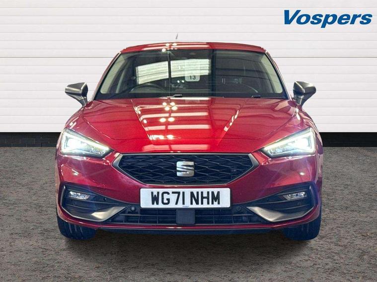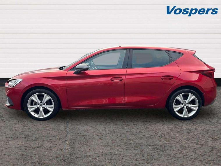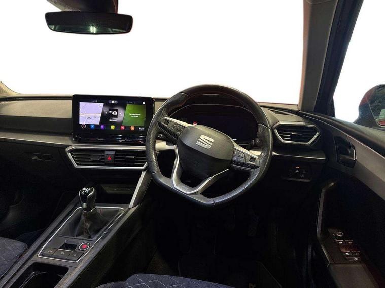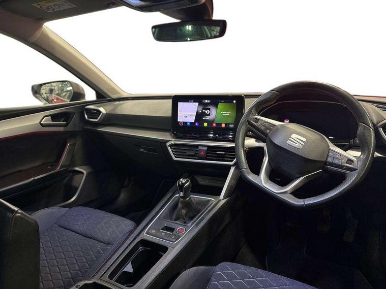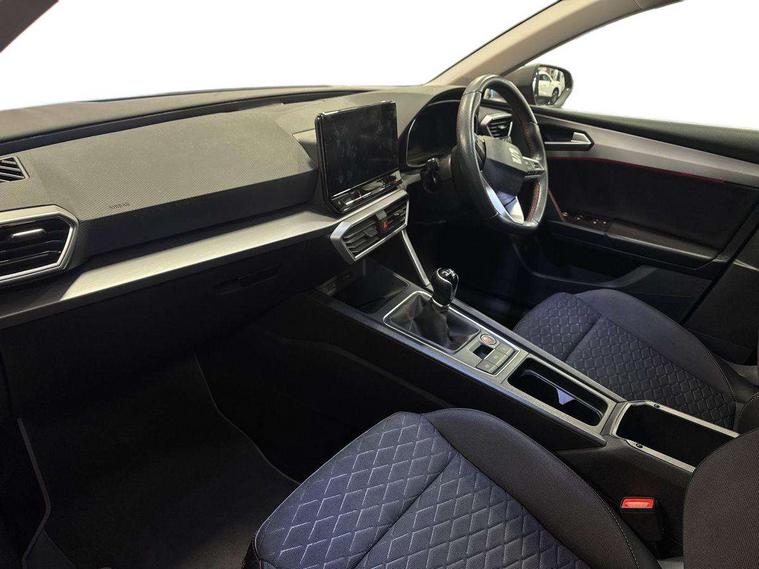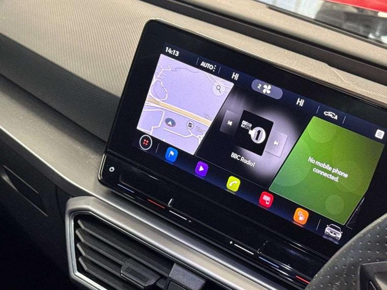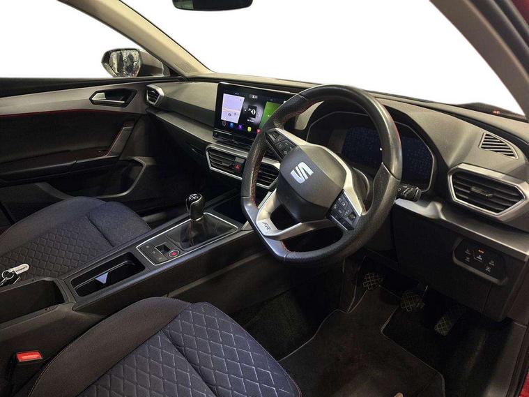 Digital cockpit, E-call, Front assist with forward collision warning braking reaction to vehicles, pedestrians and cyclists, Full link smartphone integration with Mirror Link, wireless Apple CarPlay and wired Google Android Auto, Lane assist, Lockable tailgate, Park assist (inc front/rear parking sensors), Power assisted speed sensitive electro-mechanical steering, RPM, trip computer, outside temp gauge, instrument light brightness, low fuel warning light, lights on reminder, gearshift indicator, SEAT drive profile with 4 modes (Eco/Normal/Sport/Individual), throttle response, Service interval indicator, Start/stop system with regenerative braking, Sports suspension, XDS electronic differential lock and dynamic traction support, 7 speakers, Auxiliary input socket, Auto dimming rear view mirror, Body colour door handles, Body coloured bumpers, Cosmo grey exterior mirrors with integrated LED indicators, Dark tinted rear windows, Electric front/rear windows, Electrically adjustable, heated and folding door mirrors, FR sports bumper, Illuminated front door sill, LED front fog lamps with cornering function, LED headlights and tail lights with dynamic turn signals, welcome light silhouette from exterior mirrors and dynamic headlight range control, LED rear fog lamp, Rain sensing wipers, Rear side wing doors, Rear wash/wipe, Separate daytime running light with automatic headlight control and coming home feature, Third brake light, 12v power point in centre console, 3 seat bench in 2nd row, 60/40 split rear bench seat with armrest, Ambient lighting with glovebox, footwell and single monocolour, Cloth upholstery, Driver/passenger manual seat height adjustment, Dust/pollen filter, Flat bottomed perforated leather steering wheel with red stitching and FR logo and leather gear stick, Folding boot cover, Four x USB Type C ports, Front and rear height adjustable headrests, Front and rear reading lights X 4, Front centre armrest, Front seatback storage pockets, Height/reach adjust steering wheel, ISOFIX points in outer rear seats with top tether anchorage points, Luggage tie-down hooks, Lumbar adjustment for front seats, Single front passenger seat, Sunvisors with covered illuminated mirror, Three zone climate control, Media system plus with navigation - Leon, 3 point seatbelts on all rear seats, ABS, Brake control system - ESC and brake booster, Child proof door locks, Driver and front passenger airbags with front passenger airbag de-activation, front side and curtain airbags, Electronic parking brake, Extended safety system - seat belt tensioner, window closure and hazard lights, Hill hold control, Rear disc brakes, Seat belt reminder for front and rear seats, Tiredness recognition system, driver alert system, Tyre pressure monitoring system, Anti theft alarm system with interior monitoring in cab, backup horn and towing protection, KESSY Go (Keyless start), Locking wheel bolts, Wireless phone charging, Chrome interior detailing, 17" Dynamic Bi-spoke alloy wheels with 91W tyres, Tool kit,