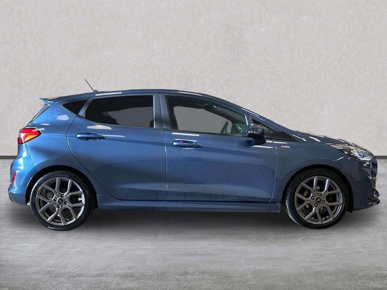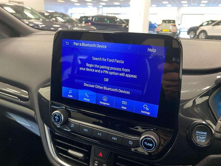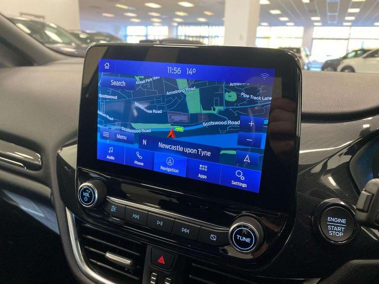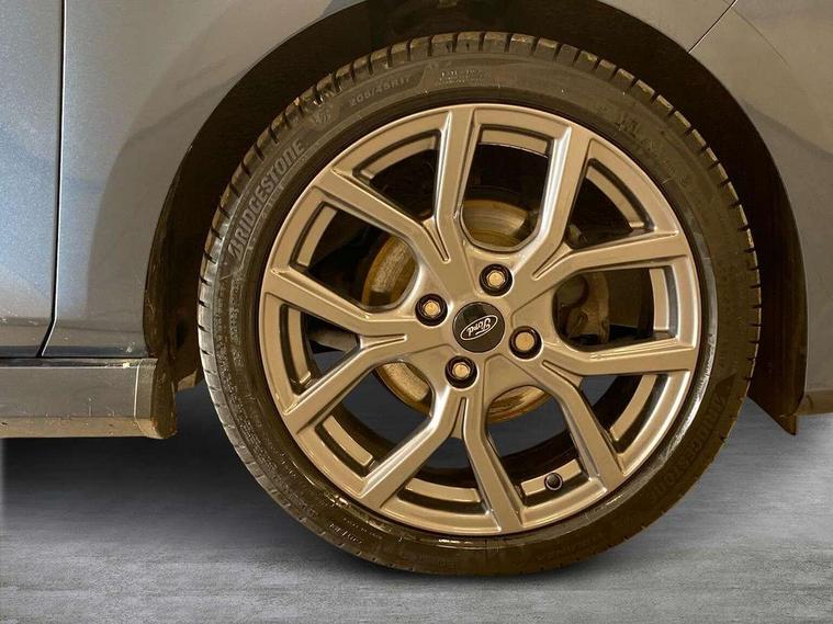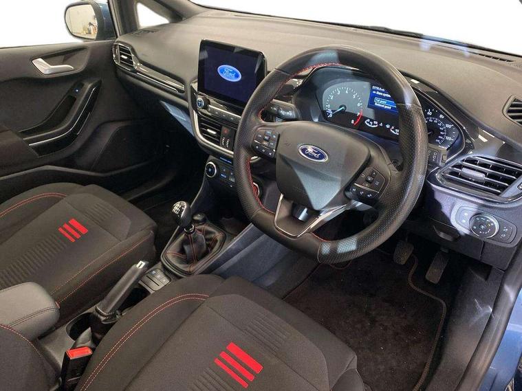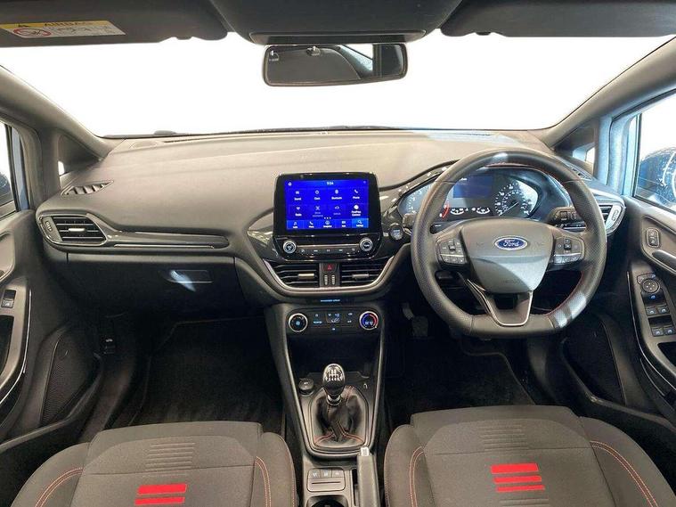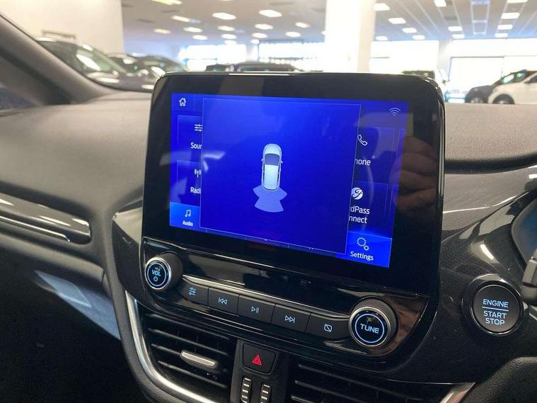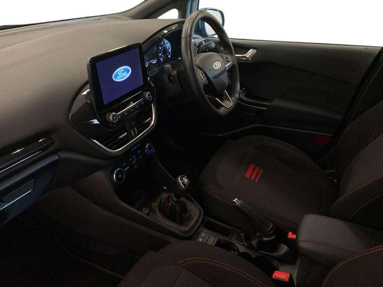 4.2" Colour TFT Ice blue illumination analogue cluster, Driver alert system, Electric power steering, Ford easy fuel, Lane keep assist, Lane keeping aid, Rear parking distance sensors, Selectable drive modes (Normal, Sport, Track), Trip computer, Sports suspension, 3rd brake light, Auto high beam, Automatic headlights, Body colour bumpers, Body colour large rear spoiler, Body coloured electrically operated with side indicators, Electric front windows/one touch facility, Electric rear windows, Quickclear heated windscreen, Rain sensing wipers and auto dimming rear view mirror, Rear privacy glass, Rear side wing doors, Rear wiper, Unique ST-Line grille, full bodystyling kit and large body coloured rear spoiler, 3 rear headrests, 3 seat bench in 2nd row, Adjustable head restraints, Black headlining, Centre console with opening armrest, 2x cupholders, 12v and USB, Cloth upholstery with red stitching, Leather gear knob, Manual 2 way passenger seat adjust, Manual 4-way driver seat adjust, Manual air conditioning, Premium floor mats, Sensico wrapped steering wheel, Single front passenger seat, 3 point seatbelts on all rear seats, Electronic stability control with hill start assist, Front and rear seat belt warning, Manual child lock in rear doors, Tyre pressure monitoring system, Keyless start with 'Ford Power' starter button, MyKey system, Remote central locking, Thatcham alarm with power door dead locks, 17" 5x2 spoke alloy wheels with rock metallic finish,