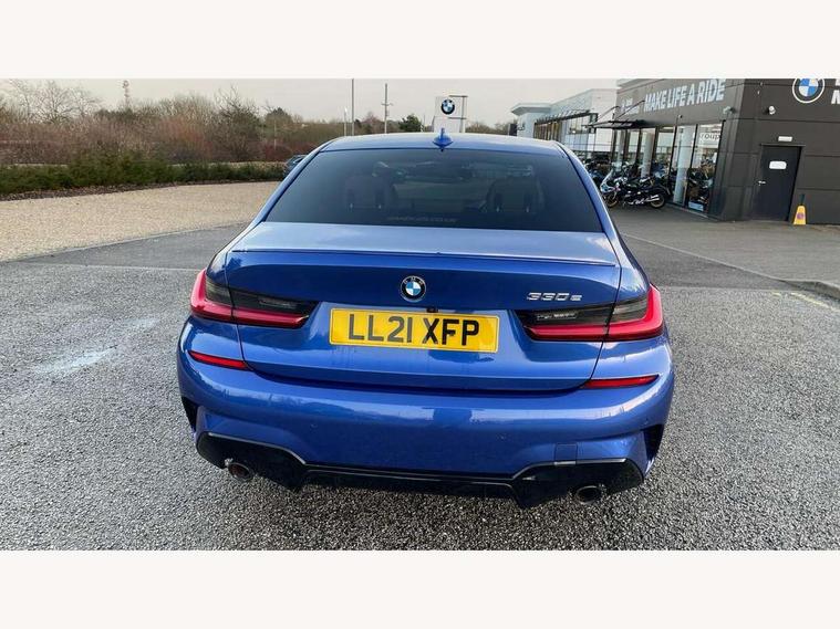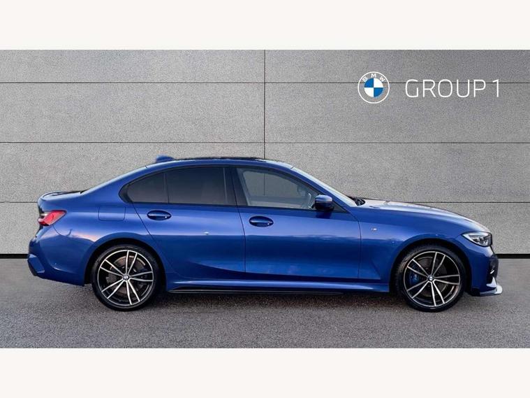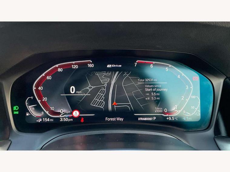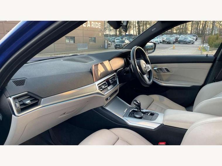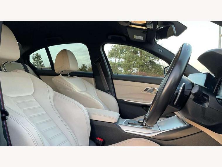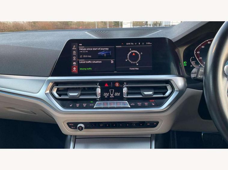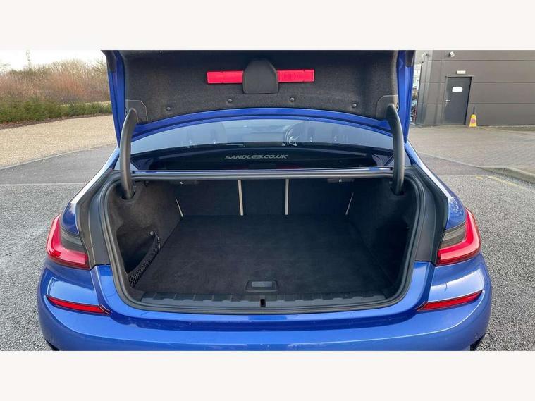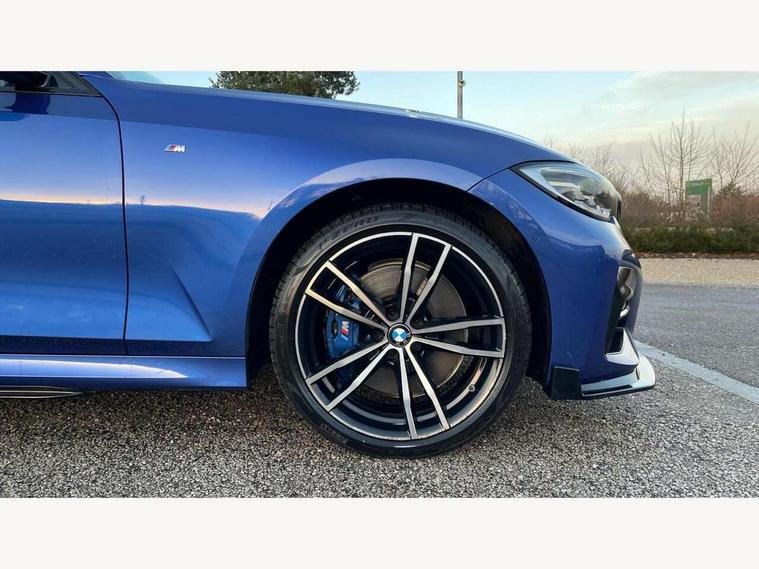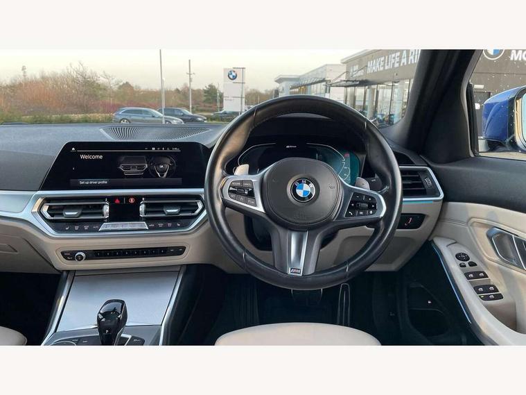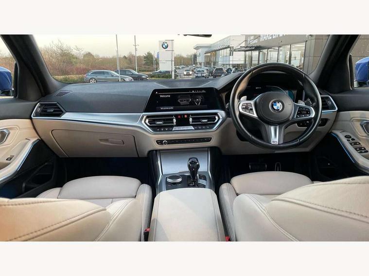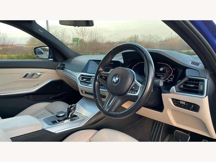 Active guard plus, Attentiveness assist, Auto start-stop, BMW iDrive controller on centre console, BMW Live Cockpit Professional Nav with 12.3" instrument display + 10.25" display, Intelligent Voice Assist, BMW OS 7, HDD, 2USB, 4G LTE connect, BMW service history, BMW Teleservices, Brake pad wear indicator in front and rear, Check Control warning system for monitoring of lights and door/luggage compartment open warning, Condition based service, Electric power steering, Electric power steering with Servotronic steering optimised at all speed ranges, Instrument cluster with speedometer with mph readout, tachometer, fuel gauge and oil temperature gauge, Integrated owners handbook, Oil sensor for level and grade, warning by check control system, On board computer - average speed+fuel consumption, service interval, clock/date, odometer/trip meter, outside temperature display and ice warning, Optimum shift indicator, Personal Profile - automatic lock when driving away selectable, Balanced 50/50 weight distribution, Battery cut-out switch, Drive performance control - ECO PRO, comfort and sport modes, Petrol Particulate Filter, Sport automatic transmission with steering-wheel mounted gearshift paddles and launch control, Stroke dependent dampers, DAB tuner, Electronic service booklet, Acoustic glazing, Active airstream chrome frame kidney grille with 8 high gloss black vertical slats, Automatic headlight beam throw control with load dependent regulating reaction, dynamic compensation of braking dive and acceleration squat, Black roof mouldings, Body colour door handles, Body colour front and rear bumpers, Body colour fuel filler flap, Body colour mirror caps with bottom segment in matt black, Dynamic brake lights, Electric windows - front and rear, with open/close fingertip control, anti-trap facility and comfort closing, Exhaust tailpipe - split left and right, Exterior mirrors - electrically folding with anti-dazzle, Fading support, Front and rear bumper system with replaceable deformation elements, Front black door sill finishers with BMW designation, Green tinted heat protection glazing, High gloss shadow line exterior trim, Interior rear view electrochromatic mirror with automatic anti dazzle function, LED daytime running lights, LED front fog lights, Lightweight engineering, M designation on front side panels, left and right, Matt black exterior B pillar, Model designation on right side of tailgate, Rain sensor with automatic headlight activation, Shark fin antenna, Two part LED tailights in L-shape with components in smoked glass, brake light, LED turn indicator and rear fog light, Visible VIN plate, Welcome lights in interior and door handle area, Windscreen wipers with integrated washing jets, 12V power socket in front storage compartment, 2 front cupholder in centre console with clamping elements and matt black inlay, 3 rear seats with non folding headrests with 3 point seat belts, 3 zone automatic air conditioning, 4 pieces lashing eyelets in luggage compartment, 40:20:40 split folding rear seat with loading system, Ambient lighting with welcome carpet light, Anthracite headlining, Armrest integrated in front and rear door trim + front centre console armrest, Centred top Luggage compartment lights, Four grab handles integrated in roof lining, Front and rear door exit lighting (left / right), Front and rear door pockets, Front and rear reading lights, Front and rear velour floor mats, Front head restraints, Front sport seats, Heated driver and front passenger seats, Height adjustable mechanically and infinitely variable steering column, Illuminated armrest storage compartment, Illuminated glove compartment with separate small compartment, Interior lighting - front centre over interior mirror with soft light, rear centre and front and rear footwell lighting, M sport leather steering wheel, Make-up mirror lights, Rear centre armrest with 2 cupholders, Rear centre console with storage compartment and ventilation grille, Sunvisors with vanity mirrors and ticket pocket, Toolkit located in luggage compartment, Connected pack professional - 3 Series Saloon/Touring, M sport exterior styling pack - 3 Series Saloon/Touring, 2 tone horn, BMW emergency call, Brake energy regeneration, Braking pre-tensioning, Child proof locking system in rear door, Child seat ISOFIX attachment rear outer seats, Coasting in idle in ECO PRO mode, Crash sensor activating of airbags, Unlocking doors, hazard warning lights, interior light, safety battery terminal, Driver and front passenger side airbags, integrated in the door side seat backrest bolsters for all seat variants, Driver/Front Passenger airbags, Dry braking, Dynamic brake control, Dynamic stability control + (DSC+) - Anti-lock Braking System (ABS) with brake assist and cornering brake control + Automatic Stability Control (ASC), Dynamic Traction Control - DTC, Electric parking brake including automatic hold function and automatic release of the parking brake when driving off, Electronic differential lock control (EDLC), Front passenger manual airbag deactivation, Head airbags for all 4 outer seats, Hill start assist, Seat belt security check for driver and front passenger, Side impact protection, Three 3 point seat belts on all seats including front belt stopper, pyrotechnic belt tensioners and belt force limiters, Tyre pressure monitoring with three level warning strategy, Ventilated front and rear disc brakes, Warning triangle and first aid kit, Alarm system (Thatcham 1) with remote control and electronic engine immobiliser, Central locking switch for all doors, fuel filler cap and luggage compartment, Remote control with integrated key one button open/close vehicle and windows, sole opening of the luggage compartment lid and panic mode, Start/stop button with Comfort Go keyless engine start and auto Start/stop deactivation button, Vehicle key with M specific designation, Reduced rolling resistance tyres,
