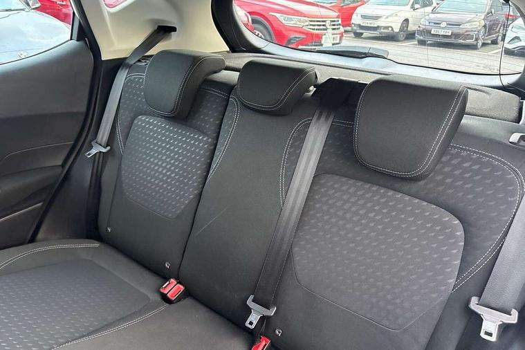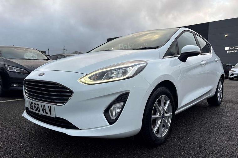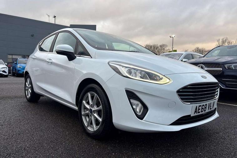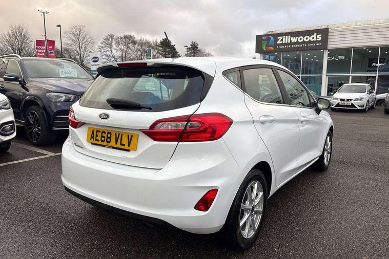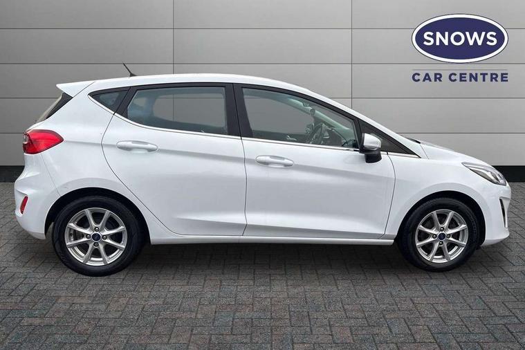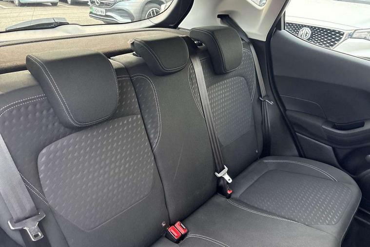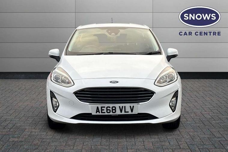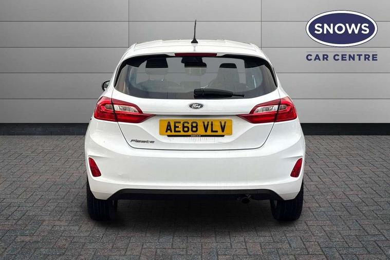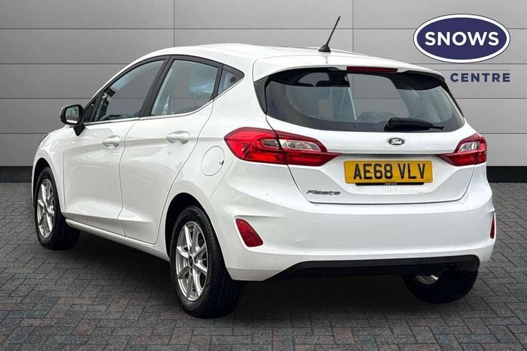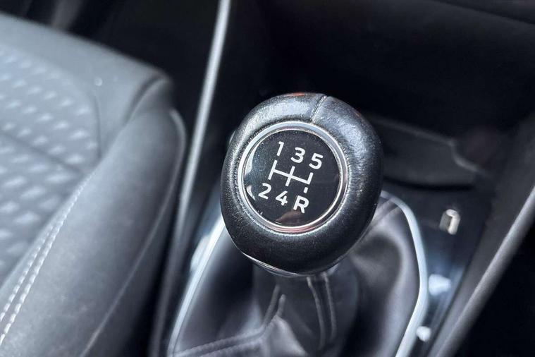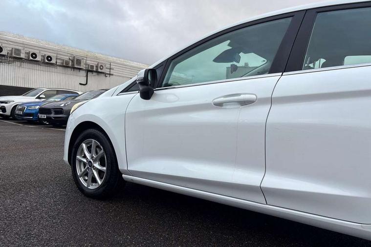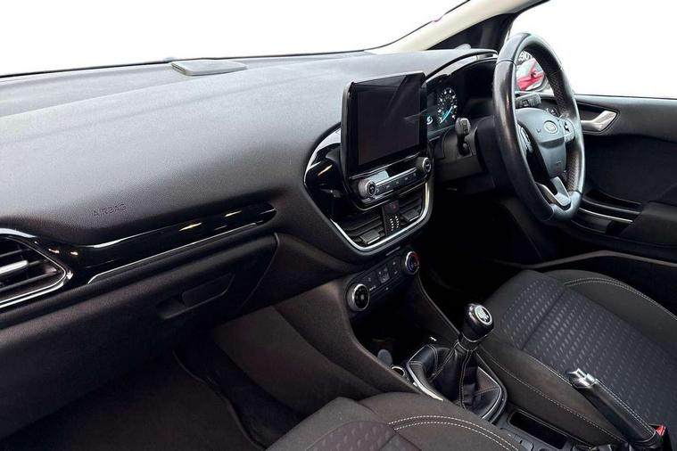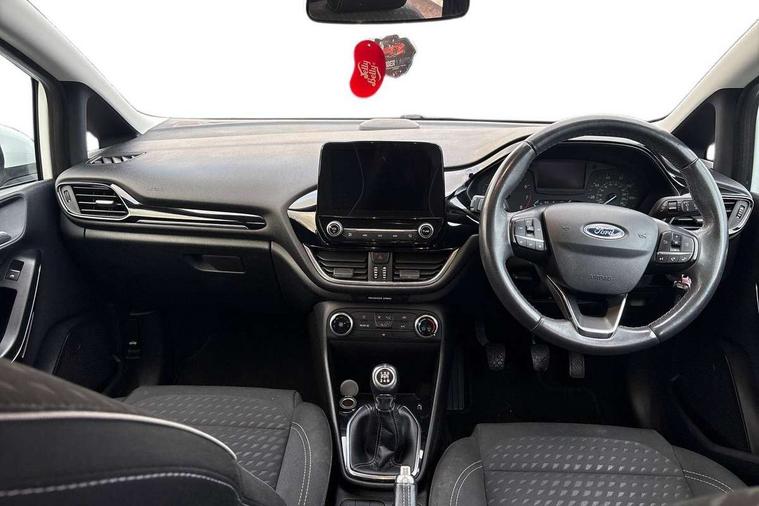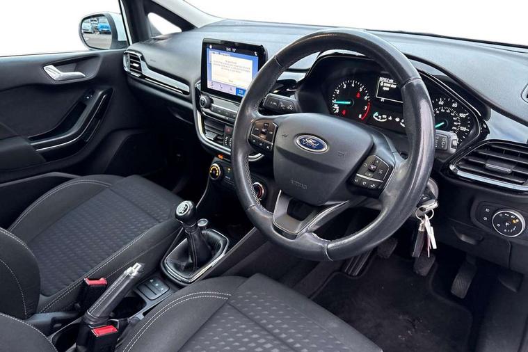Bluetooth system, Electric power steering, Ford easy fuel, Trip computer, Auxiliary input socket, Steering wheel mounted controls, USB connection, Automatic headlights, Body colour bumpers, Body colour door handles, Body colour electric adjustable heated door mirrors with integral indicators, Body colour rear spoiler, Chrome beltline trim, Cornering front fog lights, Electric front windows/one touch facility, Halogen projector style headlights with static cornering lights + LED daytime running lights, Quickclear heated windscreen, Rear wiper, Tinted glass, Upper front grille chrome surround, 12V Accessory socket in centre console, 3 spoke leather trimmed steering wheel with audio control, 60/40 split folding rear seat, Adjustable head restraints, Boot carpet, Chrome inner door handles, Cloth upholstery, Footwell illumination, Front map reading lights, Front seat and rear pockets, Height adjustable driver's seat, Illuminated glovebox, Leather gear knob, Leather trimmed handbrake handle, Load area light, Luxury woven headliner, Manual air conditioning, Overhead console with sunglasses holder, Pollen filter, Rake/reach adjustable steering wheel, Rear centre head restraint, NCAP Pack - Fiesta, 3 point seatbelts on all rear seats, ABS+EBA, Curtain airbags, Driver and passenger airbags, Drivers knee airbag, Electronic stability control with hill start assist, Front passenger airbag deactivation, Front side airbags, Seatbelt warning, Tyre pressure monitoring system, MyKey system, Remote central locking & engine immobiliser, Thatcham Cat.1 alarm,