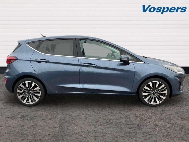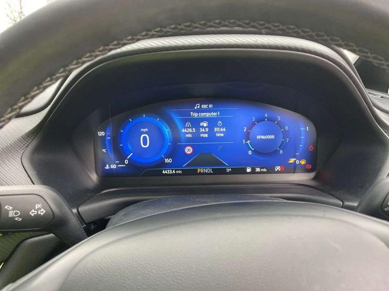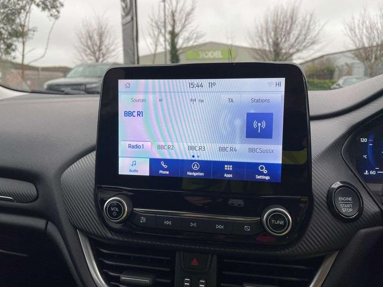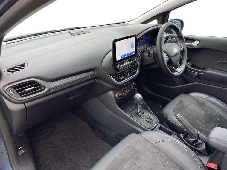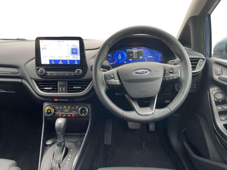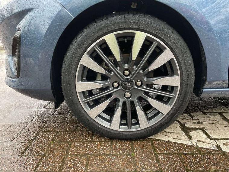 12.3" Full digital cluster, Driver alert system, Electric power steering, Ford easy fuel, Ford SYNC 3 Nav with DAB radio, 8" touch screen, voice control, emergency assist, Apple CarPlay/Android auto, 2x USB, 6 speaker, Ford pass connect, Rear parking distance sensors, Rear view camera, Selectable drive modes (Normal, Sport, Track), Speed sign recognition, Trip computer, Wrong way alert, Standard suspension, Auto high beam, Body colour bumpers, Body coloured electrically operated with side indicators, Electric front windows/one touch facility, Front titanium scuff plates, High gloss chrome surround with satin grille insert, LED Night signature to rear lights, LED third brake light, Quickclear heated windscreen, Rain sensing wipers and auto dimming rear view mirror, Rear privacy glass, Rear side wing doors, Rear wiper, 3 seat bench in 2nd row, 4 way manually adjustable passenger seat, Adjustable head restraints, Centre console with opening armrest, 2x cupholders, 12v and USB, Drivers and Passenger lumbar support, EATC - Electronic Auto Temperature control, Front floor mats in velour, Leather gear knob, LED ambient lighting (Ice blue), Manual 4-way driver seat adjust, Sensico partial premium leather upholstery with metal grey stitching, Sensico wrapped steering wheel, Single front passenger seat, NCAP Pack - Fiesta, Winter pack [GTBAB]- Fiesta, 3 point seatbelts on all rear seats, Electronic stability control with hill start assist, Tyre pressure monitoring system, Ford keyfree system with Keyless entry and keyless start, MyKey system, Remote central locking, Thatcham alarm with power door dead locks, 17" 10 spoke alloys with pearl grey machined finish,