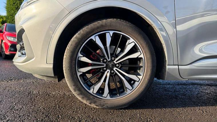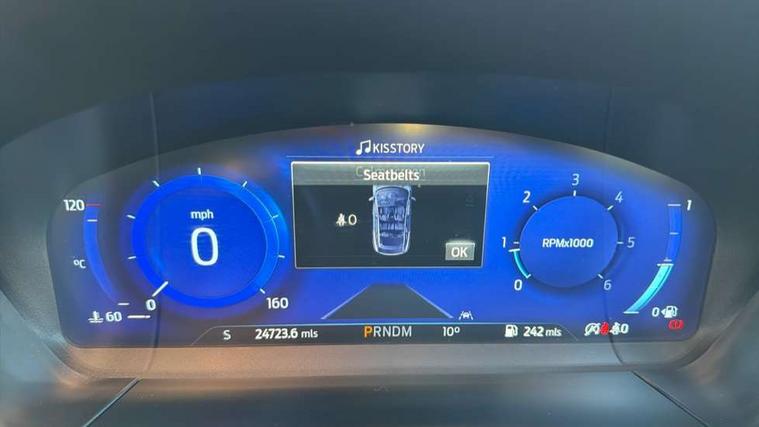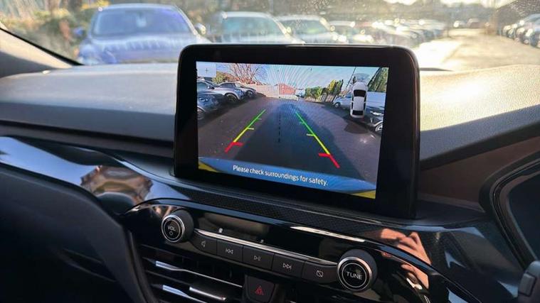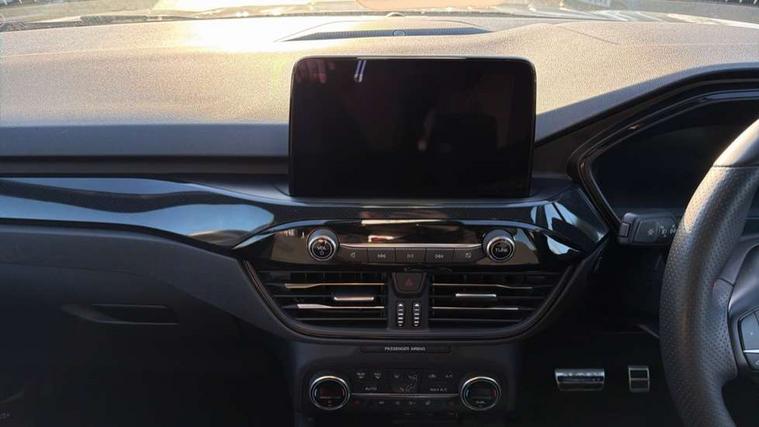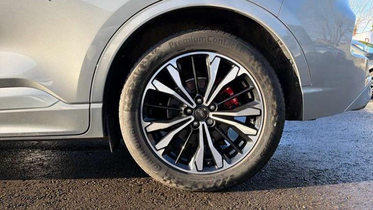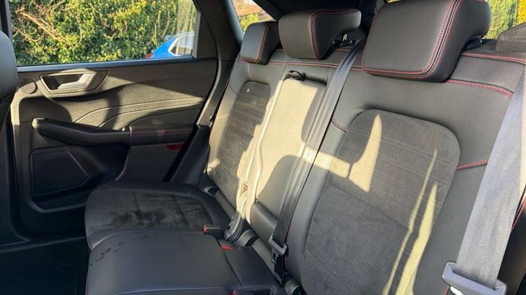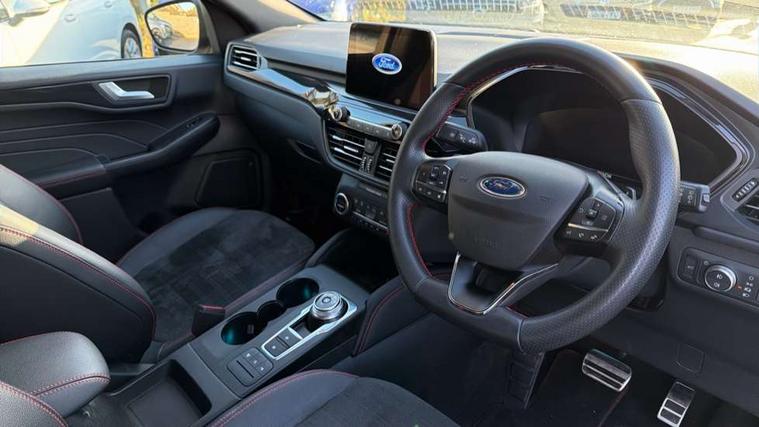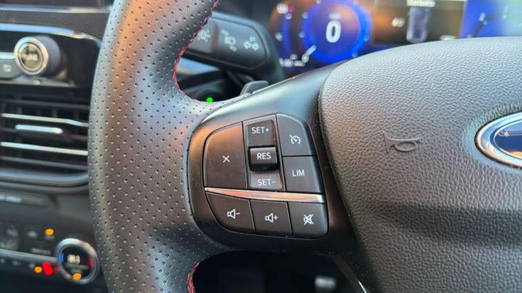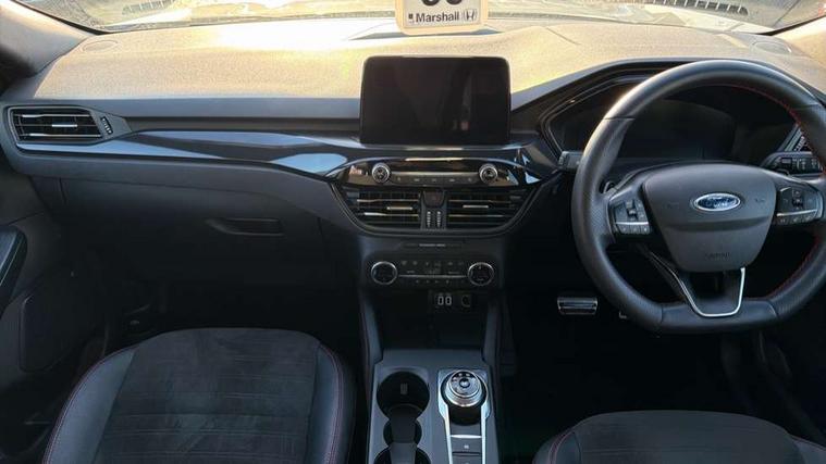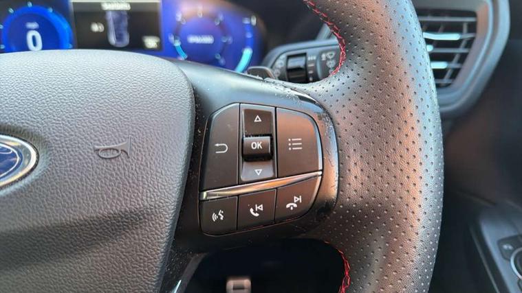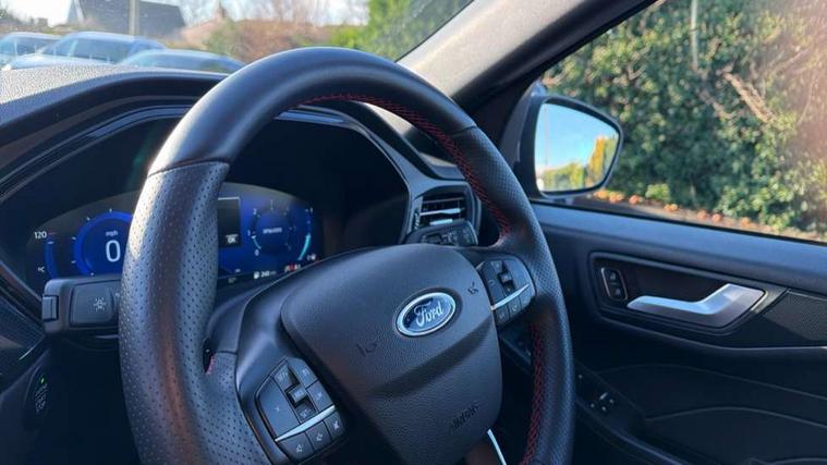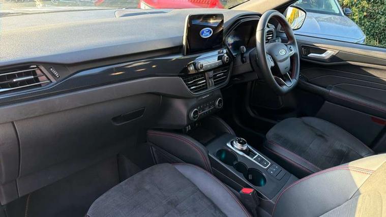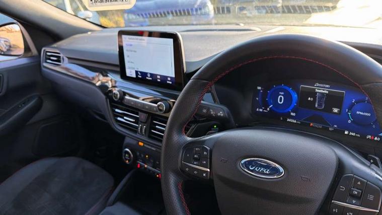 12.3" digital colour instrument cluster, Ford easy fuel, Ford SYNC 3 with 8" TFT LCD touchscreen, App Link, andriod auto/apple carPlay, emergency assistance and navigation with Ford pass connect, Front and rear parking sensors, Hands free power tailgate, Lane keeping aid with lane departure warning, Power assist steering, Rear view camera, Selectable drive modes, Service interval indicator, Sports suspension, Twist beam rear suspension, B&O premium audio system with 10 speakers and subwoofer, 2 USB ports, DAB radio/CD, Auto headlamps with high and low beam, Black roof rails, Day/night rear view mirror, Front LED fog lamps, Large rear spoiler, LED daytime running lights, LED rear lights, Power folding heated door mirrors with puddle lights, Power front/rear windows with global close, Power opening panoramic roof, Privacy glass, Quickclear heated windscreen, ST Line body styling kit with unique front and rear fascia and bumper, rear painted diffuser, front painted skid plates, dark mesh upper grille, ST Line front scuff plates, Third brake light, Twin exhausts, 10 way power adjustable drivers seat, 2nd row sliding seats with 60:40 split, 8 way manual passenger seat including lumbar support and height adjust, Alloy pedals, Centre console with electronic parking brake, Dark headlining and pillars, Dual electronic automatic temperature control, Flat bottomed leather steering wheel in sensico with red stitching, Front and rear head restraints, Heated passenger and driver seats, Heated rear seats, Heated steering wheel, Partial premium touch sensico leather upholstery with black cloth inserts and red stitching, Rear charging point, Sports seats, ST Line front and rear floor mats, Steering wheel mounted paddle shift, 3x3 point rear seatbelts, Airbags - front driver/passenger, front and rear curtain, Drivers knee airbag, Electronic stability control (ESC) and ABS, Ford MyKey Gen 2 safety system, Manual child proof rear door locks, Post collision braking, Pre collision assist with autonomous emergency braking, Rear seat Occupancy alert, Red brake calipers, Tyre pressure monitoring system, Engine immobiliser, Keyless entry and Ford power start button, Locking wheel nuts, Remote powered central double locking doors, Thatcham category 1 alarm,