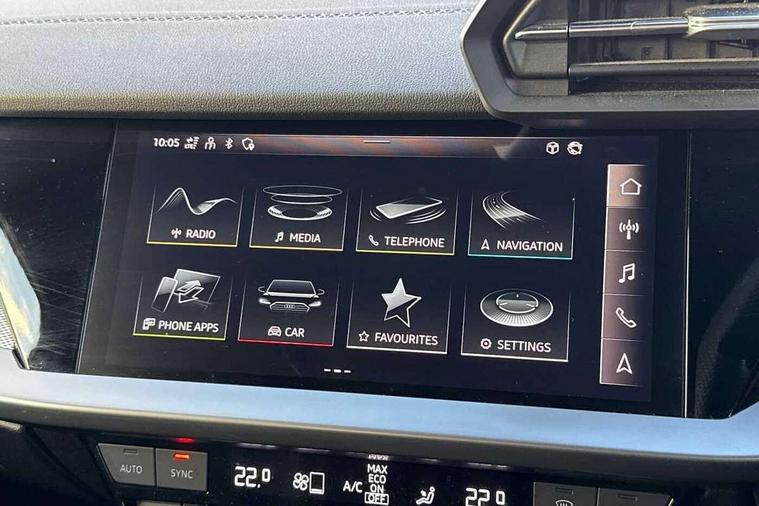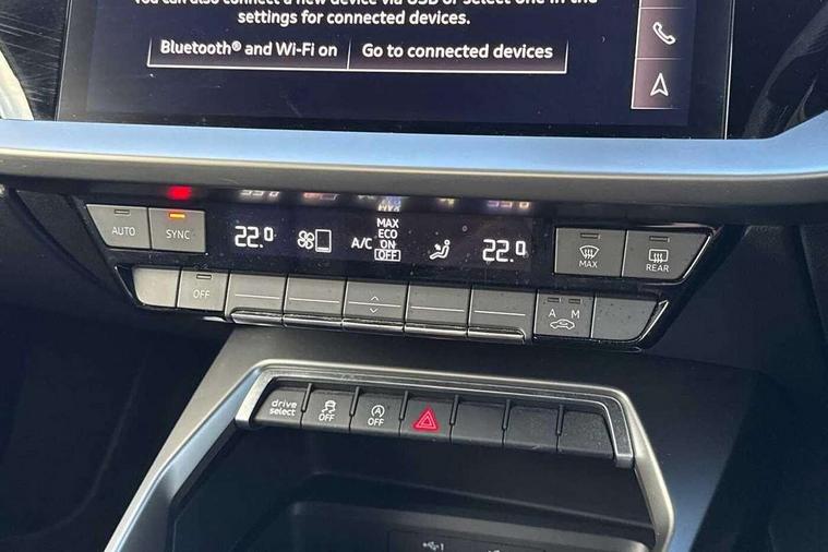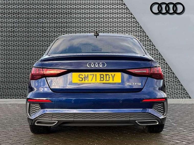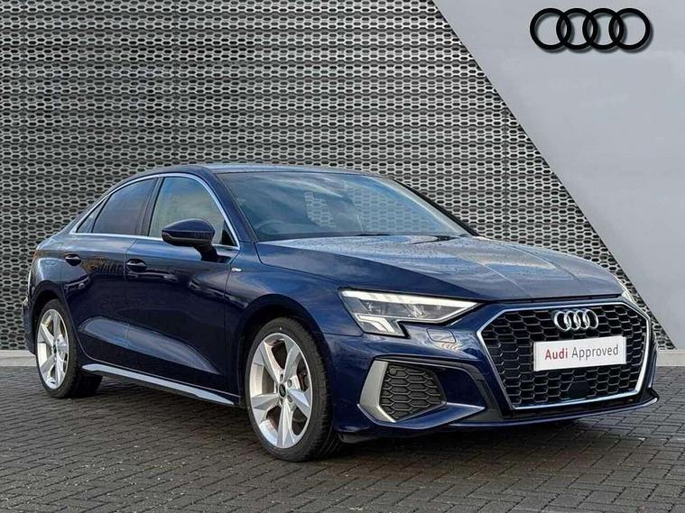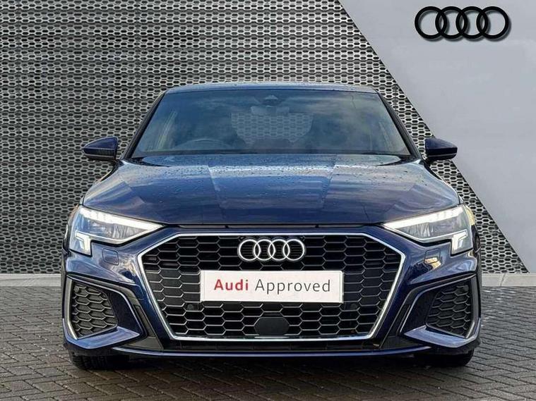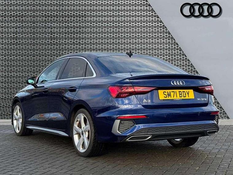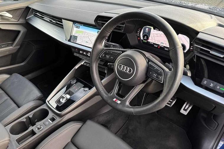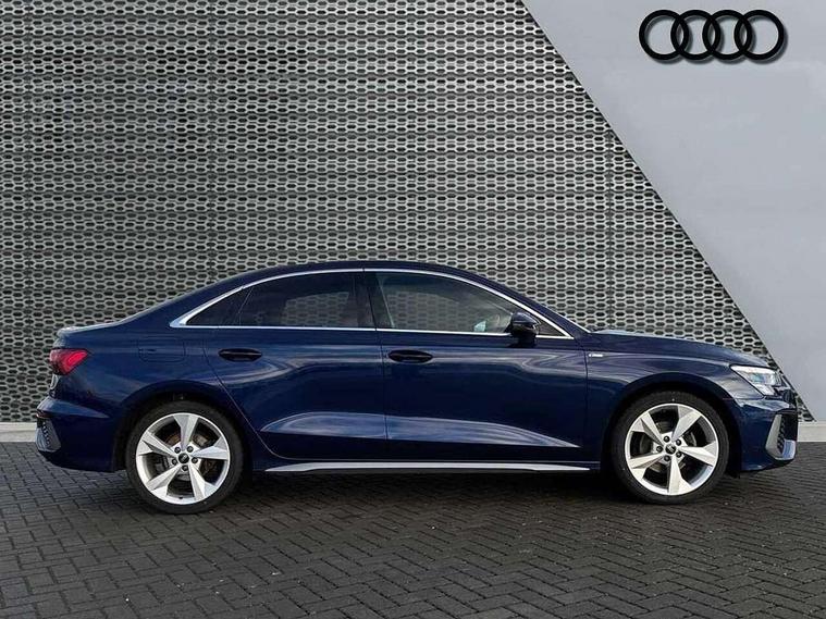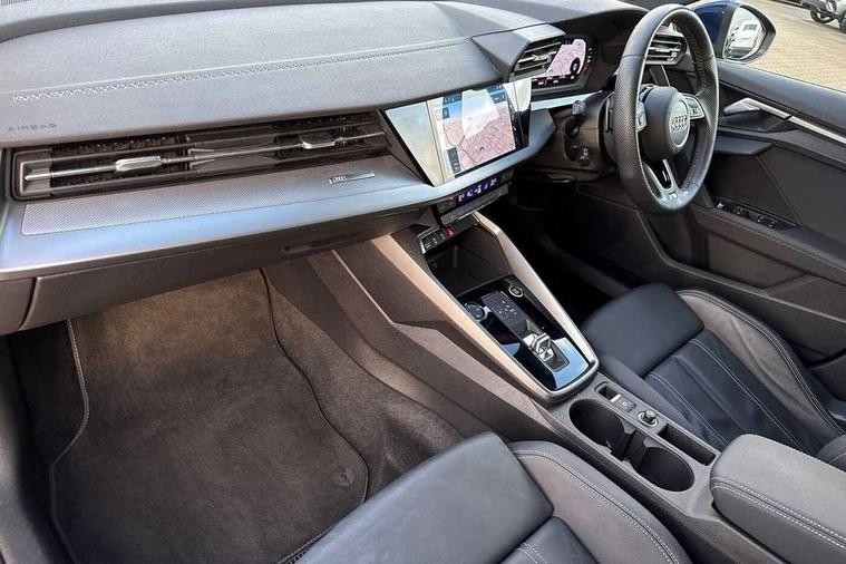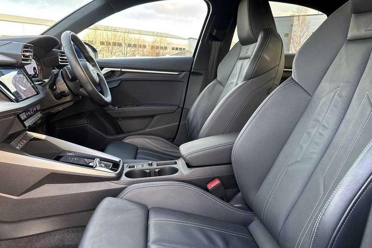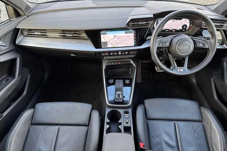 Audi connect emergency call and service, Audi drive select (Auto, Comfort, Dynamic, Efficiency and Individual), Audi smartphone interface, Audi Virtual Cockpit - 10.25" digital and colour instrument cluster, Automatic start/stop system with recuperation, Bluetooth interface, Collision avoidance assistant, Electromechanical power speed sensitive steering, Lane departure warning system, MMI Navigation Plus with high resolution 10.1" colour touch screen display, Service indicator, Voice control system with natural language interaction, 2x USB Type C ports (for charging and data transfer), 6 passive loudspeakers, CD player, DAB Digital radio, 3rd brake light, Acoustic glass windscreen, Aluminium window trim, Auto dimming frameless rear view mirror, Electrically adjustable/heated/folding/auto dimming door mirrors with integrated LED indications + kerb view function for passenger side, Front electric windows, Illuminated door sills with aluminium inserts at the front with S logo, LED daytime running lights, LED headlights with LED rear lights and dynamic rear indicators, Light and rain sensors, Model and engine designation badges at rear, Privacy glass - dark tinted rear window, rear door and side windows, Rear electric windows, S line bumpers, S roof spoiler, 12V socket and storage compartment in front centre console, 40/20/40 split folding rear seat bench with cupholder, Black cloth headlining, Dual zone electronic climate control, Front and rear centre armrest in leather, Front and rear headrests, Front/rear floor mats, Height and reach adjustable steering wheel, Interior lighting - glove compartment light and right hand side, Luggage compartment floor covering, Manual boot compartment lid, Manually adjustable front sport seats, Seat side bolsters, Stainless steel pedals and front footrest in black, Twin leather upholstery with front sports seats S embossed logo, Aluminium interior elements pack - A3, S line styling pack - A3 Saloon, 3x3 point rear seat belts, Driver and front passenger airbag with passenger airbag deactivation, Electronic Stabilisation Control (ESC) including ABS, ASR and EDL, First aid kit with warning triangle and 2 safety vests, Front side airbags with head airbags and interaction airbag, Hill hold assist, Pre-sense front with pedestrian and cyclist detection, Seatbelt monitoring, Tyre pressure loss indicator, Anti theft alarm, Anti-theft wheel bolts, Electronically operated child lock, Immobiliser, Remote control central locking, Aluminium air vent surrounds, Aluminium trim elements, Dark spectrum aluminium inlays, accent surfaces in the dashboard and centre console in platinum grey silk effect paint finish,
