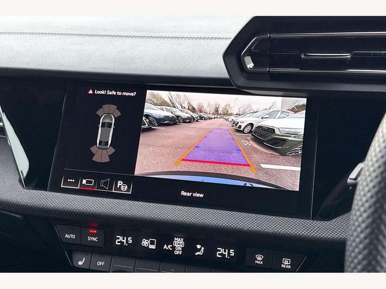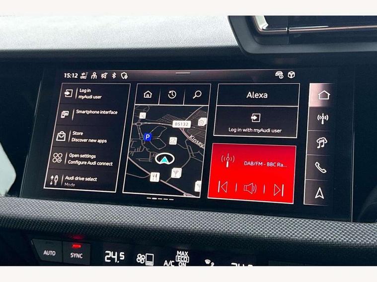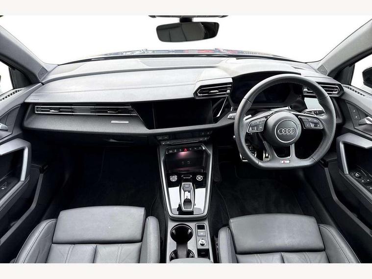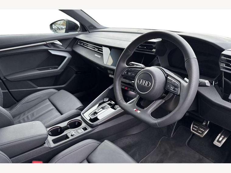 Adjustable speed limiter, Audi drive select, Audi smartphone interface with app store includes wireless Apple carplay, Android auto and Amazon alexa integration, Audi virtual cockpit plus - 12.3" full HD resolution dynamic digital instrument cluster, Automatic start/stop system with recuperation, Bluetooth interface, Camera based traffic sign recognition, Collision avoidance assistant, Cruise control, Distraction and Fatigue warning, e-Call (emergency call), Electromechanical power speed sensitive steering, Lane departure warning system, MMI Navigation Plus with high resolution 10.1" colour touch screen display, Park Assist with parking system Plus, Service indicator, Trip computer, Voice control system with natural language interaction, Sports suspension, Audi Phonebox light with wireless charging, Audi sound system - 10 loudspeakers including centre loudspeaker and subwoofer, DAB Digital radio, USB ports with charging function in the rear, Acoustic glass windscreen, Anthracite grey Audi rings (front and rear), Audi beam uses LEDs to project the Audi logo onto the ground as you exit your A3, Auto dimming frameless rear view mirror, Black accents front and rear bumpers, Black accents in the area of the Audi single frame grille, Black accents window trims strips, Electrically adjustable/heated/folding/auto dimming door mirrors with integrated LED indications + kerb view function for passenger side, Exterior model badging, Front electric windows, Heat insulating glass windscreen, Illuminated door sills with aluminium inserts at the front with S logo, LED 3rd brake light, LED daytime running lights, LED headlights with LED rear lights and dynamic rear indicators, Light and rain sensors, Privacy glass - dark tinted rear window, rear door and side windows, Rear boot, Rear electric windows, Rear side wing doors, 12V socket and storage compartment in front centre console, 3 seat bench in 2nd row, 3 spoke flat bottomed leather multifunction sport steering wheel with gear shift paddles, 3-zone deluxe automatic air conditioning, 4 way electrically adjustable lumbar support for driver and front passenger, 40/20/40 split folding rear seat bench, Black cloth headlining, Front and rear centre armrest in artificial leather, Front and rear centre armrest in artificial leather with contrasting stitching on armrests and instrument panel, Front and rear headrests, Front/rear floor mats, Heated front seats, Height and reach adjustable steering wheel, Manual boot compartment lid, Manually adjustable front seats, Rear cup holders, S badging on the steering wheel, Seat side bolsters, Single front passenger seat, Stainless steel pedals and front footrest in black, Twin leather upholstery with front sports seats S embossed logo, Aluminium interior elements pack - A3, Multi-coloured LED interior lighting package - A3 Black Edition, 3x3 point rear seat belts, Driver and front passenger airbag with passenger airbag deactivation, Electronic Stabilisation Control (ESC) including ABS, ASR and EDL, First aid kit with warning triangle and 2 safety vests, Front side airbags with head airbags and interaction airbag, Hill hold assist, Pre-sense front with pedestrian and cyclist detection, Seatbelt monitoring, Tyre pressure loss indicator, Anti theft alarm, Anti-theft wheel bolts, Electronically operated child locks, Immobiliser, Remote central locking with safelock, Inlays in black Impressum woven textile,