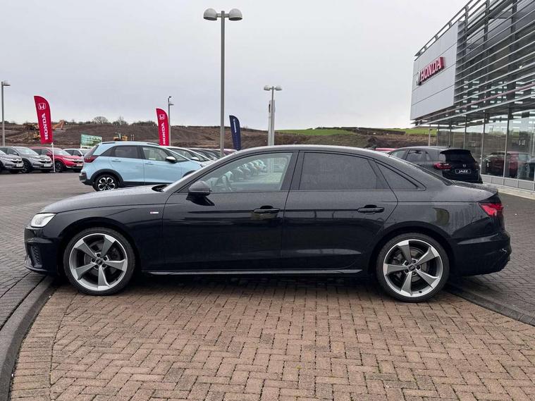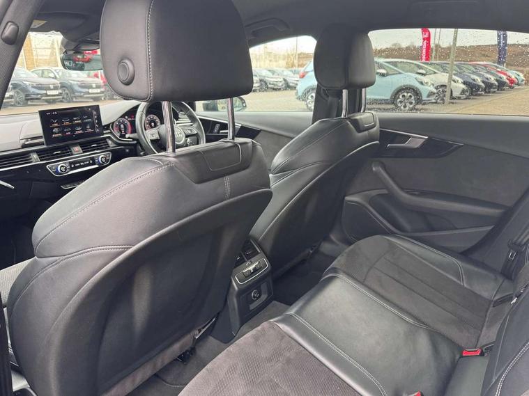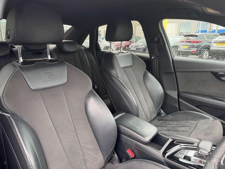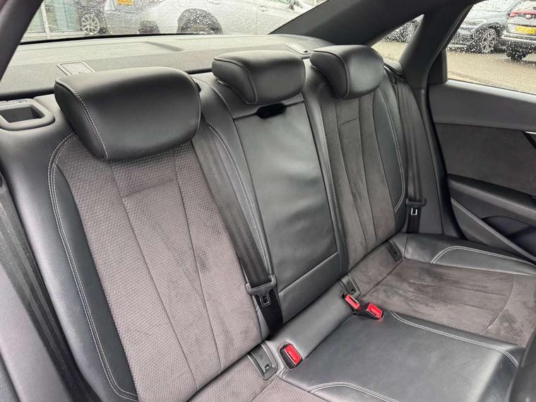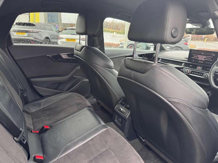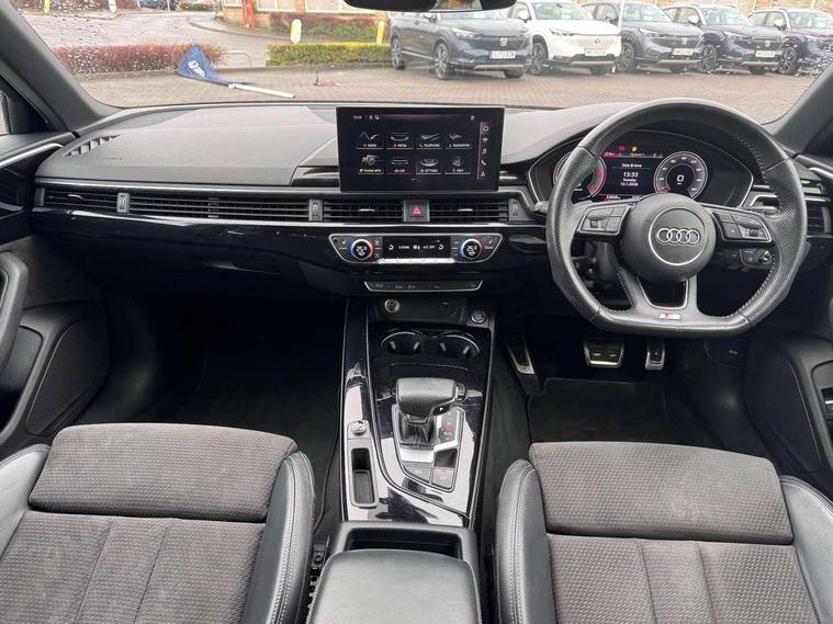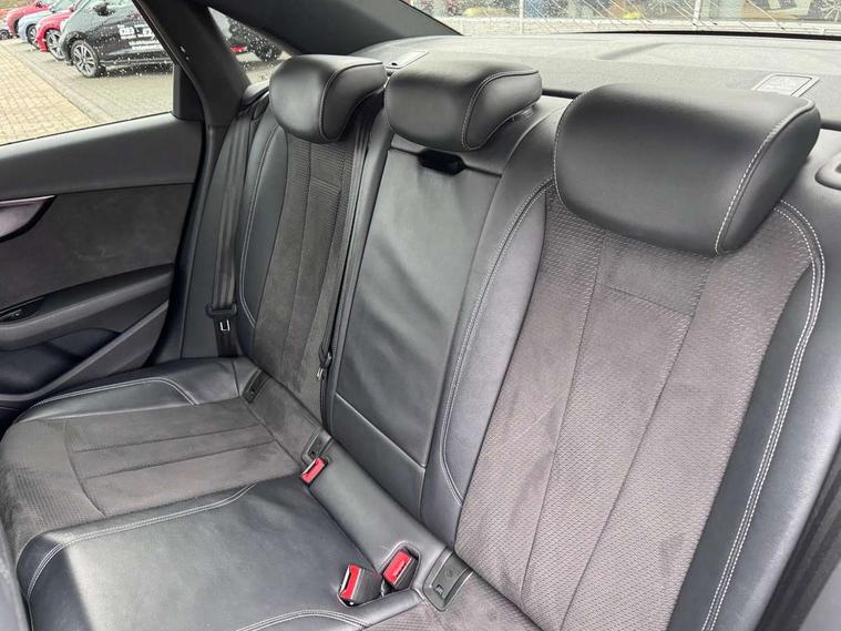 Audi connect safety and service (e-call), Audi drive select, Audi parking system plus with front and rear sensors, Audi smartphone interface, Audi virtual cockpit, Automatic start-stop system with coasting functionality and efficiency programme, Bluetooth interface, Electric boot lid release, Electromechanical power steering, MMI Navigation plus with MMI touch includes 10.1" high resolution colour MMI display, 3D map, Rear view camera, Voice control system, Sports suspension lowered by 23mm, 2 USB charging ports, 8 passive loudspeakers, DAB digital radio reception, Auto dimming rear view mirror, Body colour door handles, Body colour front spoiler lip, Body colour side sill trim, Electrically folding auto dimming/adjustable/heated door mirrors with LED side indicators and kerb view function for passenger side, Grained matt black side air inlets with matt aluminium silver inlay, High beam assistant, LED headlights with LED rear lights + dynamic rear indicators + headlight adjustment and high beam, turning light + LED daytime running lights, Matt aluminium silver tailpipe trim, Privacy glass, Rain and light sensors, S Line badges on the front wings, S line front and rear bumpers with side skirts, S Line rear diffuser in matt titanium black with trim strip in matt aluminium silver, Windscreen with acoustic glazing, 3 spoke flat bottomed high multi-function leather sport steering wheel with gearshift paddles, 4 way electric lumbar support for driver and front passenger, 40/20/40 split folding 3 rear seat bench in 3 parts with rear centre armrest, Black cloth headlining, Black perforated leather gearknob, Contrast stitching on seats, steering wheel and gear lever gaiter, Deluxe 3 zone electronic climate control, Door sill trims with aluminium inlay, Front and rear head restraints, Front centre armrest, Heated front seats, Illuminated door sill trims with S logo, ISOFIX child seat mounting and top tether, Manual seat adjustment, Stainless steel pedals and foot rest, LED Interior light pack - A4/S4, Titanium black styling pack - A4 Saloon, 3 rear seatbelts, 6 airbags - Driver, front passenger, curtain and side windows, Electronic Stabilisation Control (ESC) including ABS, ASR and EDL, Hill hold assist, Multi collision brake assist, Pop-up bonnet for pedestrian protection, Pre sense city, Seatbelt monitoring, Warning triangle and first aid kit, Anti theft alarm, Anti theft wheel bolts, Keyless Go, Piano black finish inlay, 19" 5 arm rotor design alloy wheels titanium matt look, Tool kit, Tyre repair kit,