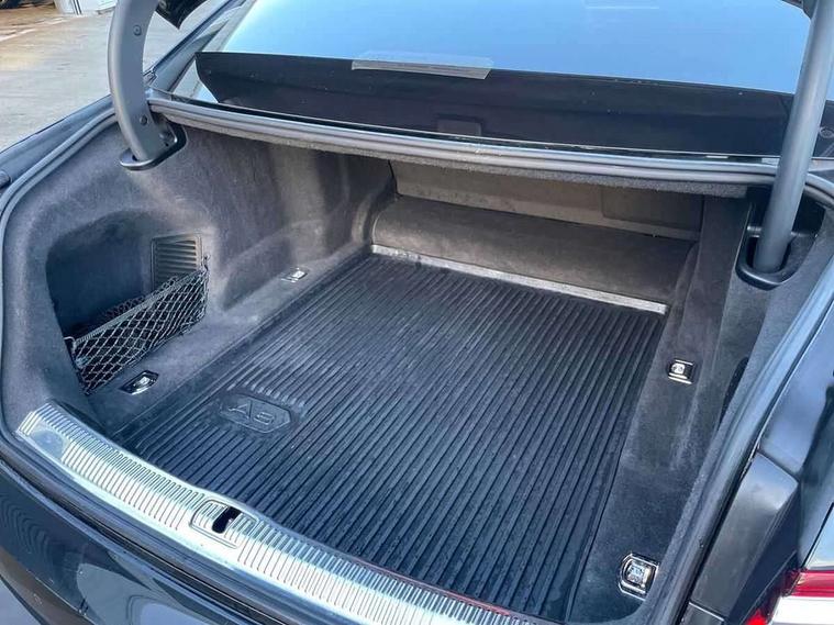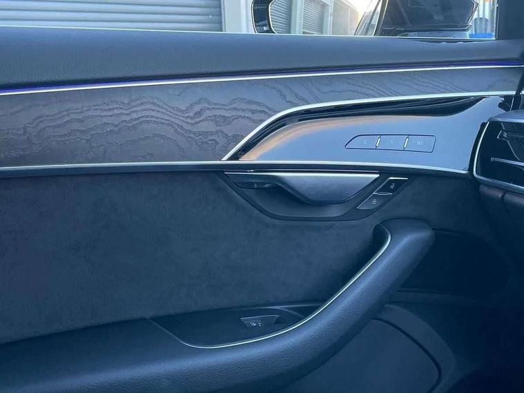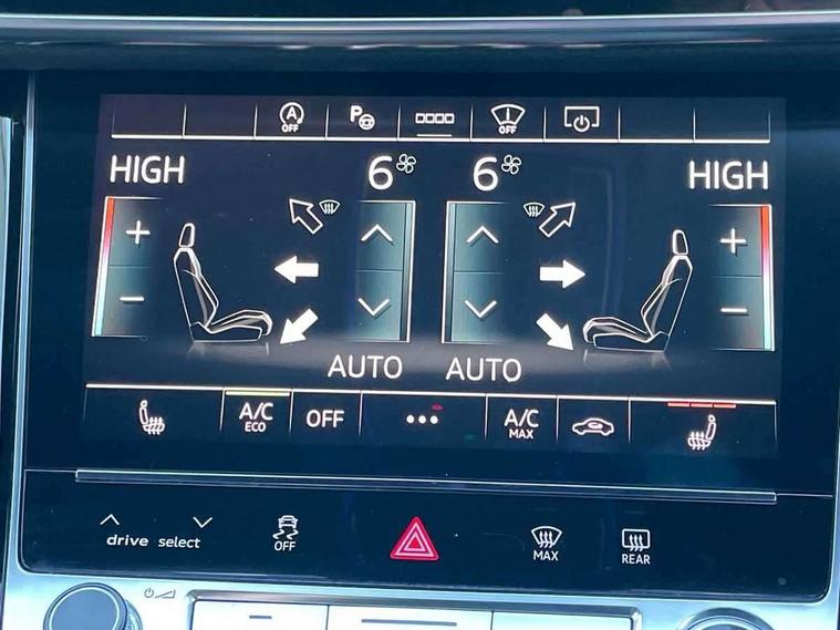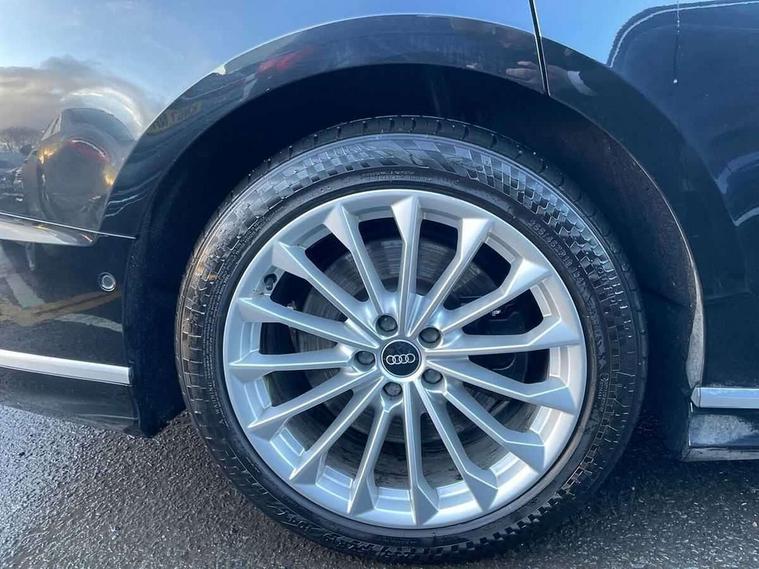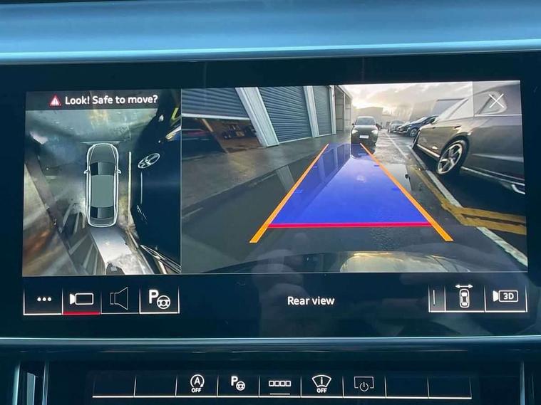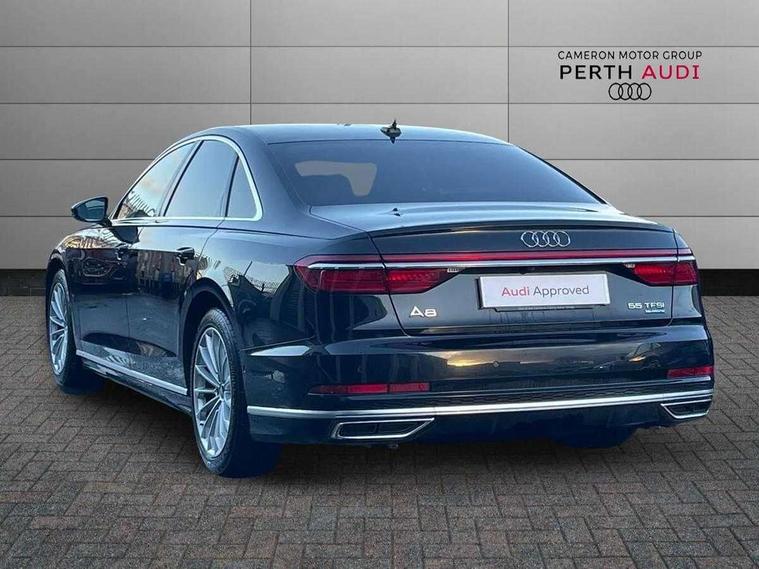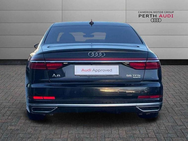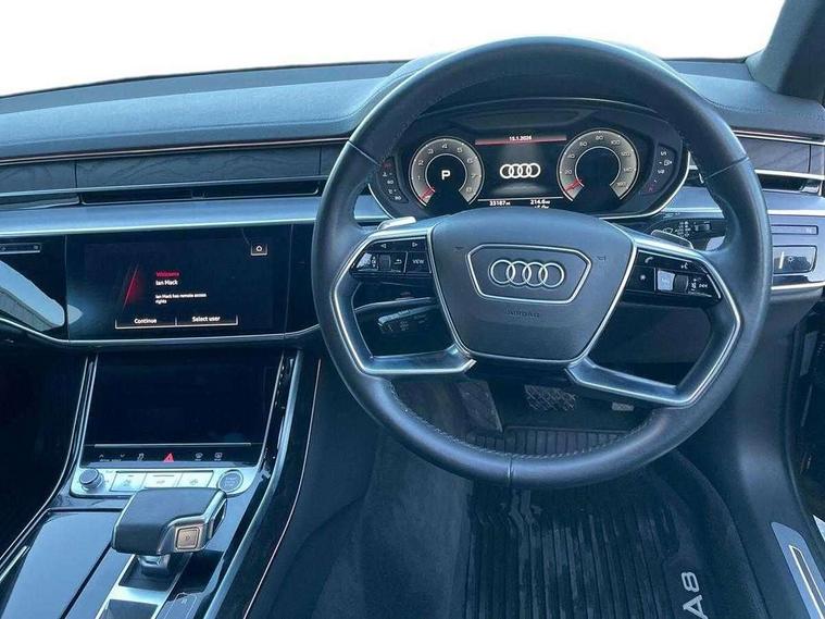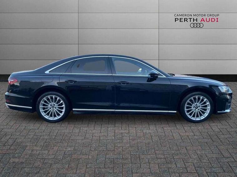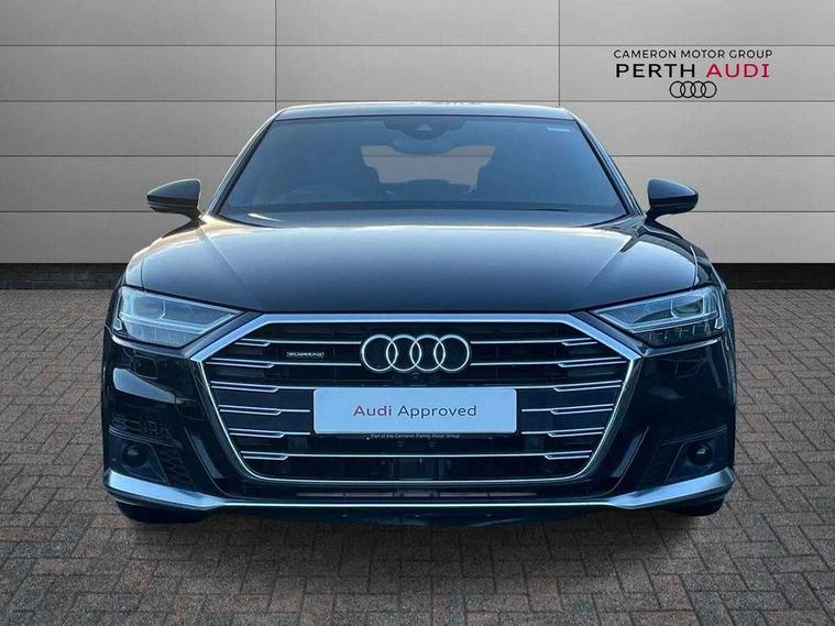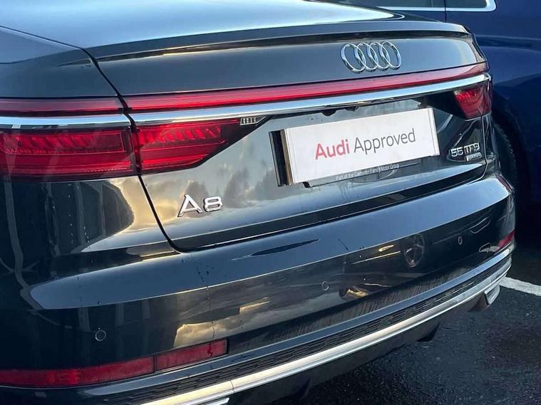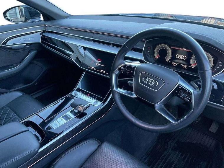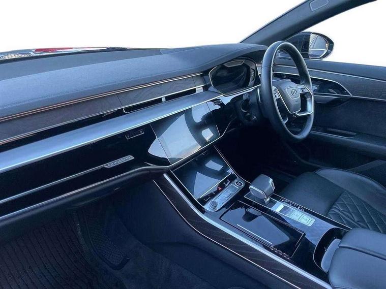 Dark matt brushed aluminium lower inlays, Connect package plus - A8, High gloss styling pack - A8, LED ambient interior lighting pack - A8, Advanced key, Anti theft alarm tow away protection, Anti-theft wheel bolts and wheel loosening detection, Locking wheel bolts, Remote central locking, Audi music interface, Audi sound system, DAB digital radio module, DVD System, Premium MMI radio plus, USB connection, 3 point seatbelts on all rear seats, ABS/EBD, Active front headrest system, ASR traction control, Audi pre sense basic, Audi pre sense front, Driver/Front Passenger airbags, EDL traction control, Electromechanical parking brake, ESP, Extended pedestrian protection measures, Front and rear side airbags with head airbag system, Front brake discs, callipers painted black, Front passenger airbag deactivation, Rear brake discs, callipers painted black, Rear child proof door locks, Seatbelt reminder + electric contact in buckle + advanced safety equipment, Tyre pressure warning light, Warning triangle and first aid kit, Acoustic double glazing, Audi space frame, Auto dimming rear view mirror, Automatic headlight control system, Body colour bumpers, Body colour door handles, Body colour exterior mirror housings, Body colour side protection with aluminium trim strips, Electric front windows, Electric rear windows with isolation switch, Electrically adjustable heated folding + automatically dimming exterior mirrors with memory function and integrated LED indicators, HD matrix healights with LED rear lights + dynamic rear indicators, Heat insulating glass in side and rear windows, Heated rear window, Heated windscreen washer jets, High beam assist, LED brake lights, LED daytime running lights, Privacy glass, Reverse activated kerb-view adjustment on passenger's door mirror, Side skirts, Sport exterior styling, Sports bumpers, 2 zone automatic air conditioning, 3 seat rear bench with centre armrest in 2nd row, 4 way electric lumbar support for driver and front passenger, Centre console with cupholders, Climate controlled seats, Comfort centre armrest, Door armrest with storage, Door pockets with bottle holder, Driver and front passenger side sunvisors with illuminated vanity mirrors, Dust/pollen filters, Electric adj front seatbelt height + memory, Electric front seats with memory function, Front/rear floor mats, Glove compartment cooling, Heated front seats, Height/reach electric steering column with easy exit function, Isofix child seat mounting points on outer rear seats, Leather gearknob, Passenger footwell storage net, Reading lights, Rear headrests, Roof mounted sunglasses holder, Valcona leather upholstery with front sports seats in diamond quilted with S embossed logo, 'Lights On' Reminder warning buzzer, Adaptive cruise control with speed limiter, Audi connect safety and service (e-call), Audi drive select, Audi parking system plus with front and rear sensors, Audi phone box with wireless charging, Audi virtual cockpit, Audi wireless smartphone interface, Camera based traffic sign recognition, Colour driver's information system display, Electro - mechanical power assisted steering, Head up Display, Lane departure warning including emergency assist, MMI navigation plus with MMI touch + Twin touch screens with haptic feedback, Operating buttons in black, glass look with haptic feedback including extended aluminium look, Power door closure, Power operated tailgate, Rear view camera, Remote fuel filler release, Service interval indicator, 48V Mild hybrid technology, 8 speed transmission with hill hold assist, Adaptive air suspension, Quattro all wheel drive with self locking centre differential,