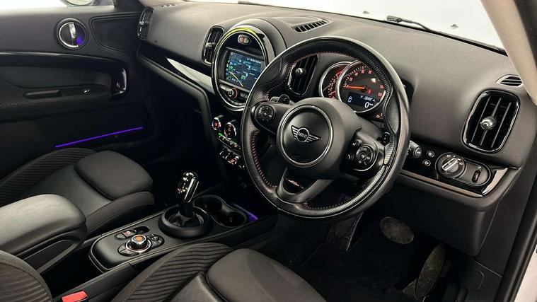 Apple CarPlay preparation, Brake pad wear indicator warning light, Central display with LED ring and 6.5" colour touch screen, Connected driver, DTC - Dynamic traction control, Exterior temperature gauge, Intelligent emergency call, MINI remote services, MINI TeleServices, Navigation system, On board computer, Personal Profile, Real time traffic information, Service interval indicator, Servotronic speed sensitive power steering, Diesel particulate filter, Electronic differential lock, Performance Control, Auxiliary input socket, DAB digital radio module, MP3 compatible radio/single CD player, Radio visual boost, Anti dazzle rear view mirror, Body colour scoop integrated into engine- compartment lid, Chrome door handles, Chrome headlight surround, Chrome plated radiator grille, Chrome side scuttle, Chrome window surround, Electric front windows + one touch + anti-pinch, Electrically adjustable door mirrors, Follow me home headlights, Green tinted glass, Heated door mirrors/heated windscreen washers, Heated rear window with automatic switch off, Metal look door sill finishers, Rain sensor including auto headlights activation, Rear wiper, Roof spoiler, Twin chrome exhaust tailpipes, White indicator lights, 12V power point front, 2 cupholders in front centre console, 4 lashing points to secure luggage, 40:20:40 split folding rear seats, Centre console storage box, Chrome interior door handles, Driver/passenger sunvisors, Front and rear headrests, Front interior light, Front passenger grab handle, Front seat backrest storage nets, Gearshift paddles, Heater with recirculation function, Height/reach adjust steering wheel, Isofix rear child seat preparation, Luggage compartment lighting, Multifunction steering wheel, Rear grab handles, Sensatec gearshift and handbrake, Sport front seats, Storage compartments in doors, Toolkit in luggage compartment, Interior lights pack - Countryman, MINI Excitement Pack - Countryman, 3 point automatic seatbelts, 3 point seatbelts on all rear seats, ABS, Cornering brake control (CBC), Crash Sensor - activates hazard/interior lighting + unlocks doors, Driver and passenger airbags, Driver and passenger side airbags, DSC - Dynamic Stability Control, Electronic brake force distribution, Electronic parking brake, Front curtain airbags, Front passenger airbag deactivation, Fuel cut off safety device, Hill start assist, Pyrotechnically pre-tensioned front seatbelts, Tyre pressure warning, Automatic door locking, Keyless Start, Locking wheel bolts, RF remote control central locking, Second remote key, Thatcham category 1 alarm + immobiliser,