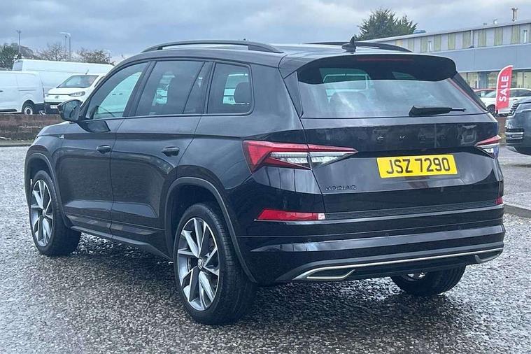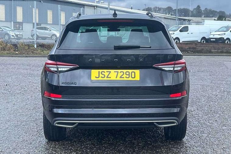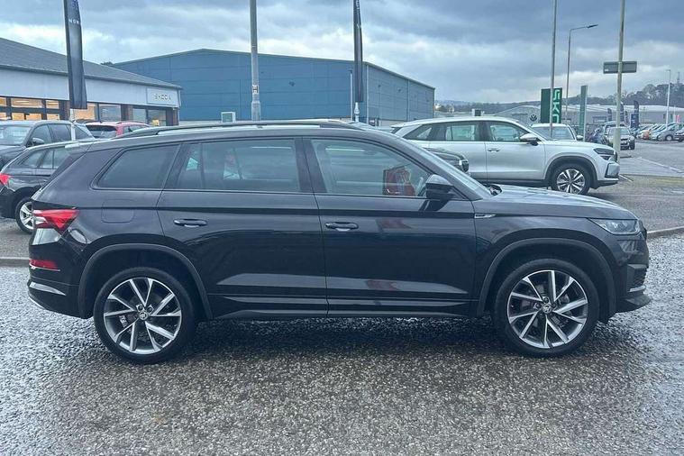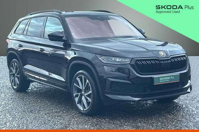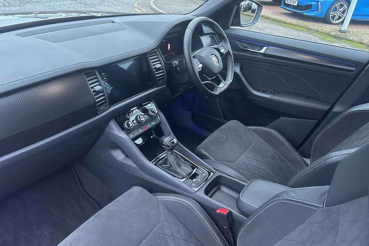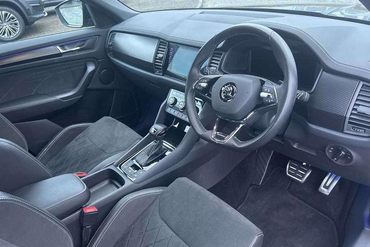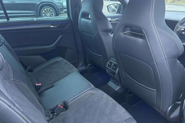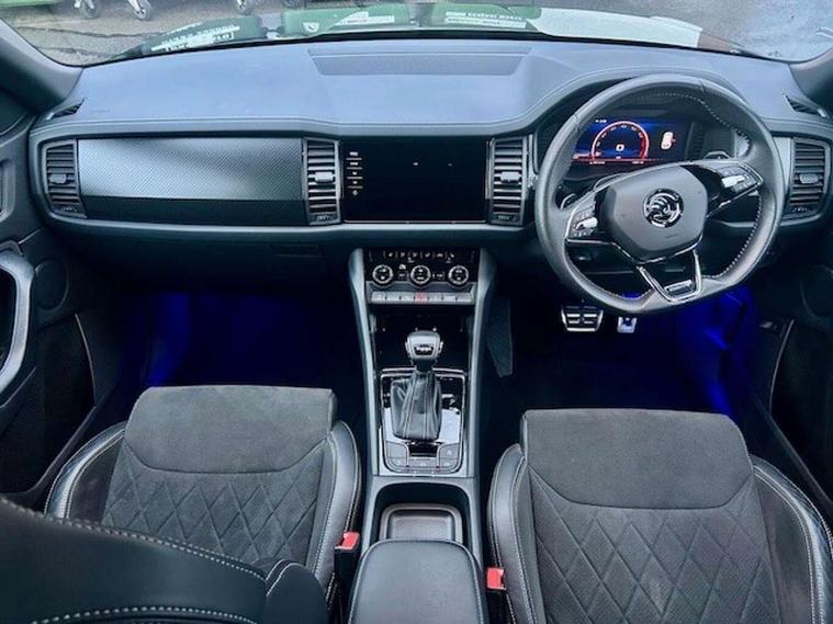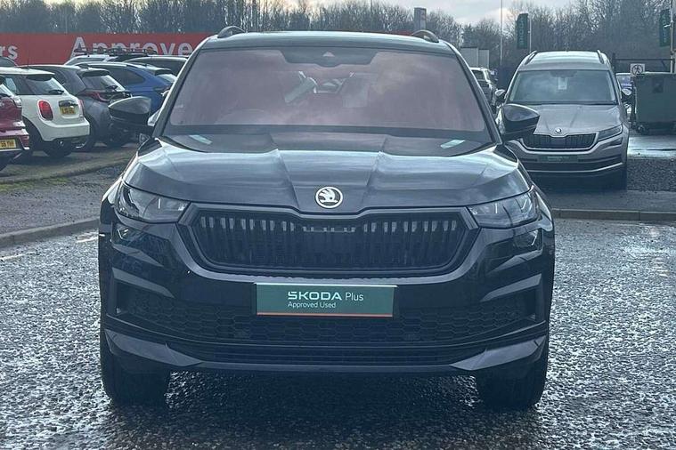 Bluetooth system, Columbus satellite navigation with 9.2" touchscreen, integrated Wi-Fi, web radio, Digital voice enhancement, E-call, ECO Stop/start function, Exterior temperature indicator, Progressive steering, Rear view camera, Smartlink wireless for apple carplay and wired for android auto, Speed limiter, Tailgate unlocking from outside, USB C Port x 2 in front centre console, Wireless charging, 8 Speakers, DAB Digital radio, Aero front windscreen wipers with intermittent function, Aero rear window wiper, Auto dimming rear view mirror, Black roof rails, Black sports styling including front grille and window surrounds, Black wheel arch surrounds, Body colour bumpers, Body colour door handles, Electric adjustable/heated/folding door mirrors, driver side auto dimming with boarding sports and memory function, Electric front and rear windows, Extended rear spoiler with finlets in gloss black, Front fog lights, Full LED matrix headlights with AFS (adaptive front light system), cornering function and AWL (all weather lighting system), Gloss black door mirrors, Headlight washers, Heated rear window, Invisible tailpipe, LED daytime running lights, LED rear fog light, LED third brake light in rear spoiler, Light assistant (coming/leaving home/tunnel light), Off-road style lower front bumper element, Privacy glass, Rain and light sensors, Rear diffuser, Rear LED lights (high functionality) with welcome effect and dynamic indicators, Rear side wing doors, Safety reflectors on front and rear doors, Sportline badge on front fender, Sports front and rear bumpers including lower rear chrome strip, Tailgate lettering in Black, Window control switches with black trim, 12V socket in boot, 2 rails with 2 hooks, 2 seat bench in 3rd row, 3 seat bench in 2nd row, 4 foldable roof handles with rear coat hooks, 60:40 foldable rear seat with sliding adjustment and backrest angle adjustment, Aluminium pedals, Black roof headlining, Bottle holders in door panel in the 1.5 litre front and 1 litre rear, Cargo storage compartments, Chrome headlight control button, Chrome interior door handles, Coat hooks on B pillar, Covered storage compartment on driver side, Front centre armrest with storage compartment, cup holder and 12V socket, Front courtesy lights, Gear shift lever with chrome frame and black gloss insert, Grey stitching in front and rear armrests and door armrests + door inserts, Height adjustable front headrests, Illuminated and cooled glovebox, Illuminated luggage compartment, Isofix child seat fittings in outer rear seats with top tether, Manually adjustable steering column, Microsuede door panels, Net programme in boot (1x horizontal Net, 2x vertical Nets), Overhead glasses storage compartment, Pollen filter, Rear centre armrest with cupholders, Single front passenger seat, Sliding trunk cover, Small Bags on the inner sides of the front backrests, Sports seats, Sunvisors with illuminated vanity mirrors, Three rear height adjustable headrests, Ticket holder on A Pillar, Umbrella in door panel, Variable boot floor, LED Interior light pack - Kodiaq, Auto door release and activation of warning lights in the event of an accident, Child locks on rear doors, Driver and front passenger airbag with knee airbag and front passenger airbag deactivation, Electronic parking brake with hill start assist, Emergency rear braking signal, ESC (incl. ABS+MSR+ASR+EDS+HBA+DSR+RBS+MKB), Front assist with autonomous emergency braking, Front side airbags with curtain airbags, Fuel cut off safety device, Height adjustable front 3 point seatbelts + pretensioners, Hill hold control, Rear disc brakes, Safety vest holder in door, Seat belt reminder for all seats, Three point rear seat belts, Two tone horn, Tyre pressure monitor, Alarm with interior monitoring and tilt sensor with safe function, Anti-theft wheel bolts, Immobiliser, Keyless entry and start system (KESSY), Remote central locking with 2 keys, Black air vent surround, Carbon finish dashboard and door inserts, Grey stitching in dashboard, 20" Vega Anthracite alloy wheels, Temporary spare wheel (space saver),