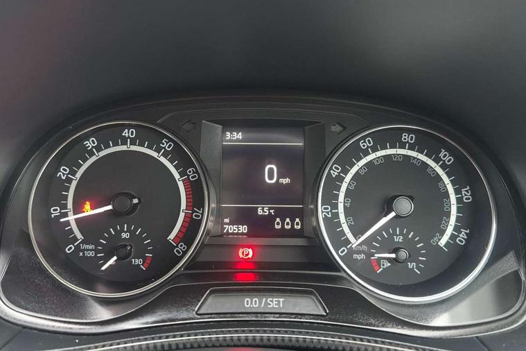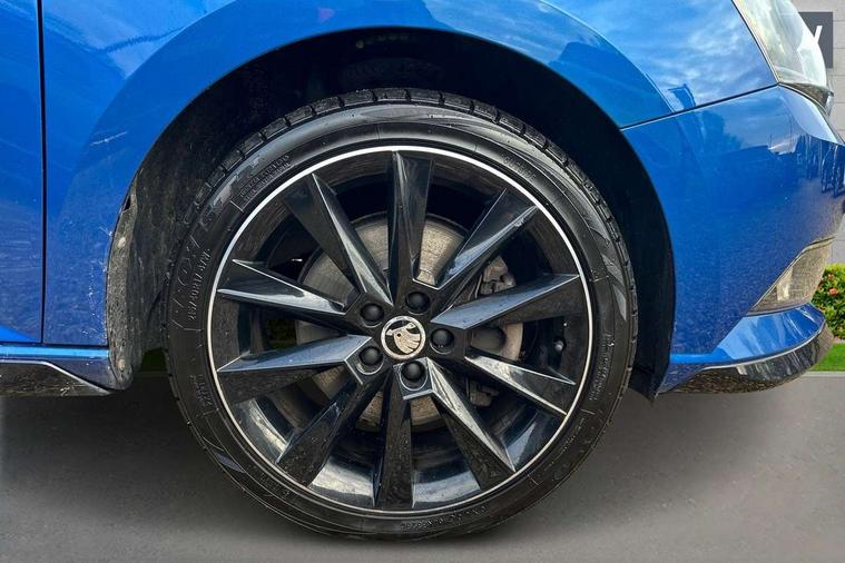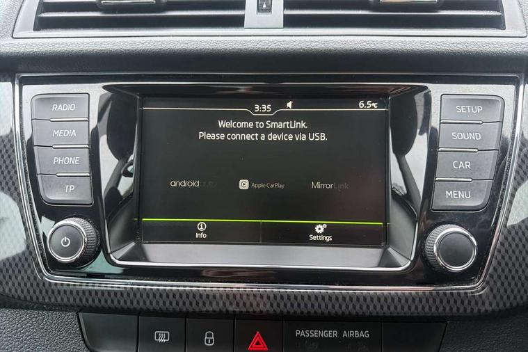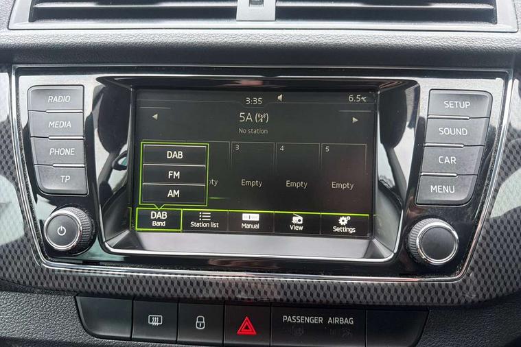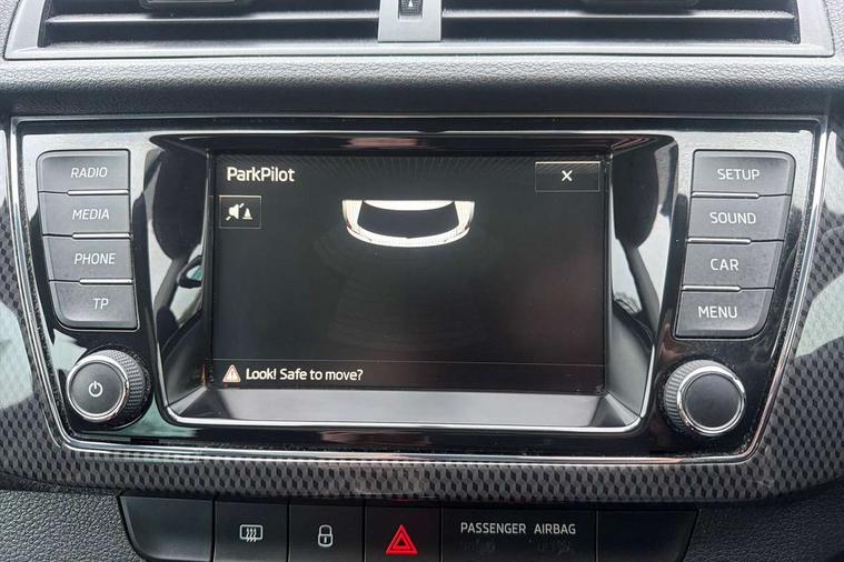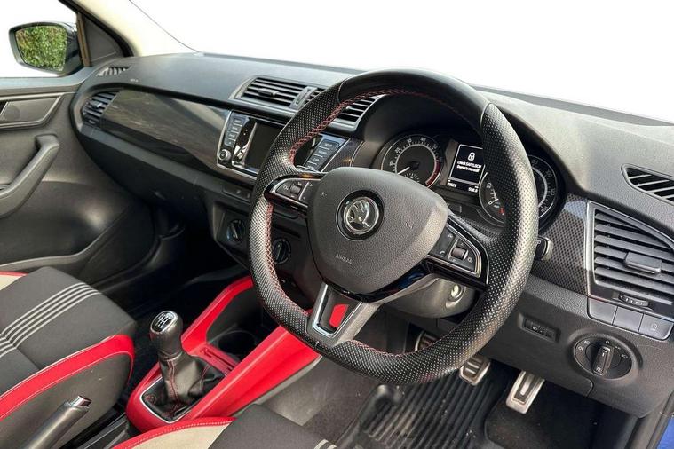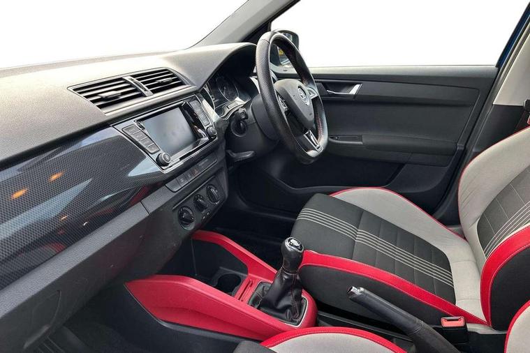 Bluetooth system, Exterior temperature gauge, Front assistant collision mitigation, Maxi dot trip computer, PAS, Service interval indicator, SmartLink, Auxiliary socket for external MP3 player, Bolero radio with telephone control, Mirror Link, USB and SD card, DAB Digital radio, Black door mirrors, Black radiator grille, Body colour bumpers, Body colour door handles, Body coloured rear spoiler, Electric front windows, Electrically adjustable and heated door mirrors, Heated rear window, Height adjustable headlamps, Illuminated door sill inserts, Intermittent rear wash/wipe, LED daytime running lights, Panoramic sunroof, Sunset glass from b-pillar back, Tinted rear windows, Tinted windscreen, 1.5L bottle holder in front door panels, 2 height adjustable rear headrests, 3 spoke leather multifunction sports steering wheel with red stitching, 60/40 split folding rear seat, Boot stowage box, Cargo area storage tray, Cloth upholstery, Driver + passenger vanity mirrors, Floor mats with red stitching, Folding grab handles, Front reading lights, Front sports seats, Height adjustable driver's seat, Height adjustable front headrests, Height adjustable passenger seat, Height/reach adjust steering wheel, Interior light with delay, Leather gearshift, Leather handbrake, Lower glovebox cover, Luggage load hooks, Parcel shelf, Pearl grey carpets, Pearl grey headlining, Pollen filter, Rear courtesy light, Rear storage trays, Storage compartment under front seats, Ticket holder, Two rear outer seat isofix location points, Arkamys surround sound pack - Fabia, Chrome Pack - Fabia, 3x3 point rear seatbelts, ABS, Curtain airbags, Driver and passenger airbags, Driver and passenger side airbags, EDS, ESC with ASR, Front seatbelt pretensioners, Hydraulic Brake Assist (HBA), Passenger airbag deactivate switch, Seatbelt warning, Tyre pressure monitor, Alarm with interior monitoring, Immobiliser, Locking wheel bolts, Remote central locking, Black cube decorative insert,