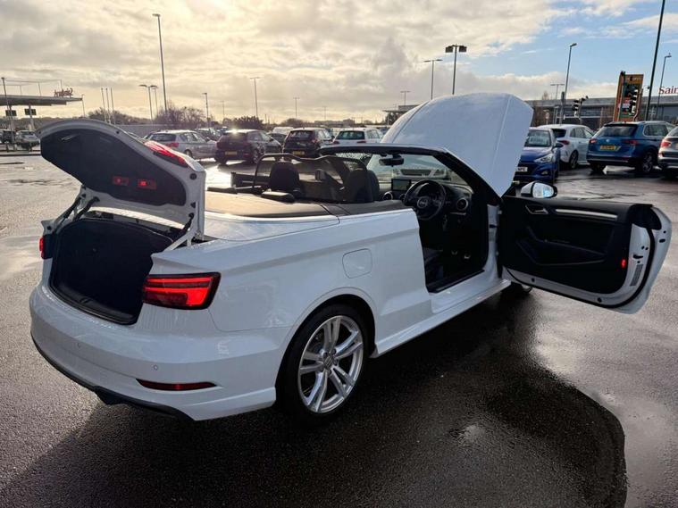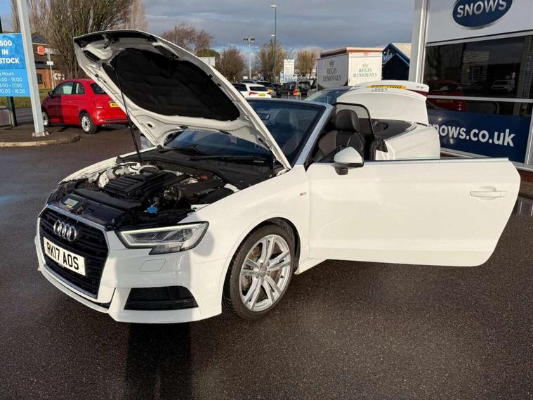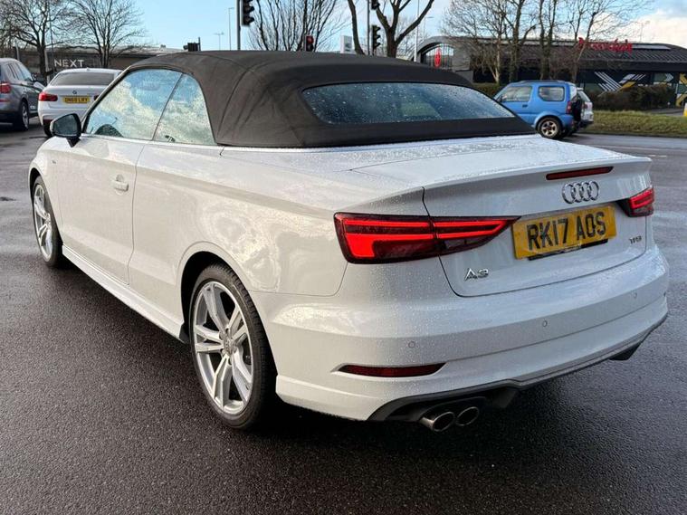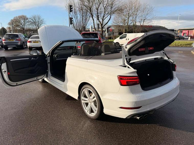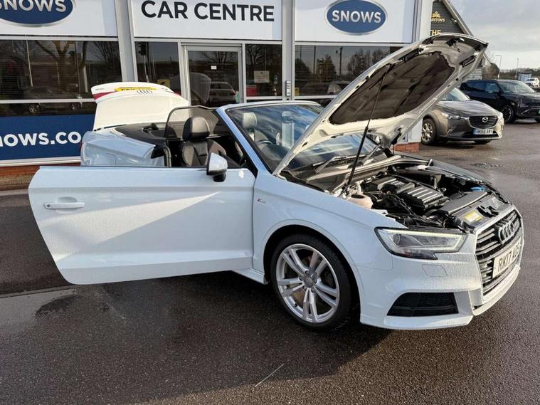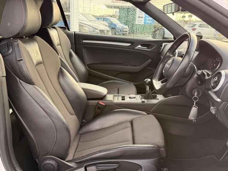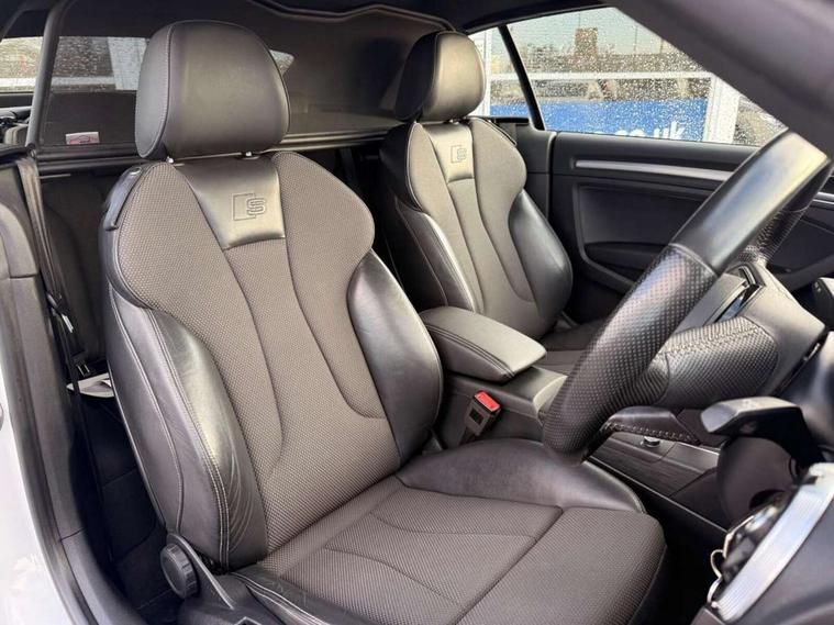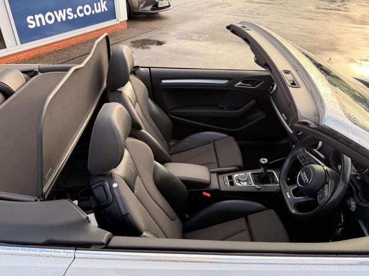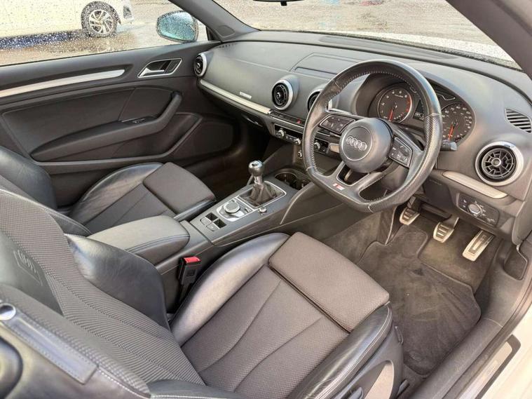 Audi connect, Audi drive select, Audi smartphone interface, Bluetooth interface, Colour driver's information system display, Service interval indicator, 2 USB ports, Audi music interface, DAB Digital radio, Aluminium side window trim, Automatic lights and wipers, Body colour bumpers, Body colour door mirrors with integral indicators, Chrome exhaust tailpipes, Electric operated/heated door mirrors, Front and rear electric windows, Fully automatic acoustic hood, Heated front windscreen, Heated rear window, Heated windscreen washer jets, LED daytime running lights, S Line body styling, 2 height adjustable rear headrests, 3 spoke flat bottomed multi-function leather steering wheel, 4 lashing points to secure luggage, 50/50 split folding rear seat, Adjustable front armrest, Driver/passenger sunvisors, Dual zone electronic climate control, Front/rear floor mats, Height adjustable front seats, Height/reach adjustable steering column, Illuminated door sills, Illuminated glovebox, ISOFIX child seat preparation+airbag deactivation, Jack and tool kit, Perforated leather gearknob, Stainless steel pedals, Storage compartment in centre console, Storage compartments in doors, LED interior light pack - A3/RS3, Light and rain sensor pack - A3 Cabriolet, Storage pack - A3 Cabriolet/Saloon, 3 point seatbelts on all seats, ABS/EBD, Active bonnet, Active front headrests, ASR, Automatic roll over protection, Driver and passenger side airbags, Driver/Front Passenger airbags, Drivers knee airbag, EDL, Electromechanical parking brake, ESC - Electronic Stability Control + traction control, Front passenger airbag deactivation, Seatbelt warning, Tyre pressure monitor, Warning triangle and first aid kit, Anti theft alarm, Anti-theft wheel bolts, Immobiliser, Remote control central locking, Aluminium air vent surrounds, Aluminium trim elements, Space saver spare wheel,