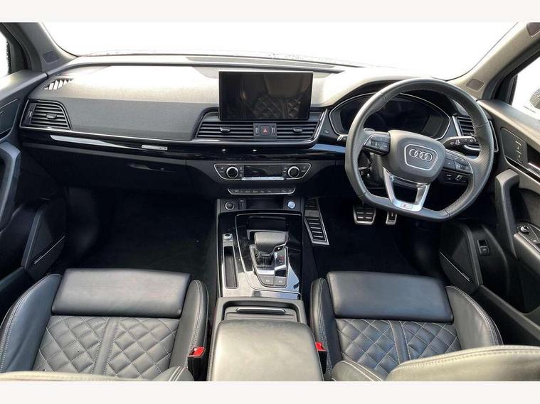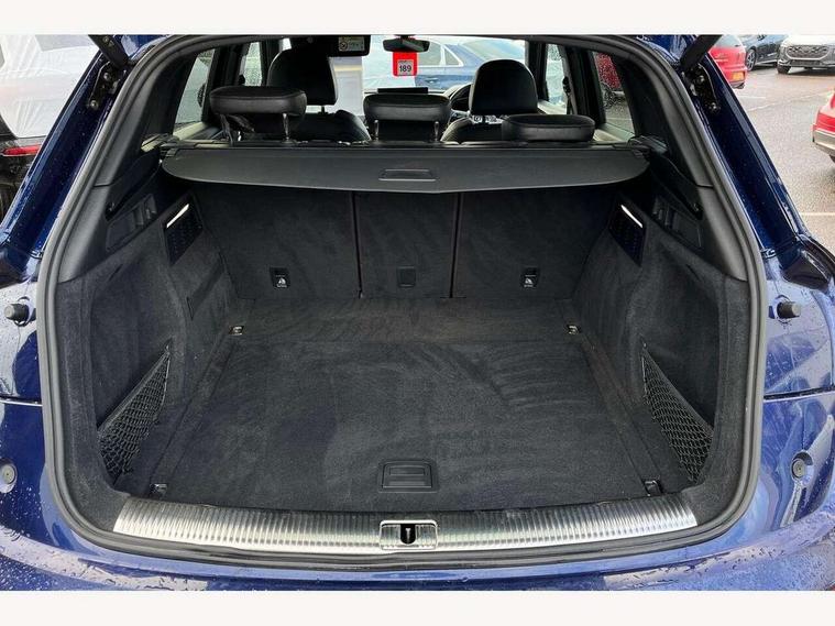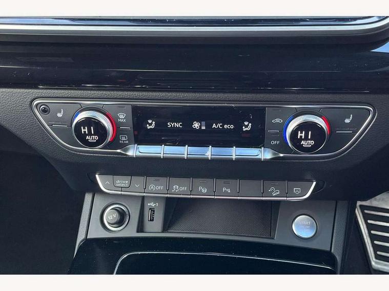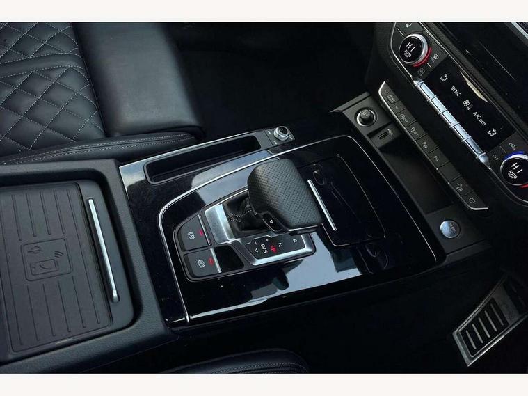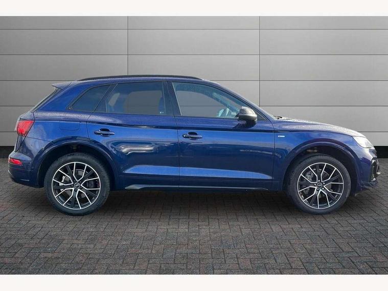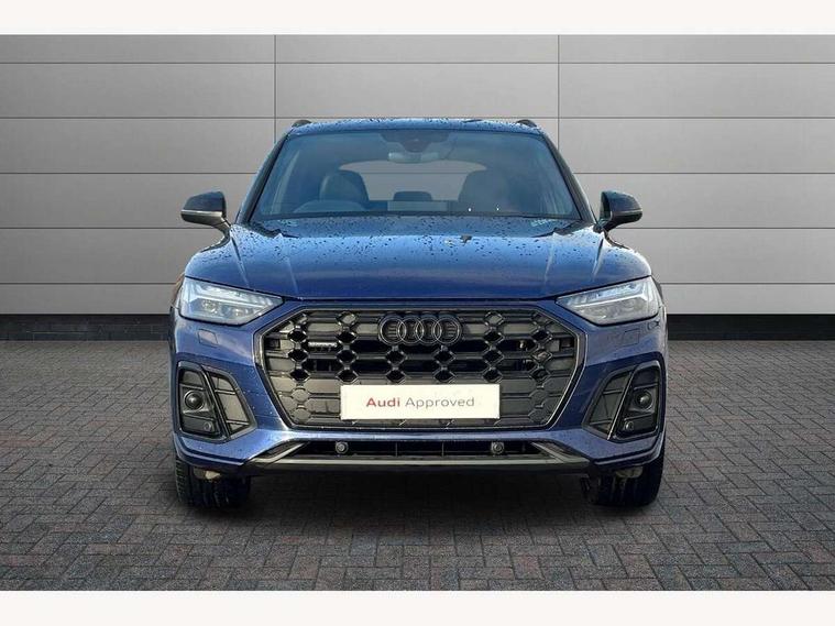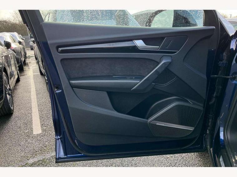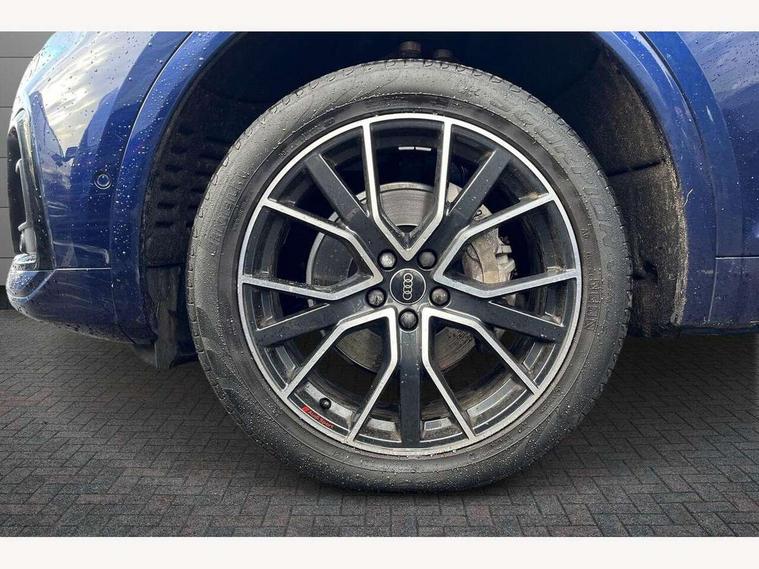 Acoustic front and rear parking sensor, Audi connect safety and service (e-call), Audi drive select, Audi virtual cockpit plus with 12.3" screen and three different layout designs, Audi wireless smartphone interface, Automatic start-stop system with coasting functionality and efficiency programme, Bluetooth interface, Camera based traffic sign recognition, Electro - mechanical power assisted steering, Lane departure warning, MMI navigation plus with 10.1" touch screen, Power tailgate, Reversing camera, Service interval indicator, Voice control system with Audi hotword activation "Hey Audi", Diesel particulate filter, Quattro on demand, S line sports suspension, 2 x USB charging port with aux input socket, 8 loudspeakers, DAB Digital radio, Acoustic windscreen, Auto dimming door mirrors, Auto dimming frameless rear view mirror, Automatic headlight adjustment, Automatic headlights and windscreen wipers, Black roof rails, Black styling with black rings, Body colour bumpers, Body colour rear diffuser with matt aluminium silver surrounds, Body colour underbody protection, Chrome plated exhaust trims, Daytime running lights, Door sills in Selenite silver, Electric adjustable/heated/folding door mirrors, Front air inlet surrounds in aluminium, Front and rear electric windows, Front radiator grille in honeycomb design, LED 3rd brake light, LED headlights and LED tail lights, Loading edge protection in stainless steel, Lower bumpers painted in contrast Manhattan grey, Rear chrome trim strip below lights, Rear privacy glass and rear side windows, Rear side wing doors, Rear wiper, Roof bars, S Line badges on the front wing panels, S Line front and rear bumpers, S Line rear spoiler, S Line side skirts, 3 rear headrests, Black cloth headlining, Comfort front centre armrest, Contrast stitching on seats, steering wheel and gear lever gaiter, Deluxe 3 zone electronic climate control, Front head restraints, Front sport seats with S embossed logo, Front/rear floor mats, Gear lever in black leather, Heated front seats, Height/reach adjustable steering column, Illuminated door sill trims with S logo, Luggage compartment cover, Manual seat adjustment with 4-way electric lumbar support, Single front passenger seat, Stainless steel pedals, Sunvisors with vanity mirrors, Top surface of the rear centre armrest in artificial leather, High gloss pack - Q5, LED interior light pack - Q5, 3 point seatbelts on all seats, 6 airbags - Driver, front passenger, curtain and side airbags, Attention and drowsiness assist, Electrically operated child locks on rear doors, Electromechanical parking brake, Electronic stabilisation control including ABS, ASR and EDL, First aid kit with warning triangle and vests, Front passenger airbag deactivation, Hill descent control, Hill hold assist, ISOFIX child seat mounting for front passenger seat and ISOFIX child seat mounting with Top Tether for outer rear seats, Multi collision brake assist, Pop-up bonnet for pedestrian protection, Pre sense city, Seatbelt monitoring, Tyre pressure warning, Anti theft alarm, Anti-theft wheel bolts, Remote central locking, Remote control key with SAFELOCK and keyless go, Air vents inserts and centre console in gloss black, Tool kit, Tyre repair kit,