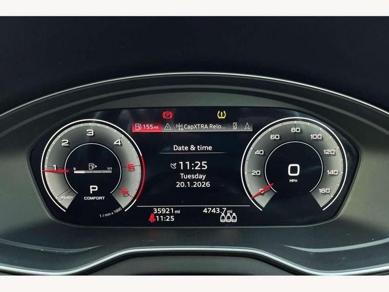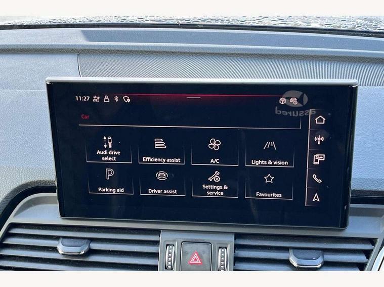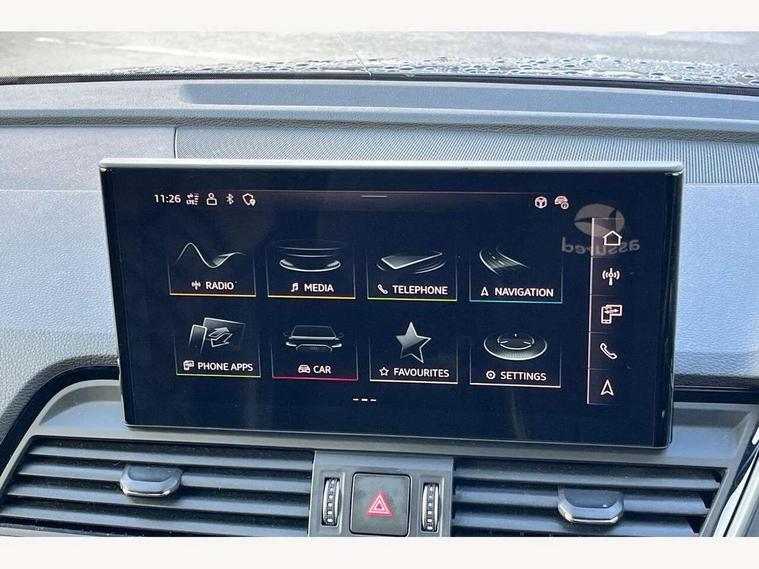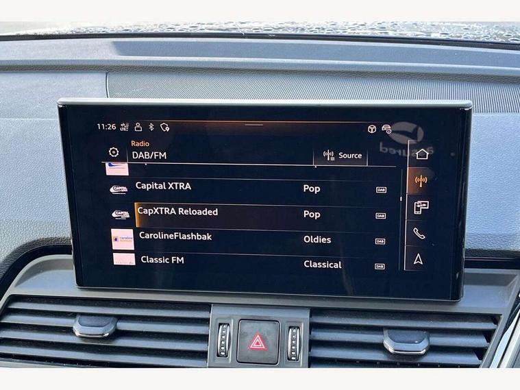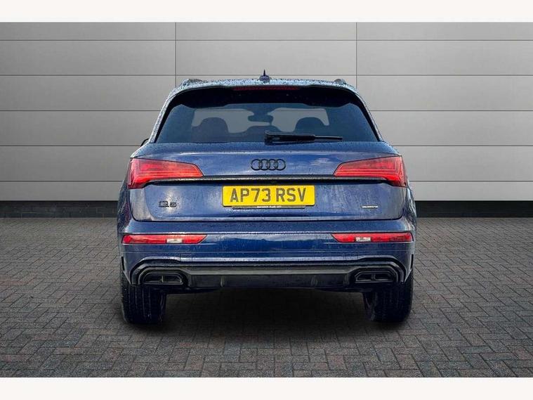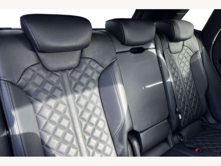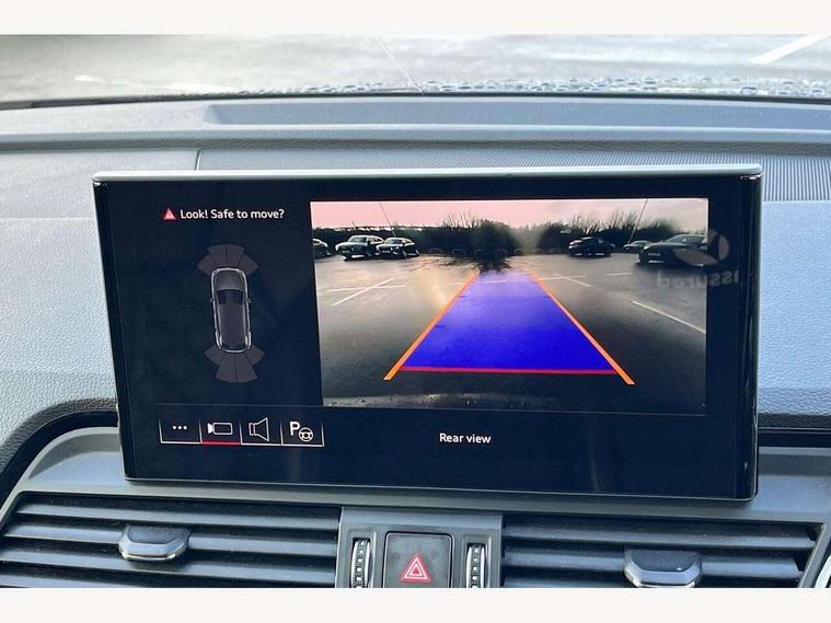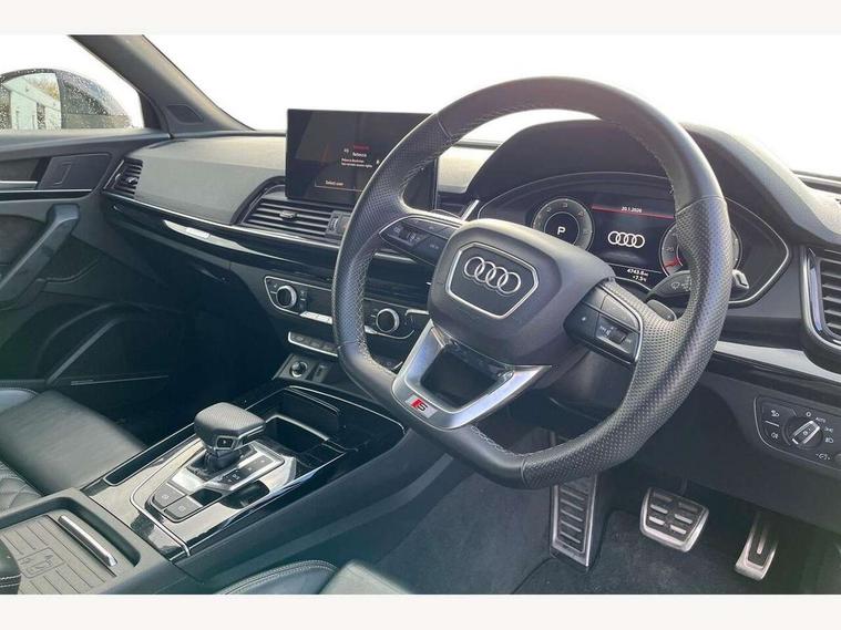 Acoustic front and rear parking sensor, Audi connect safety and service (e-call), Audi drive select, Audi virtual cockpit plus with 12.3" screen and three different layout designs, Audi wireless smartphone interface, Automatic start-stop system with coasting functionality and efficiency programme, Bluetooth interface, Camera based traffic sign recognition, Electro - mechanical power assisted steering, Lane departure warning, MMI navigation plus with 10.1" touch screen, Power tailgate, Reversing camera, Service interval indicator, Voice control system with Audi hotword activation "Hey Audi", Diesel particulate filter, Quattro on demand, S line sports suspension, 2 x USB charging port with aux input socket, 8 loudspeakers, DAB Digital radio, Acoustic windscreen, Auto dimming door mirrors, Auto dimming frameless rear view mirror, Automatic headlight adjustment, Automatic headlights and windscreen wipers, Black roof rails, Black styling with black rings, Body colour bumpers, Body colour rear diffuser with matt aluminium silver surrounds, Body colour underbody protection, Chrome plated exhaust trims, Daytime running lights, Door sills in Selenite silver, Electric adjustable/heated/folding door mirrors, Front air inlet surrounds in aluminium, Front and rear electric windows, Front radiator grille in honeycomb design, LED 3rd brake light, LED headlights and LED tail lights, Loading edge protection in stainless steel, Lower bumpers painted in contrast Manhattan grey, Rear chrome trim strip below lights, Rear privacy glass and rear side windows, Rear side wing doors, Rear wiper, Roof bars, S Line badges on the front wing panels, S Line front and rear bumpers, S Line rear spoiler, S Line side skirts, 3 rear headrests, Black cloth headlining, Comfort front centre armrest, Contrast stitching on seats, steering wheel and gear lever gaiter, Deluxe 3 zone electronic climate control, Front head restraints, Front sport seats with S embossed logo, Front/rear floor mats, Gear lever in black leather, Heated front seats, Height/reach adjustable steering column, Illuminated door sill trims with S logo, Luggage compartment cover, Manual seat adjustment with 4-way electric lumbar support, Single front passenger seat, Stainless steel pedals, Sunvisors with vanity mirrors, Top surface of the rear centre armrest in artificial leather, High gloss pack - Q5, LED interior light pack - Q5, 3 point seatbelts on all seats, 6 airbags - Driver, front passenger, curtain and side airbags, Attention and drowsiness assist, Electrically operated child locks on rear doors, Electromechanical parking brake, Electronic stabilisation control including ABS, ASR and EDL, First aid kit with warning triangle and vests, Front passenger airbag deactivation, Hill descent control, Hill hold assist, ISOFIX child seat mounting for front passenger seat and ISOFIX child seat mounting with Top Tether for outer rear seats, Multi collision brake assist, Pop-up bonnet for pedestrian protection, Pre sense city, Seatbelt monitoring, Tyre pressure warning, Anti theft alarm, Anti-theft wheel bolts, Remote central locking, Remote control key with SAFELOCK and keyless go, Air vents inserts and centre console in gloss black, Tool kit, Tyre repair kit,
