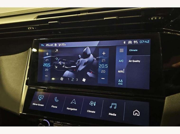 Bluetooth telephone facility, Compact drive selector, Driver attention warning, Emergency call service, Exterior temperature indicator with ice warning, Front and rear parking sensors, Intelligent speed adaptation, Lane keep assist, Mirror screen with wireless apple carplay and android auto, Multi driving mode selector - Eco / Normal / Sport mode selector, Multi function trip computer, Peugeot connect advanced with connected 3D navigation, Peugeot connect SOS and assistance, PEUGEOT i-Cockpit - compact steering wheel, 10" HD colour touchscreen with configurable 3D headup instrument panel, Service interval indicator, Speed limit recognition and recommendation, Sport pedals with foot rest, DAB Digital radio, Peugeot customisable iToggles, Voice recognition for radio, navigation and telephony features, 2 X LED rear number plate lights, Acoustic and tinted windscreen, Acoustic laminated front side windows, Automatic hazard light activation upon heavy brake application, Automatic triggered rear windscreen wiper in reverse gear, Bi-tone roof rails, Body colour door handles, Body colour rear roof spoiler, Dark chrome chequered radiator grille, Dark tinted rear side and tailgate windows, Electric operated/heated door mirrors, Extended lower body sills to the front and side, Frameless electrochrome rear view mirror, Front and rear electric windows with one touch/anti pinch, Full LED matrix headlights with automatic adjustment, Gloss black finish B pillar, Gloss black rear cluster connecting strip, GT model designation badging on tailgate, High beam assist, LED 3rd brake light, LED side indicator lights integrated into door mirrors, Lion emblem badging on front wings, Model designation badges on front and rear, Nera black door mirrors, Peugeot aluminium door sills, Peugeot signature LED daytime running lights, Power folding door mirrors, Rear full LED 3D Peugeot new claw effect lights with sequential welcome sequence upon unlocking the vehicle, Rear lower bumper gloss black diffuser effect trim, Rear reversing lights, Rear side wing doors, Tailgate with heated rear windscreen and wiper blade, Twin exhaust pipes with chrome surround, 12V socket, 2 front USB socket including 1 USB type c, 3 seat bench in 2nd row, 40/20/40 flat folding rear seats, 8 Colour personalisable ambient lighting, Automatic air conditioning with AQS 3, Carpet mats, Central front armrest with storage compartment, Dynamic front seats, Electric power steering with reach and rake adjustable steering column, Front central console with two cup holders, LED Glovebox light, Manual driving mode - change gear manually via steering mounted paddles, Multifunction full grain leather steering wheel with admite green stitching & GT badging, Piano keys gloss black plated toggle switches to access main functions of the vehicle, Rear centre armrest with cupholders, Roof lining - Mistral black, Seatbelt unfastened on the move audible and visual alert for front and rear seats, Single front passenger seat, Sunvisor with concealable mirrors and LED lighting, Twin USB charging ports in the rear (Type C), Two position boot floor, Driver sport pack with sports power steering - 308, Visibility pack with automatic magic wash windscreen wipers - 308, 2x Isofix child seat fitting on outer rear seats, 3x Rear three-point retractable seatbelts with force limiters in the outer rear seats, ABS + EBD + EBA, Active safety brake with night function/cyclists/pedestrians, Adaptive driver and front passenger airbags with passenger airbag deactivation function, Automatic post collision braking, Child locks on rear doors, Driver/front passenger side airbags, Electronic parking brake, ESP, Front and rear curtain airbags, Front optimised safety headrests and rear retractable headrests (x3), height adjustable, Front three point retractable seatbelts with force limiters, Front/rear disc brakes, Hill start assist, Tyre pressure sensor, Automatic door locking when moving off, Deadlocking system, Electronic code immobiliser, Locking wheel nuts, PEUGEOT Open and Go keyless entry system, Thatcham cat. 1 alarm with anti lift sensor, Tyre repair kit,