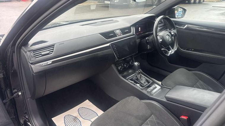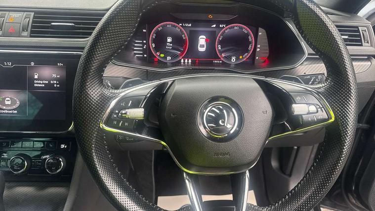 Bluetooth system, CareConnect and Emergency Call, Columbus HDD satellite 3D map navigation with 9.2" colour touch screen, web radio, integrated Wi-Fi, Driver fatigue sensor, Front assist with pedestrian protection, Progressive dynamic steering, Stop/start engine system and energy recovery, Virtual cockpit, Voice control system, Wireless smartlink apple carplay, SmartLink+ android auto, XDS+, 2 USB ports, Bolero radio with 8" touchscreen display, DAB Digital radio, 3rd brake light, Aero front windscreen wipers with intermittent function, Auto dimming rear view mirror, Black rear badge, Body colour door handles, Cornering front fog lights, Electrically adjustable heated and folding door mirrors with memory function, Front and rear electric windows, Full matrix LED headlights with AFS LED DRL integrated with headlight washer LED rear lights(High function), dynamic indicators and lighting animation, Gloss black exterior door mirrors with sports styling including front grill, side strip and window surrounds, Gloss black grille surround with gloss black rib elements, Gloss black rear spoiler (roof), Gloss black strip between rear lights, Light assistant (coming/leaving home/tunnel light), Privacy glass, Rain sensor, Rear exhaust diffuser styling elements, Rear side wing doors, Sportline badging, 12v power point in centre console, 3 seat bench in 2nd row, Black roof headlining, Black textile floor mats, Carbon optic interior elements, Electric auxiliary air heater, Front and rear footwell illumination, Front armrest with storage box, Height adjustable front and rear head restraints, Ice scraper, Illuminated and cooled glovebox, Interior lights with control switches, Isofix child seat fittings on outer rear seats, LED front and rear reading lights, Microsuede/leather upholstery with silver diamond stitching sports seats, One umbrella compartments in driver door with one umbrella in drivers door, Overhead glasses storage compartment, Rear centre armrest with cupholders, Removable parcel shelf, Single front passenger seat, Split folding rear seats, Storage compartment with cover in luggage compartment side panels, Ticket holder on A Pillar, LED package plus - Superb, 3 rear seatbelts, 7 airbags - Front, front side, curtain, driver's knee airbag with front passenger deactivation switch, Driver and passenger seatbelts with warning light, Electronic parking brake, ESC including ABS, EBV, MSR, ASR, EDS, HBA, DSR, RBS, CBC, multi-collision brake (MKB) and Auto hold, Hill start assist, Power operated child lock in rear doors, Tyre pressure monitor, Alarm with interior monitoring tilt sensor and back up horn, Electronic engine immobiliser, Keyless entry and start/stop, Remote central locking with SAFE system, Third remote key,