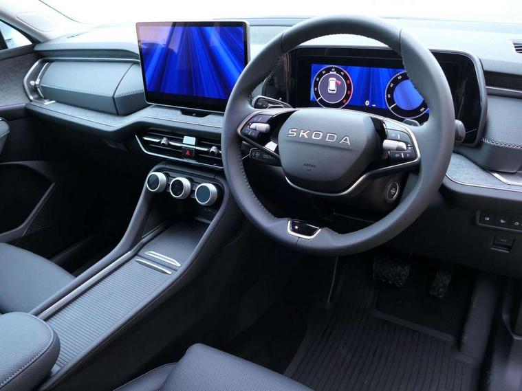 13" satellite navigation touchscreen display, Blind spot detection with door exit warning, Bluetooth system, ChatGPT functionality, Driver alert - Fatigue and drowsiness monitor, Dry display cleaner, Emergency call, Front and rear parking sensors, Front cross traffic assist, Lane assist, PAS, Rear traffic assist, Tailgate unlocking from outside, Traffic sign recognition, USB C Port x 2 in front centre console, Virtual Cockpit - 10.25" digital display, Voice control system, Wireless charging for two smartphones (15W) with cooling function, Wireless SmartLink for Apple CarPlay and Android Auto, Stop/start function, 2x USB-C in the rear, DAB Digital radio, Aero front windscreen wipers with intermittent function, Auto dimming rear view mirror, AWL (all weather lighting) and all weather light with cornering function, Black wheel arch surrounds, Body colour bumpers, Body colour door mirrors and handles, Cornering light and poor weather light, Electric folding /adjustable/separted heated/folding door mirrors, auto dimming with boarding sports and memory function, Electric front and rear windows, Exterior black decorative trims, Front grille with horizontal light strip, Heat insulating glass in windshield, Heated rear window, Ice scraper in fuel tank cap, Invisible tailpipe, LED daytime running lights, LED matrix headlights with AFS and LED fog lights, LED rear light with welcome effect and dynamic turn signals, LED third brake light in rear spoiler, Light assistant with automatic headlight control and coming home feature, Logo projection in door mirrors, Multiple matrix beam, Privacy glass, Rear roof spoiler, Rear side wing doors, Rear window wiper, Red decorative strip between rear LED lights, Safety reflectors on front and rear doors, Unique dark chrome design logo on alloy wheels, Window control switches with black trim, Windscreen wipers with rain sensor, Without engine designation, 1.5l bottle holder points in all door, 1x centre rear reading light, 2 seat bench in 3rd row, 2 spoke multi-function leather heated steering wheel with paddle shift, 3 configurable smart dials with 32mm coloured display, 3 seat bench in 2nd row, 4 foldable roof handles with rear coat hooks, Ambient interior lighting - Dashboard, front-door stowage compartments, front and rear door panels and footwell lighting, Automatic gear selector on steering column, Chrome interior door handles, Driver/front passenger reading lights, Fabric headlining, Fixed bench 40:60:40 split folding backrests, Front and rear floor mats, Front centre armrest with jumbo box storage compartment, cup holder and 12V socket, Height adjustable front headrests, Isofix child seat fittings in outer middle row rear seats and front passenger with top tether, Manually adjustable steering column, Pollen filter, Rear centre armrest with cupholders, Rear seat boot backrest release, Single front passenger seat, Skoda lettering on steering wheel, Storage pocket including mobile phone pockets on the backs of the front seats, Sunvisors with illuminated vanity mirrors, Three rear height adjustable headrests, Ticket holder on A Pillar, Tri zone climate control, Umbrella in door panel x1 made from sustainable materials, Upper and lower glovebox with card holder and coin compartment, USB C port by rear view mirror for charging only (15W), Exterior styling pack - Kodiaq, Auto door release and activation of warning lights in the event of an accident, Driver and front passenger airbag with knee airbag and front passenger airbag deactivation, Electric child locks, Electronic parking brake, ESC (incl. ABS+EMD+MSR+ASR+EDL+HBA+DSR+RBS+ESBS+MCB+TSA+XDS), Front assist with braking reaction to vehicles, pedestrians and cyclists, Front disc brakes, Fuel cut off safety device, Height adjustable front 3 point seatbelts + pretensioners, Hill hold assist, Junction assist with automatic emergency braking, Rear disc brakes, Safety vest holder in door, Seat belt reminder for all seats, Three point rear seat belts, Two tone horn, Tyre pressure monitor, Anti-theft wheel bolts, Immobiliser, Remote central locking with 2 keys,