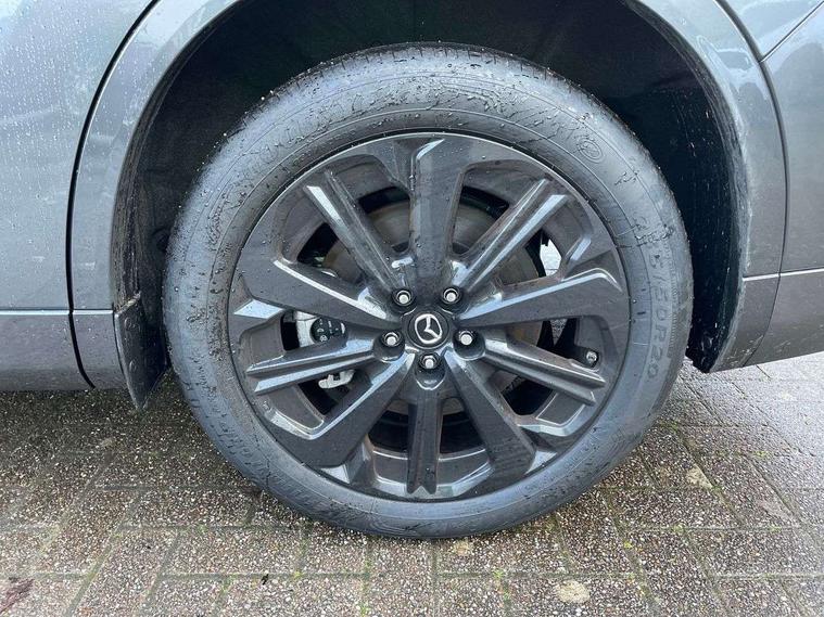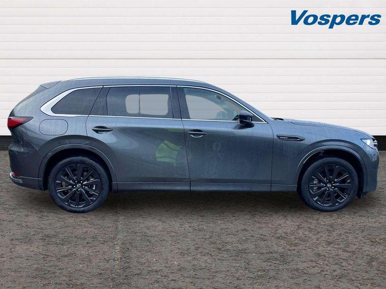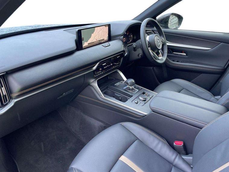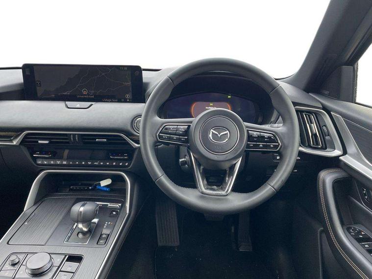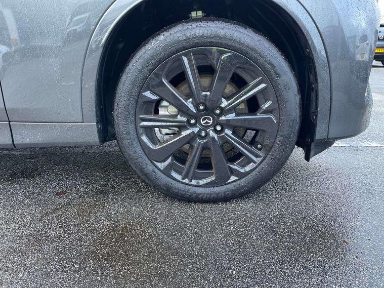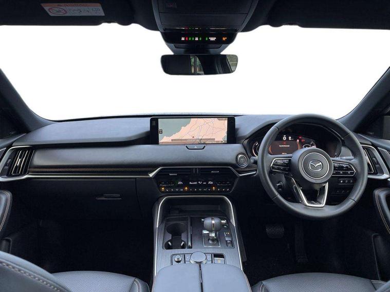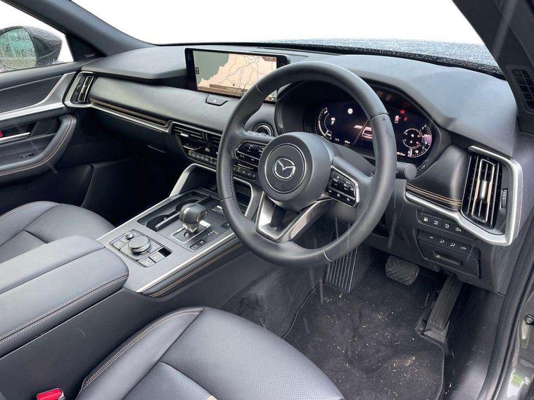 Emergency lane keeping with blind spot assist, Low washer fluid warning light, 12.3" Colour entertainment centre display with mazda connect infotainment, 12.3" TFT Colour display, Adjustable speed limiter, Blind spot assist, Blind spot monitoring with rear cross traffic alert, Cruise control, Distance alert system, Driver attention alert system, Driver Monitoring with personal identification, E-call with GPS, Emergency stop signalling system, Exit warning function, Front and rear parking sensors, Ingress / Egress support and automatic driver position guide, Integrated bluetooth, Intelligent speed assist, Kinematic posture control, Lane keep assist system (LAS) with Lane departure warning system (LDWS), Mazda Driver Personalisation System, Mazda Navigation System with european mapping, Multimedia Commander, PAS, Power lift gate with handsfree function, Power start/stop button, Reversing camera with static guide lines, Speed alert, Traffic sign recognition enhanced with mandated excessive speed warning, Trip computer, Windscreen projected colour active driving display, Wireless apple car play/android Auto, Type 2 Mode 2 cable for AC charging via UK 3-pin plug, 7.2 kw On board Charger, Internal Combustion Engine Sound Emulator, Mi-Drive (Normal, Sport, Off-road, Towing and EV mode), Paddle shift, Type 2 Mode 3 cable for AC charging via home or public charge points, AM/FM and DAB radio, Bose surround sound system with 12 Speaker, Bose center point, Bass match and audio pilot technology, Steering wheel mounted audio/bluetooth controls, USB-C inputs (x2 front and x2 rear), Auto dimming driver's door mirror, Automatic headlight levelling, B-pillar and C-pillar garnishes in piano black finish, Body colour roof spoiler, Body coloured bumpers, Body coloured wheel arch and side mouldings, Coming/leaving home lighting function, Dark plated headlight lense, Dark plating finish signature wing in front grille, Dark plating front side garnish, Differentiated front bumper design to accentuate the intake, Dusk sensing headlights, Electric front/rear windows with one touch auto up/down, Electrically adjustable, heated auto power folding door mirrors with memory, Frameless auto dimming interior rear view mirror, Front kodo turn signal, Front wiper de-icer, Gloss black door mirrors, Headlight washers, High beam control, LED 3rd brake light, LED headlamps, LED rear signature combination lamps, Piano black honeycomb style front grille, Rain sensing front wipers with adjustable sensitivity and speed, Rear side wing doors, Rear wiper, Signature LED daytime running lights, Silver decoration panel, 12v power outlet - front, 12V socket in boot, 2 seat bench in 3rd row, 3 height adjustable rear headrests, 3 seat bench featuring folding centre armrest equipped with two cup holders 2nd row, 3 seat bench in 2nd row, 50/50 split folding 3rd row rear seats, 60/40 split folding 2nd row rear seats, Ambient lighting, Black roof lining, Cargo net, Door panel trim - Cordovan-like Vinyl leather with matt black hairline film inlay, Driver and front passenger two rear grab handles with rear coat hooks, Driver and front passenger visors with covered vanity mirror and driver ticket holder, Driver seat electric tilt, slide, recline, height and lumbar adjustment, Driver, front passenger and two rear door pockets, Driver/passenger front seatback pockets, Electric telescopic and tilt adjustment steering wheel, Front centre storage with illumination and two cupholders, Front down lamp with front and rear foot lamps, Front headrests, Front passengers seat electric slide, recline, height and lumbar adjustment, Front seat ventilation with 3-stage setting, Glovebox illumination, Heated front seats with 3 stage setting, Heated leather wrapped steering wheel, Heated outer rear seats with 3-stage setting, ISOFIX child seat anchorage points attached on outer rear seats, Leather wrapped gear shift knob, LED illumination luggage compartment, Nappa leather upholstery, Practical and spacious front centre armrest storage, Rear seat recline function for rear passenger comfort, Remote fold down rear seats, Remote pre-heating/cooling, Roof mounted sunglasses holder, Single front passenger seat, Three zone climate control air conditioning with rear air vents for 2nd and 3rd row, 3 point ELR front seat belts x2 with pretensioners, 3 point ELR rear seat belts, Active bonnet, Anti-lock braking system (ABS), Drivers knee airbag, DSC - Dynamic Stability Control, Electronic parking brake with auto disengage function and auto hold function, Front and rear curtain airbags, Front dual stage driver and single stage front passenger airbags, Front passenger airbag cut-off switch, Front side airbags, Front smart city brake support, Hill decent control, Hill launch assist, Manual rear child locks, Seatbelt reminder for driver/front passenger and rear seats, Traction control, Tyre pressure monitoring system (TPMS), Remote central locking with deadlocking and automatic door lock when driving, Smart keyless entry, Thatcham accredited alarm and immobiliser, Dashboard panel - Cordovan-like vinyl leather, Mesh metal film centre console panel, 20" Black metallic alloy wheels, Emergency tyre repair kit,