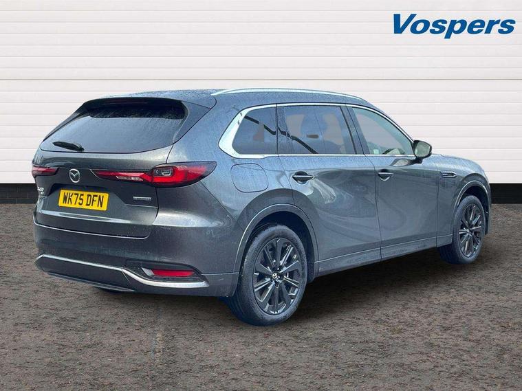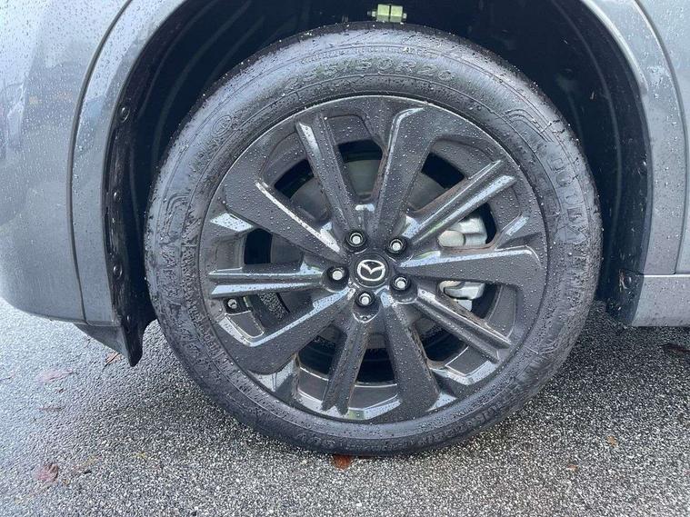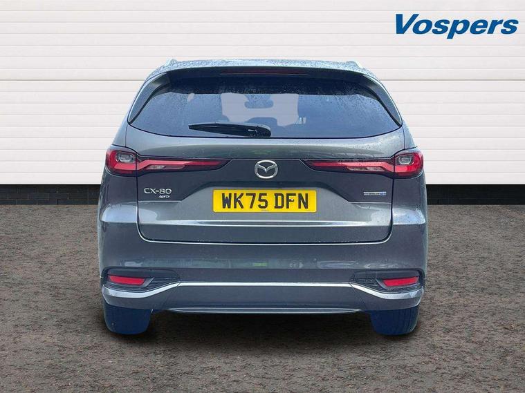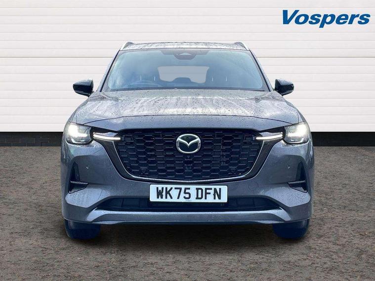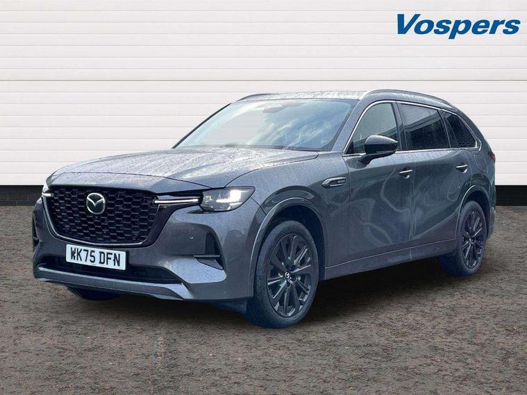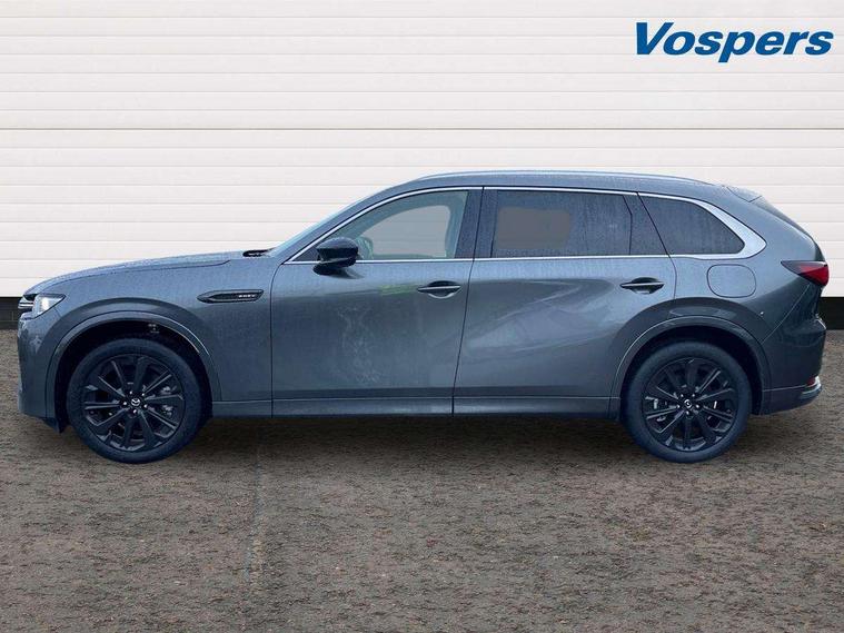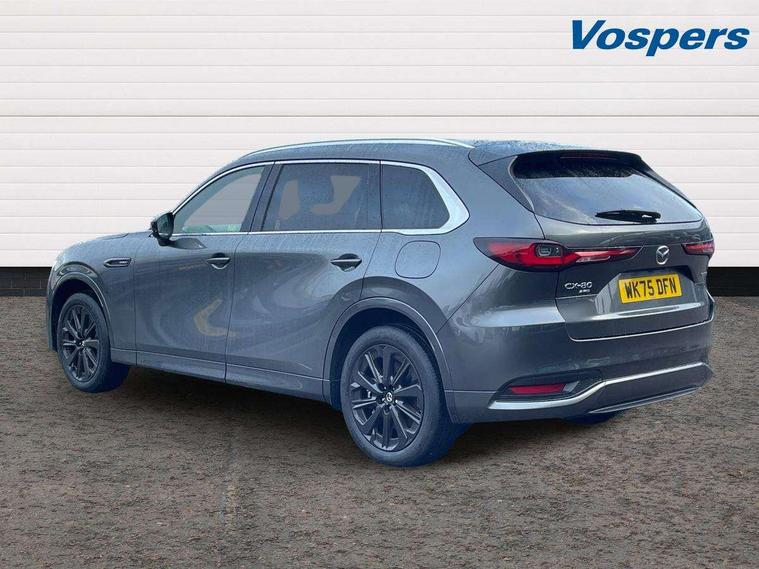 Emergency lane keeping with blind spot assist, Low washer fluid warning light, 12.3" Colour entertainment centre display with mazda connect infotainment, 12.3" TFT Colour display, Adjustable speed limiter, Blind spot assist, Blind spot monitoring with rear cross traffic alert, Cruise control, Distance alert system, Driver attention alert system, Driver Monitoring with personal identification, E-call with GPS, Emergency stop signalling system, Exit warning function, Front and rear parking sensors, Ingress / Egress support and automatic driver position guide, Integrated bluetooth, Intelligent speed assist, Kinematic posture control, Lane keep assist system (LAS) with Lane departure warning system (LDWS), Mazda Driver Personalisation System, Mazda Navigation System with european mapping, Multimedia Commander, PAS, Power lift gate with handsfree function, Power start/stop button, Reversing camera with static guide lines, Speed alert, Traffic sign recognition enhanced with mandated excessive speed warning, Trip computer, Windscreen projected colour active driving display, Wireless apple car play/android Auto, Type 2 Mode 2 cable for AC charging via UK 3-pin plug, 7.2 kw On board Charger, Internal Combustion Engine Sound Emulator, Mi-Drive (Normal, Sport, Off-road, Towing and EV mode), Paddle shift, Type 2 Mode 3 cable for AC charging via home or public charge points, AM/FM and DAB radio, Bose surround sound system with 12 Speaker, Bose center point, Bass match and audio pilot technology, Steering wheel mounted audio/bluetooth controls, USB-C inputs (x2 front and x2 rear), Auto dimming driver's door mirror, Automatic headlight levelling, B-pillar and C-pillar garnishes in piano black finish, Body colour roof spoiler, Body coloured bumpers, Body coloured wheel arch and side mouldings, Coming/leaving home lighting function, Dark plated headlight lense, Dark plating finish signature wing in front grille, Dark plating front side garnish, Differentiated front bumper design to accentuate the intake, Dusk sensing headlights, Electric front/rear windows with one touch auto up/down, Electrically adjustable, heated auto power folding door mirrors with memory, Frameless auto dimming interior rear view mirror, Front kodo turn signal, Front wiper de-icer, Gloss black door mirrors, Headlight washers, High beam control, LED 3rd brake light, LED headlamps, LED rear signature combination lamps, Piano black honeycomb style front grille, Rain sensing front wipers with adjustable sensitivity and speed, Rear side wing doors, Rear wiper, Signature LED daytime running lights, Silver decoration panel, 12v power outlet - front, 12V socket in boot, 2 seat bench in 3rd row, 3 height adjustable rear headrests, 3 seat bench featuring folding centre armrest equipped with two cup holders 2nd row, 3 seat bench in 2nd row, 50/50 split folding 3rd row rear seats, 60/40 split folding 2nd row rear seats, Ambient lighting, Black roof lining, Cargo net, Door panel trim - Cordovan-like Vinyl leather with matt black hairline film inlay, Driver and front passenger two rear grab handles with rear coat hooks, Driver and front passenger visors with covered vanity mirror and driver ticket holder, Driver seat electric tilt, slide, recline, height and lumbar adjustment, Driver, front passenger and two rear door pockets, Driver/passenger front seatback pockets, Electric telescopic and tilt adjustment steering wheel, Front centre storage with illumination and two cupholders, Front down lamp with front and rear foot lamps, Front headrests, Front passengers seat electric slide, recline, height and lumbar adjustment, Front seat ventilation with 3-stage setting, Glovebox illumination, Heated front seats with 3 stage setting, Heated leather wrapped steering wheel, Heated outer rear seats with 3-stage setting, ISOFIX child seat anchorage points attached on outer rear seats, Leather wrapped gear shift knob, LED illumination luggage compartment, Nappa leather upholstery, Practical and spacious front centre armrest storage, Rear seat recline function for rear passenger comfort, Remote fold down rear seats, Remote pre-heating/cooling, Roof mounted sunglasses holder, Single front passenger seat, Three zone climate control air conditioning with rear air vents for 2nd and 3rd row, 3 point ELR front seat belts x2 with pretensioners, 3 point ELR rear seat belts, Active bonnet, Anti-lock braking system (ABS), Drivers knee airbag, DSC - Dynamic Stability Control, Electronic parking brake with auto disengage function and auto hold function, Front and rear curtain airbags, Front dual stage driver and single stage front passenger airbags, Front passenger airbag cut-off switch, Front side airbags, Front smart city brake support, Hill decent control, Hill launch assist, Manual rear child locks, Seatbelt reminder for driver/front passenger and rear seats, Traction control, Tyre pressure monitoring system (TPMS), Remote central locking with deadlocking and automatic door lock when driving, Smart keyless entry, Thatcham accredited alarm and immobiliser, Dashboard panel - Cordovan-like vinyl leather, Mesh metal film centre console panel, 20" Black metallic alloy wheels, Emergency tyre repair kit,